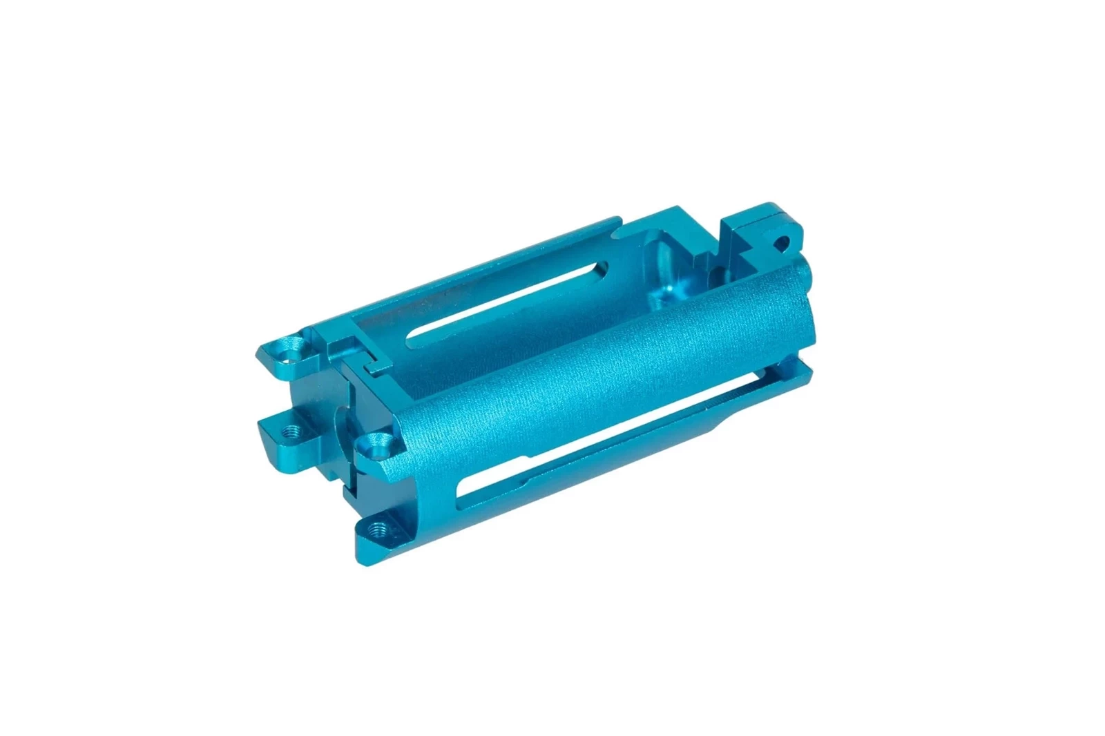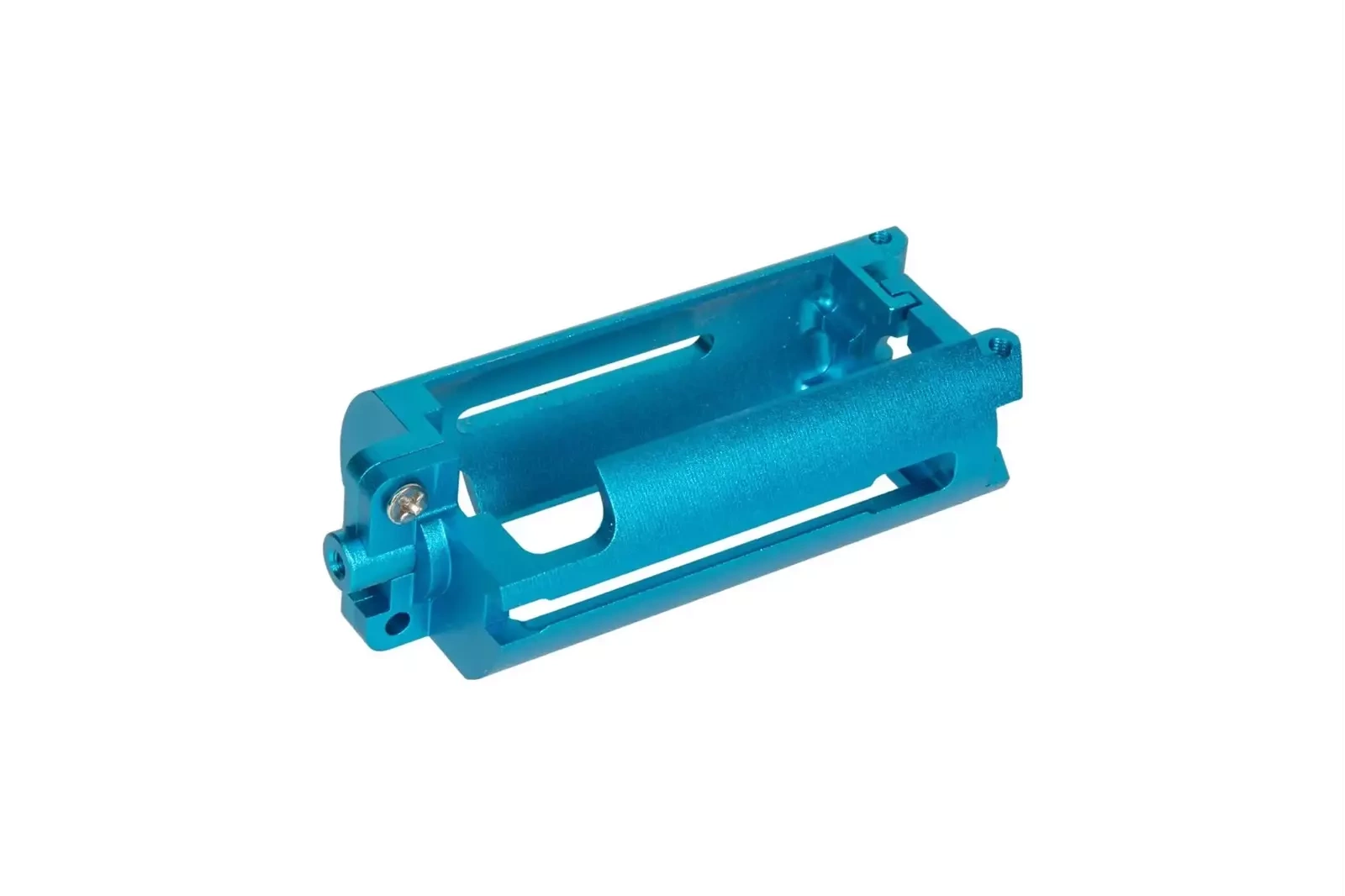Wykonany z aluminium koszyk silnika do replik typu AK. W zestawie znajdują się wszystkie potrzebne do montażu silnika w koszyku oraz koszyka do Gearboxa śruby.