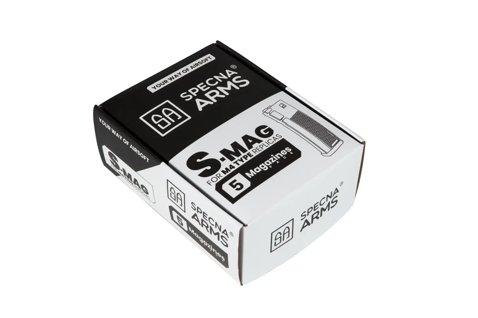Specna Arms prezentuje polimerowe magazynki S-Mag. Charakteryzuje je zwarta, wytrzymała konstrukcja, smukły design. Uwagę zwraca charakterystyczna faktura złożona z logotypów Specna Arms. Magazynek wykonano z wytrzymałego tworzywa, mieści w sobie 125 kulek. Wyjątkowa konstrukcja sprawia że replika pasuje do większości replik dostępnych na rynku i idealnie pasuje do różnej maści ładownic taktycznych. S-mag zapewnia bezproblemowe podawanie kulek, nawet przy wysokim ROF.