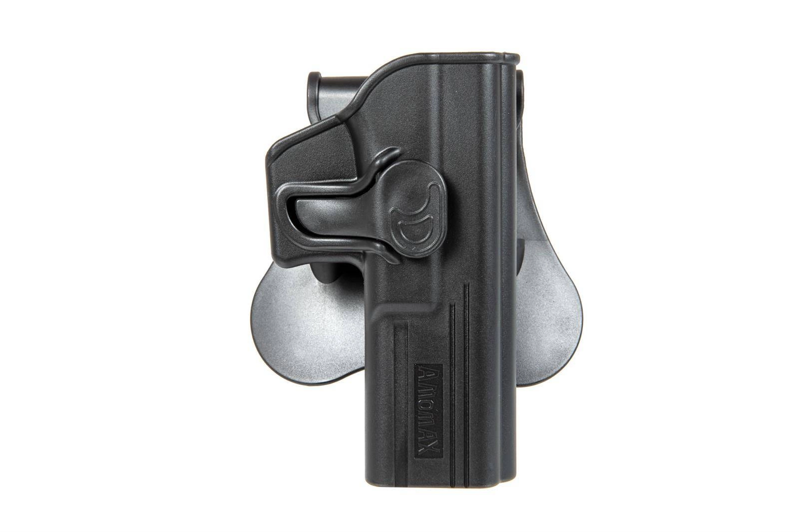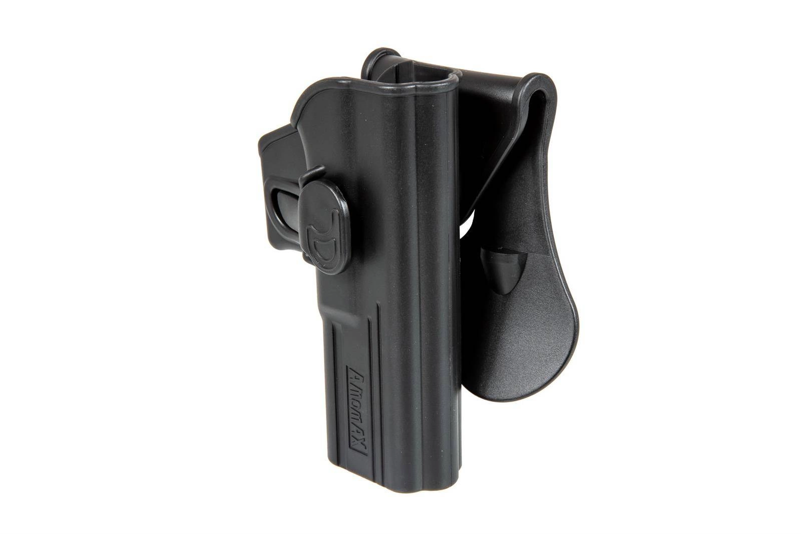Wyprodukowana z wytrzymałego polimeru przez firmę Amomax kabura do replik typu Glock. Posiada intuicyjną blokadę zwalnianą palcem wskazującym podczas dobycia broni.