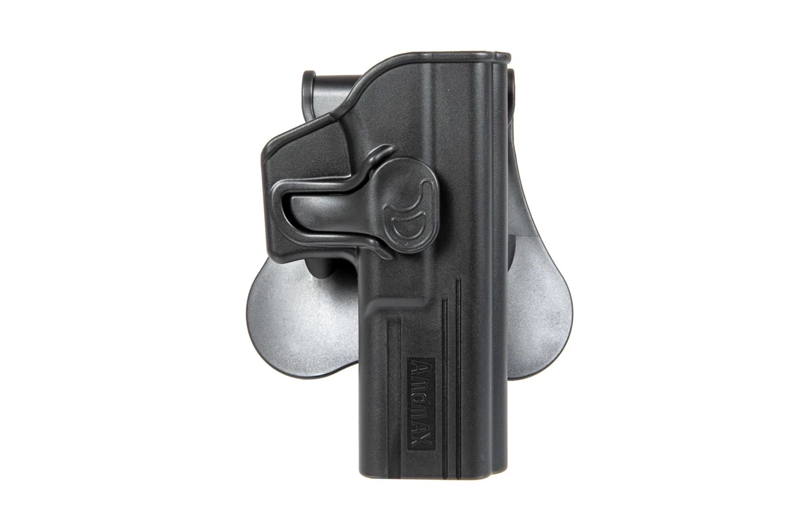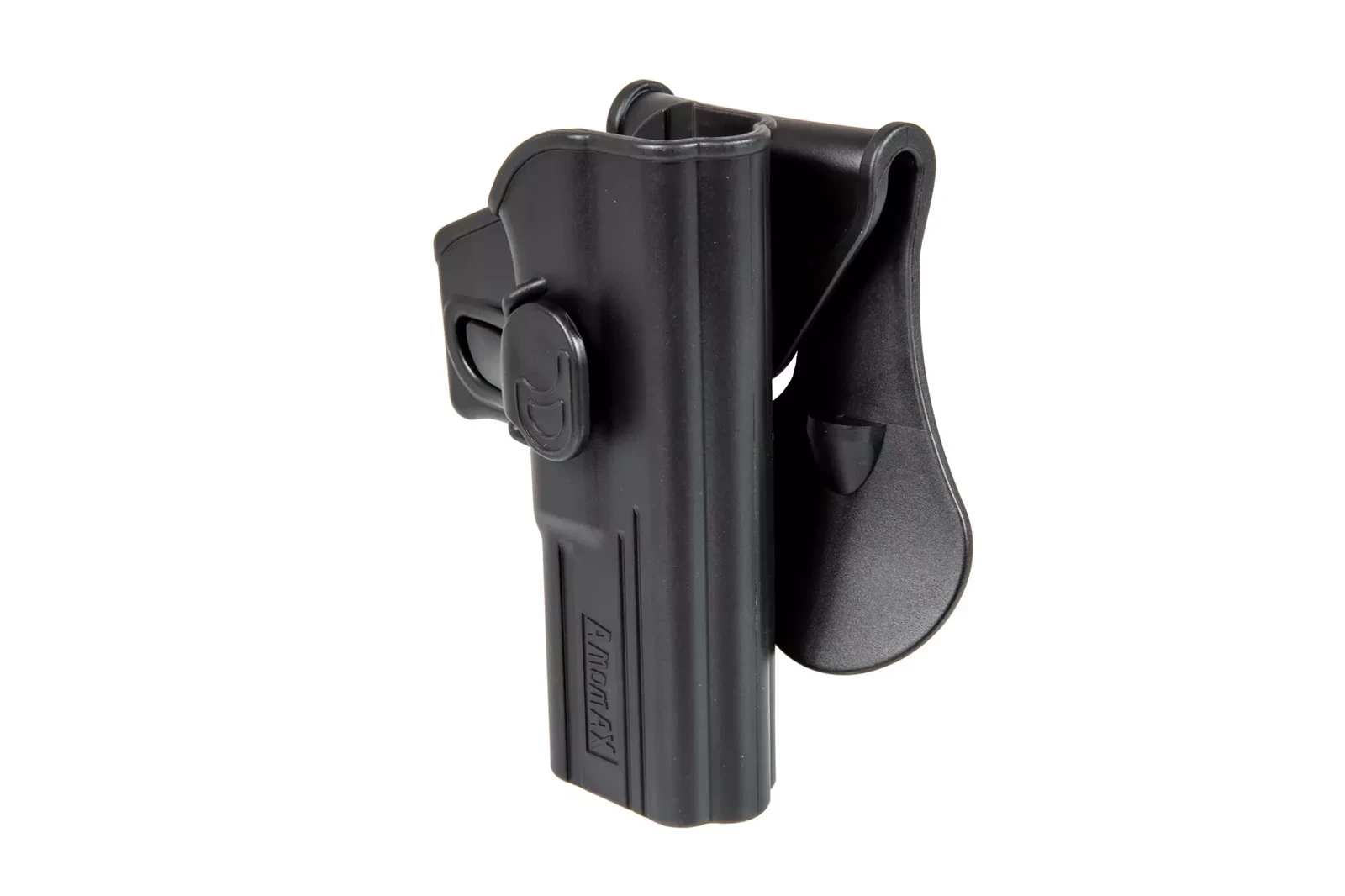 Wyprodukowana z wytrzymałego polimeru przez firmę Amomax kabura do replik typu Glock. Posiada intuicyjną blokadę zwalnianą palcem wskazującym podczas dobycia broni.