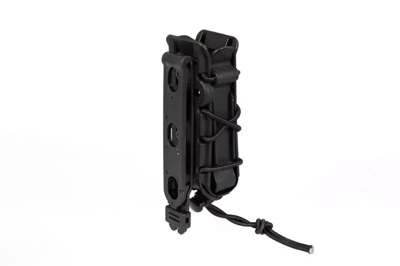 Wykonana z wytrzymałego tworzywa sztucznego ładownica typu fast mieszcząca jeden magazynek pistoletowy 9mm. Ładownica wyposażona jest w specjalną elastyczną linkę do regulacji "rozwarcia" ładownicy która lepiej dopasowuje się do zawartości i nie pozwala magazynkom wypaść. Ładownicę zamontować można na pasie o maksymalnej szerokości 50mm. W zestawie znajduje się klasyczny montaż MOLLE oraz dodatkowy, wygodny i stabilny montaż na pas.