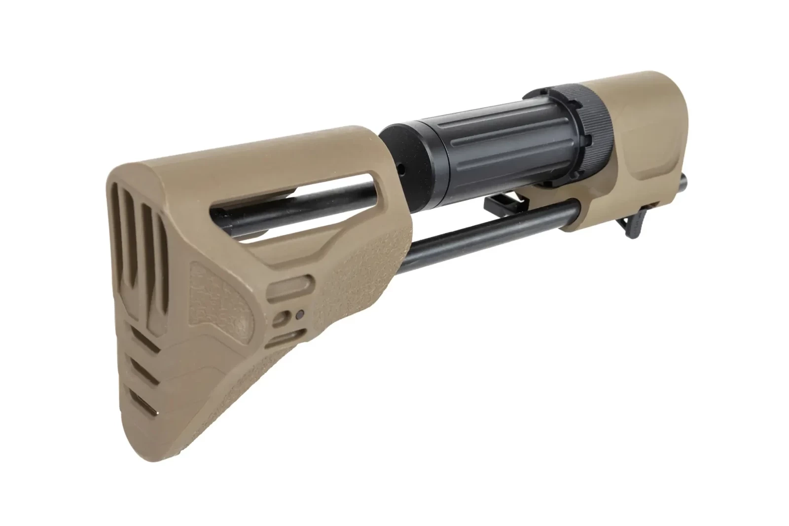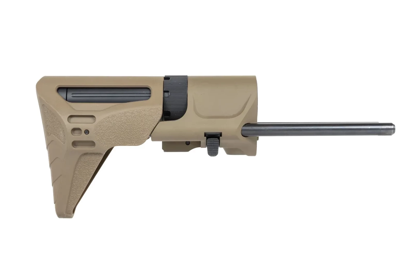 Kolba posiada podwójną blokadę, która uniemożliwia przypadkowe wysunięcie kolby z korpusu. Do odkręcanej atrapy buffer tube można zmieścić akumulator LiPo o wymiarach maksymalnych 15x11x115mm. Przykładowy akumulator: https://gunfire.com/pl/products/akumulator-lipo-7-4v-1200mah-25-50c-t-connect-deans-1152214387.html