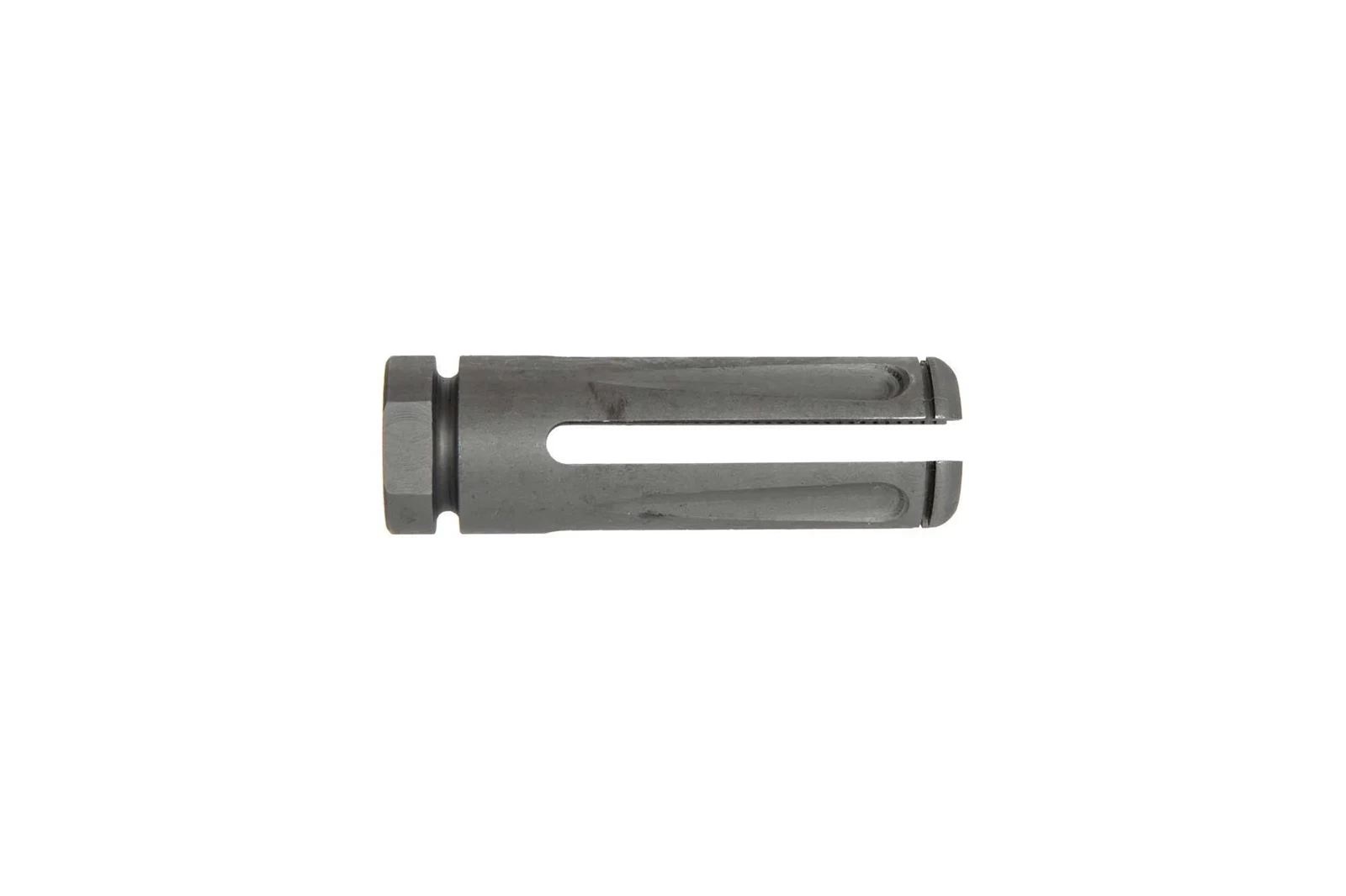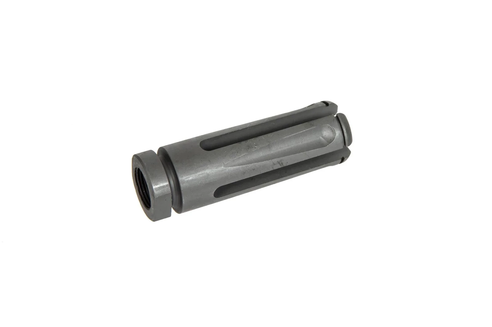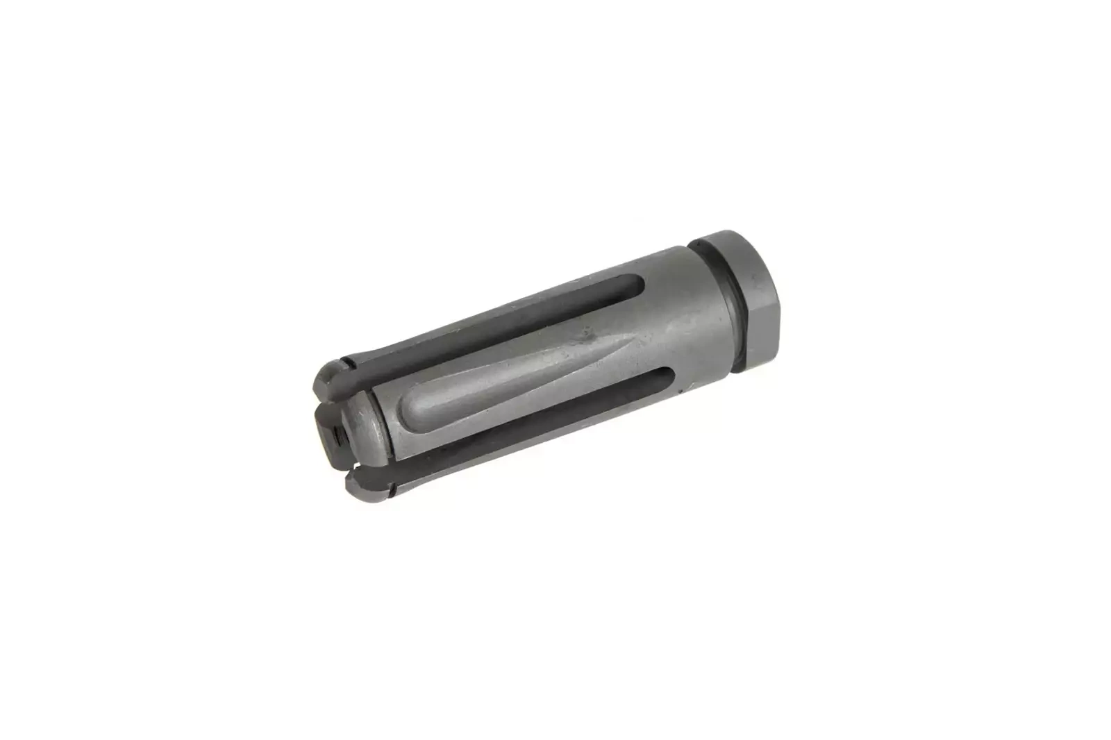 Wykonana ze stali replika urządzenia wylotowego. Przeznaczona do montażu na replikach typu M4/M16 pasuje na lufy zakończone gwintem 14mm CW lub CCW.