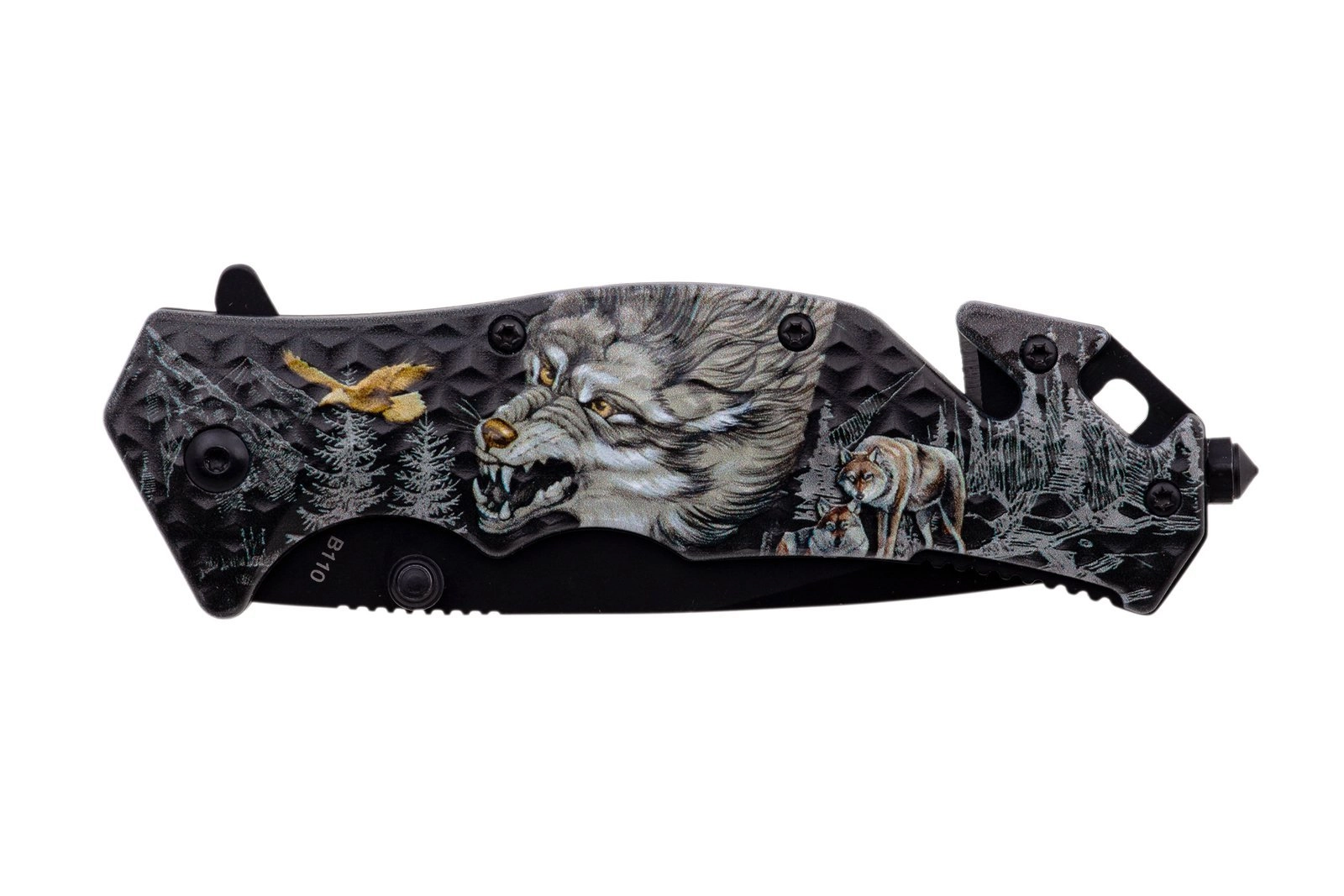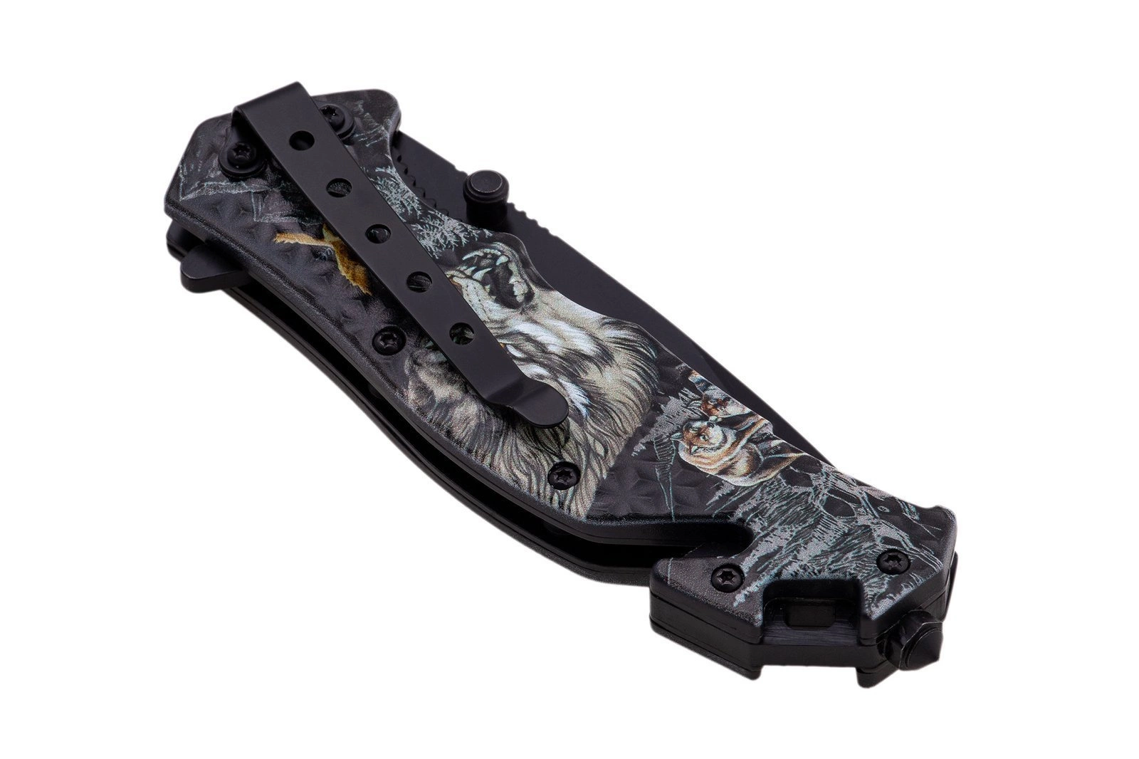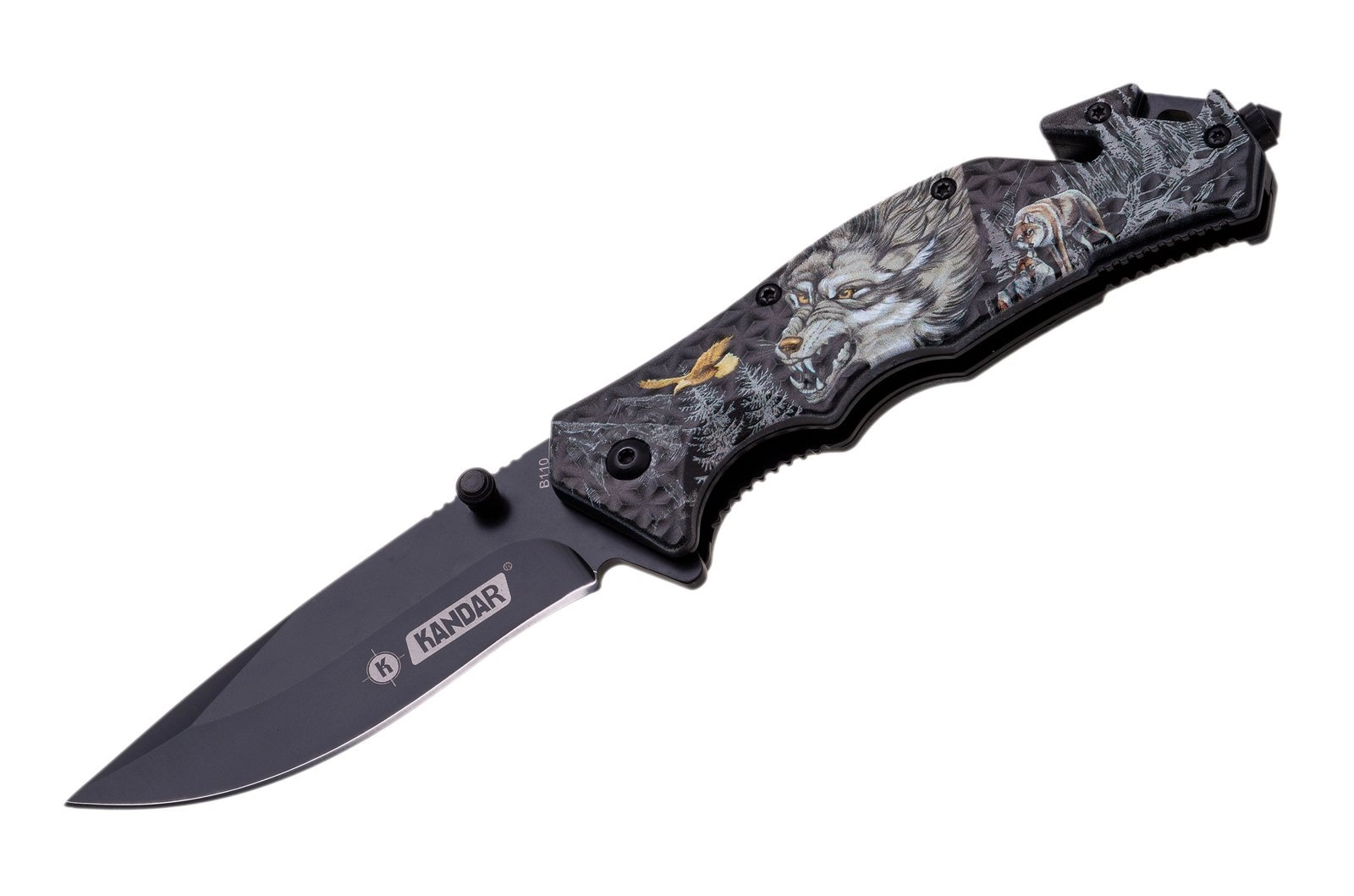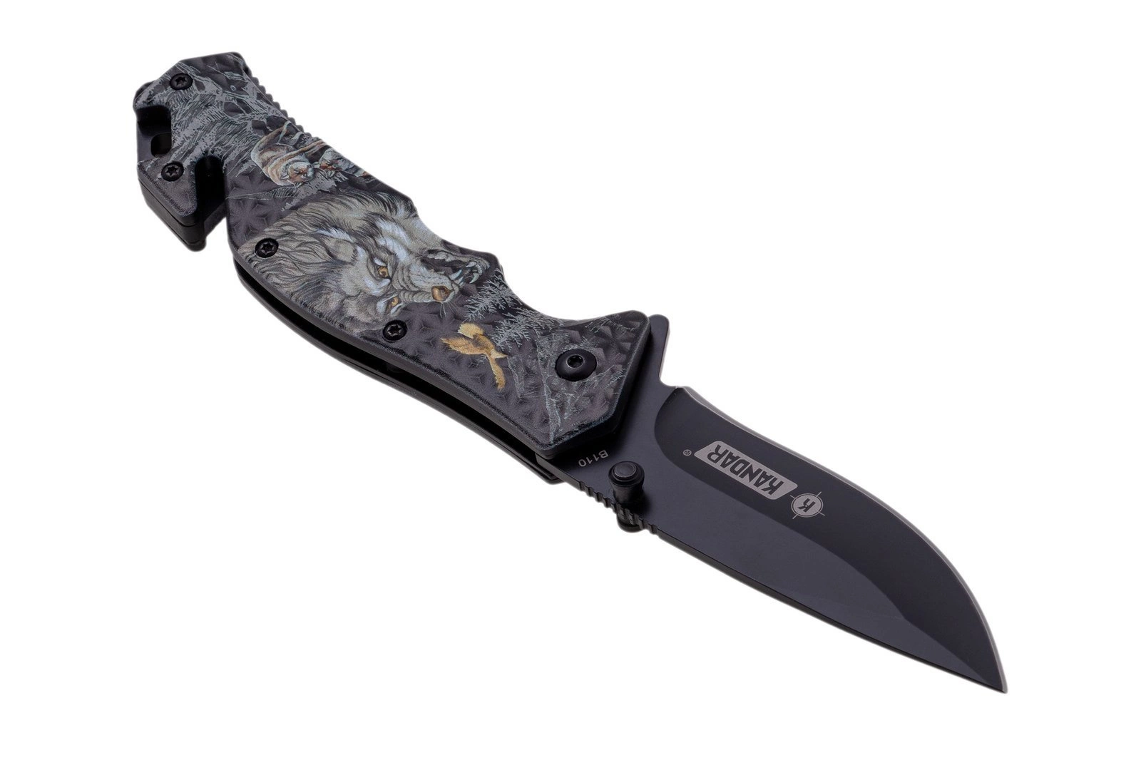 Nóż renomowanej polskiej marki KANDAR. Obicie zdobi pięknie prezentujący się wizerunek wilka na łowach. Nóż docenią osoby dla których ważna jest wygoda komfort i bezpieczeństwo, a chowane w rękojeści ostrze sprawdzi się w powszechnej turystyce i survivalu. Precyzyjnie wykonane ostrze poprawia efektywność noża i a wygodna antypoślizgowa rękojeść gwarantuje wysoki komfortu użytkowania,