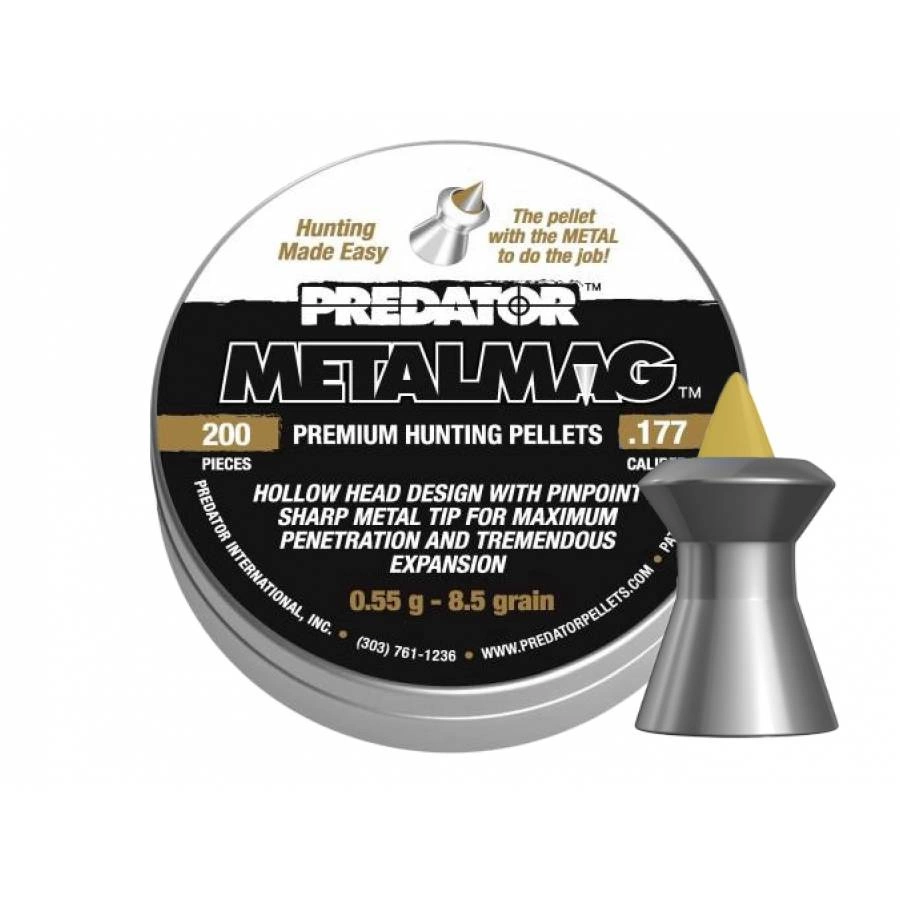 Śrut Diabolo JSB Exact Metalmag Predator 4,5 mm charakteryzuje się bardzo dużą przebijalnością. Dzięki metalowemu trzpieniowi który inicjuje grzybkowanie, śrut w znacznie wiekszym stopniu rozrywa cel (elekt małego otworu wlotowego z przodu i dużego z tyłu).