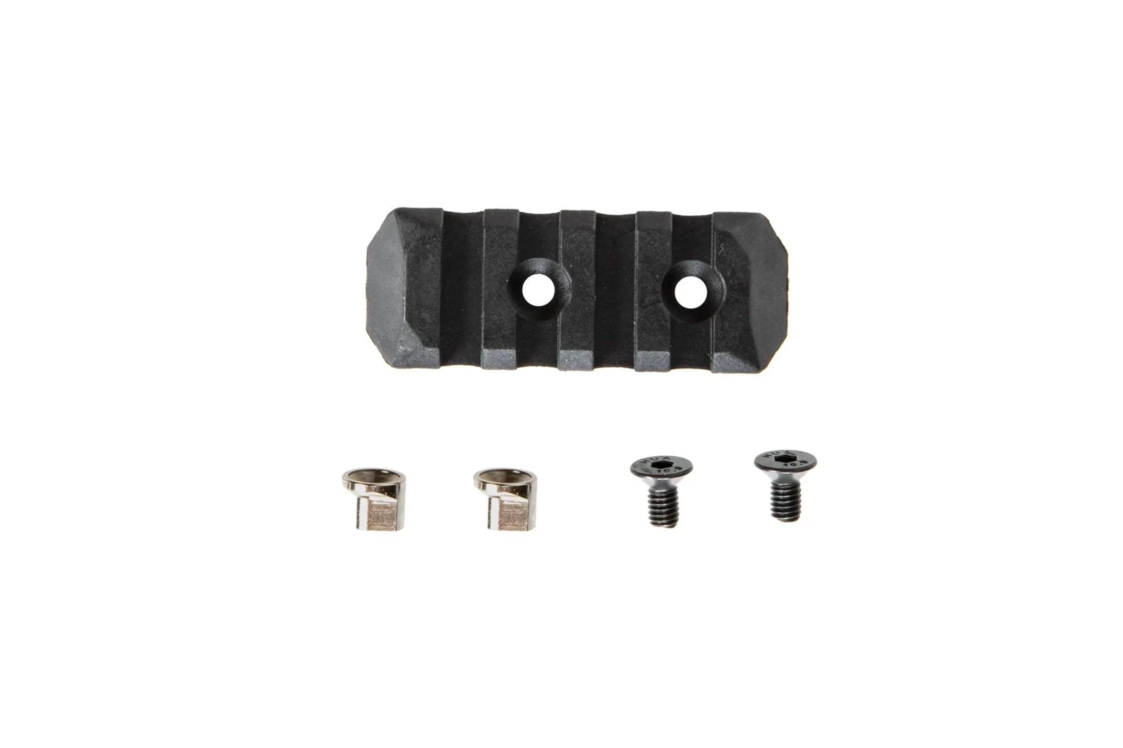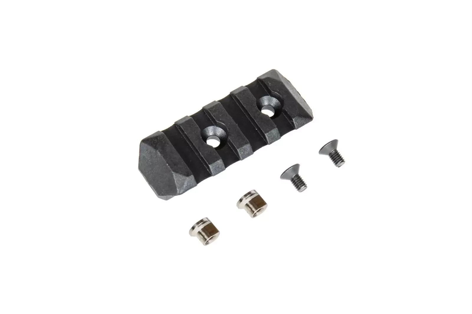Odcinek szyny RIS / Picatinny o długości 4 slotów wykonany z tworzywa polimerowego. Szyna posiada montaż kompatybilny z systemem modułowym KeyMod.