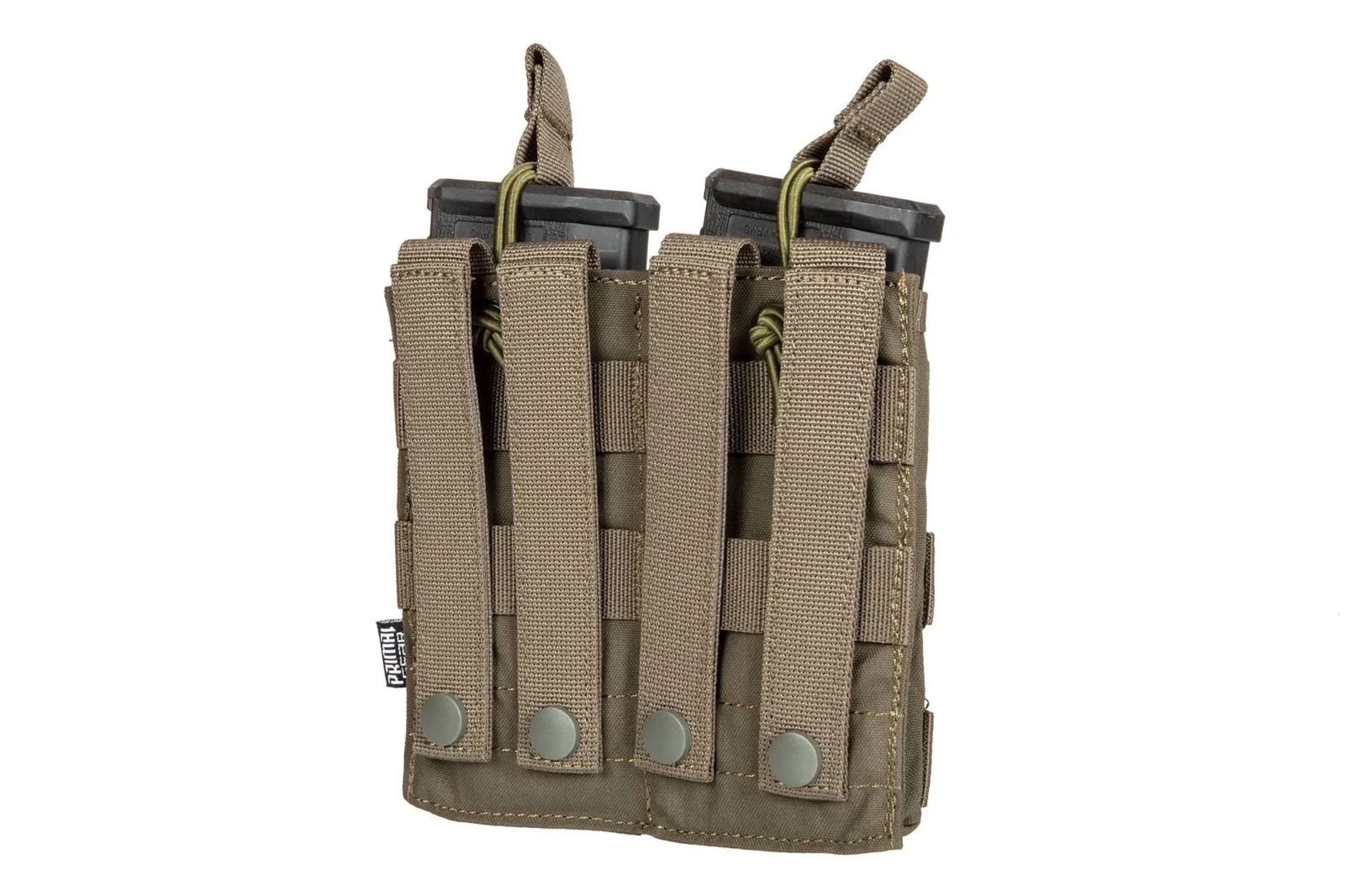 Wykonana z lekkiego i wytrzymałego materiału Aspen 500D ładownica typu shingle na 2 magazynki typu AK / M4 / G36 oraz wiele innych. Zastosowanie wytrzymałych szwów oraz wysokiej jakości akcesoriów jak taśmy dodatkowo zwiększają odporność i trwałość. Każdy magazynek jest od góry zabezpieczony przed wypadnięciem elastyczną linką typu shock-cord.