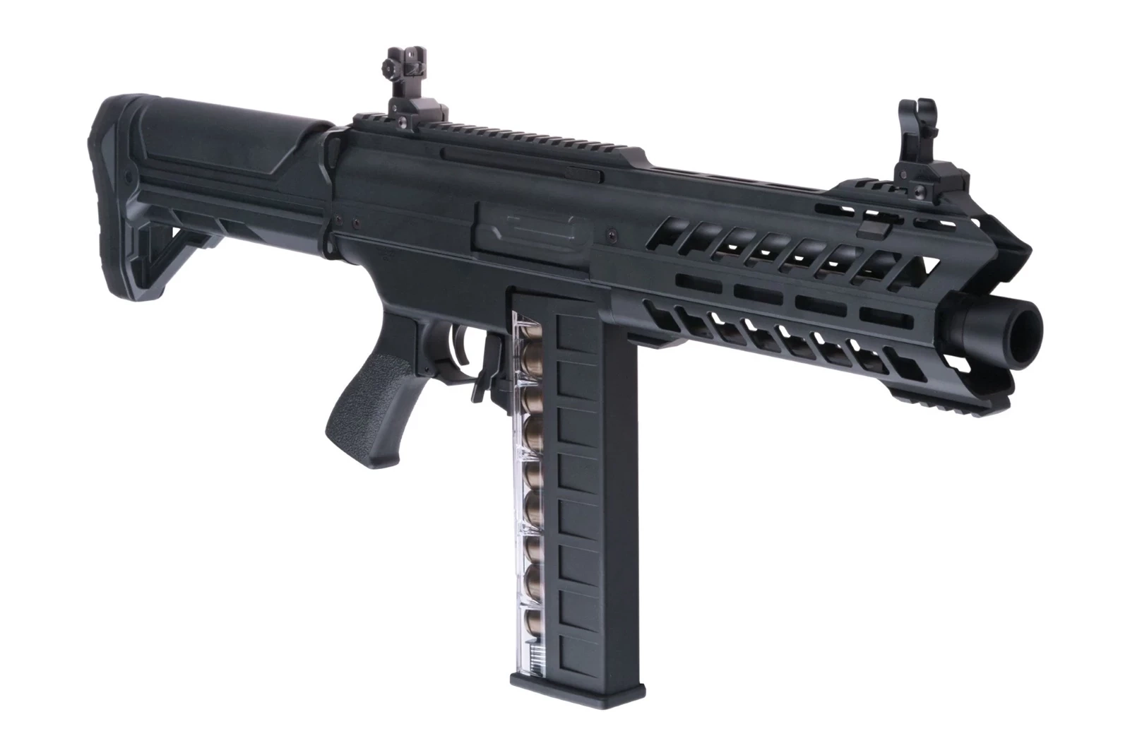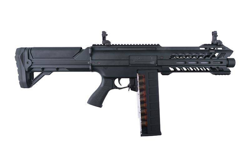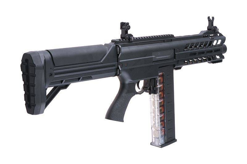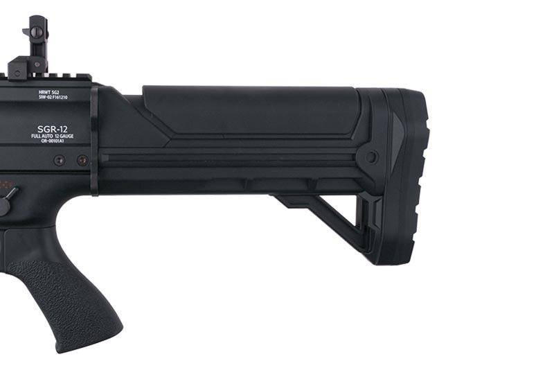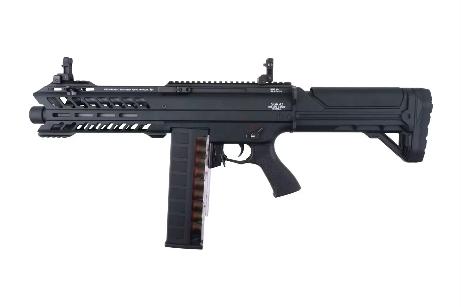 Wyprodukowana przez Tokyo Marui replika SGR-12 jest odmienioną wersją repliki tego samego producenta - AA-12. Wykonany z trwałego, polimerowego tworzywa sztucznego oraz metalu korpus kryje szkielet i części wewnętrzne, które wykonane są metalowe. Wyraźne i dokładne wykończenie repliki zapewniają jej wyjątkowy i bardzo autentyczny wygląd. Wyprodukowana przez znaną z precyzji i innowacyjności Tokyo Marui replika jest uważana za najskuteczniejsze narzędzie do czyszczenia pomieszczeń. Istotnym faktem jest iż replika posiada szynę RIS w standardzie MLOK z oznaczeniami licencyjnymi a także szynę RIS 22mm umieszczoną na grzbiecie repliki oraz pod lufą - pozwala to na instalację rożnej maści akcesoriów taktycznych jak latarki czy celowniki. W zestawie znajdują się 3, różnej długości, dedykowane szyny MLOK które ustawić możemy wedle referencji i zapotrzebowania. Replikę wyposażono także w składane przyrządy celownicze.
