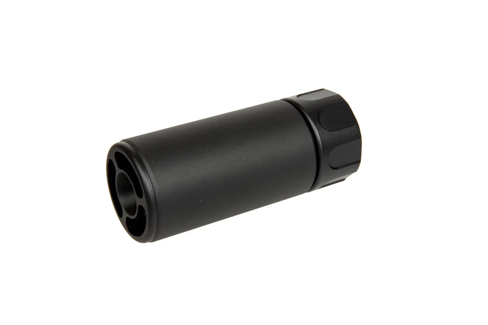 - Aluminiowy korpus tłumika imitujący kształt wielofunkcyjnego urządzenia wylotowego do broni palnej.