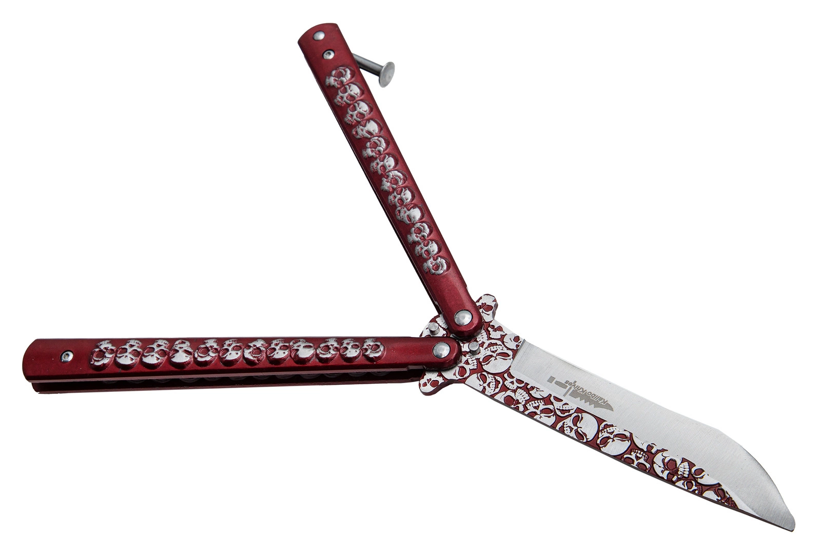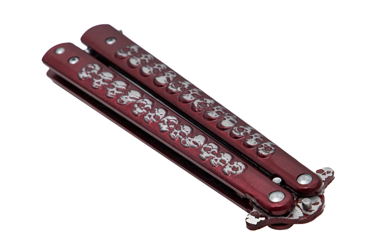 Nóż motylkowy treningowy Halloween Blood  Nóż przeznaczony jest do treningu, ćwiczeń oraz wykonywania trików. Stępione ostrze zapobiega zranieniu. Prosta i solidna konstrukcja noża zapewnia trwałość i wysoką jakość. Nóż posiada zapięcie blokujące oraz specjalnie perforowaną głownię poprawiającą stabilność i lekkość podczas wykonywania sztuczek