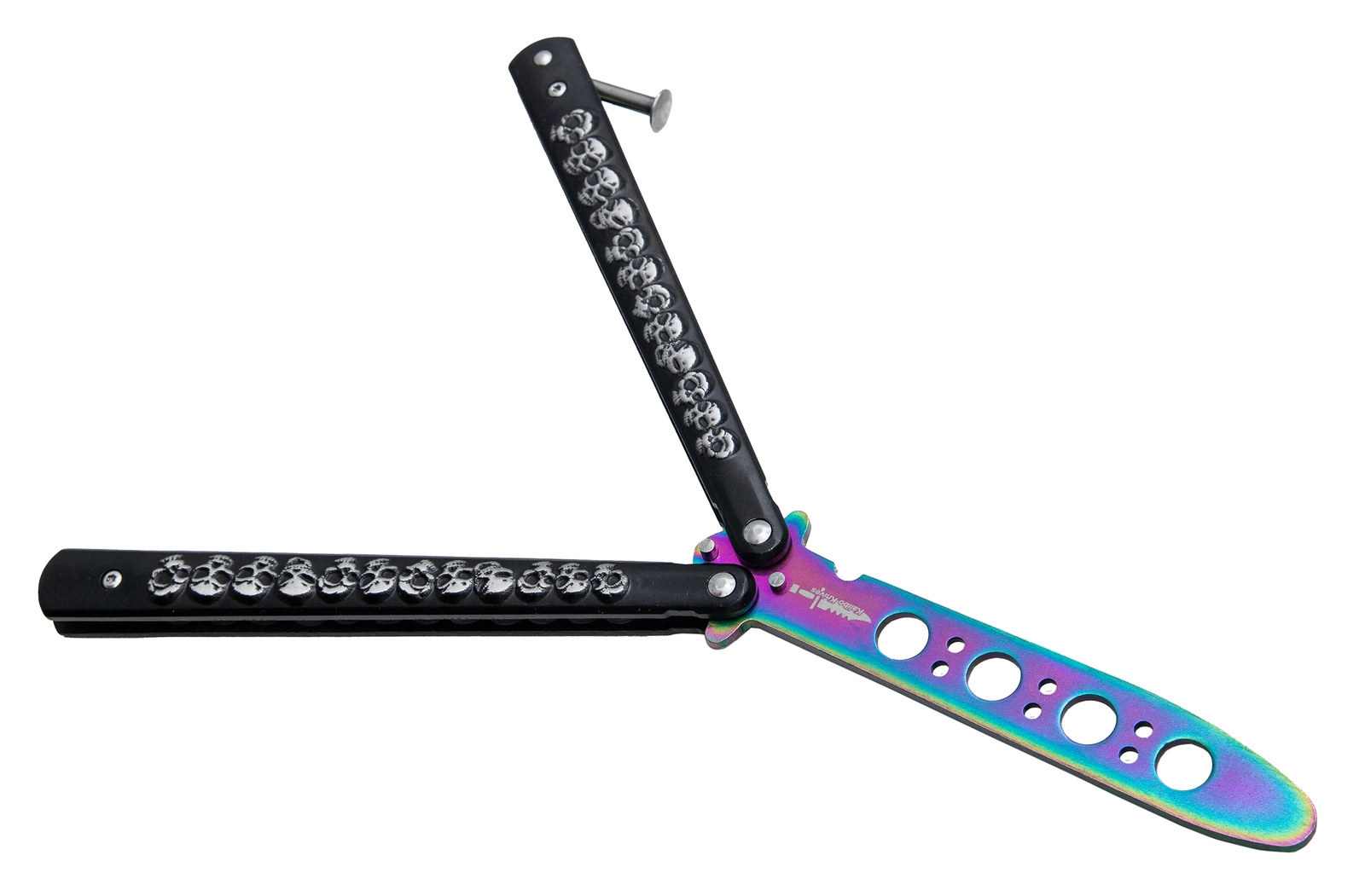 Nóż motylkowy treningowy Halloween Brutal  Nóż przeznaczony jest do treningu, ćwiczeń oraz wykonywania trików. Stępione ostrze zapobiega zranieniu. Prosta i solidna konstrukcja noża zapewnia trwałość i wysoką jakość. Nóż posiada zapięcie blokujące oraz specjalnie perforowaną głownię poprawiającą stabilność i lekkość podczas wykonywania sztuczek