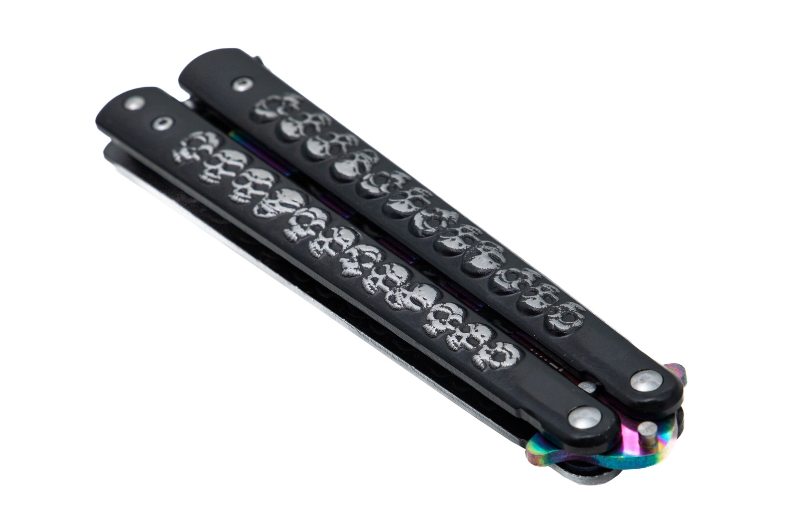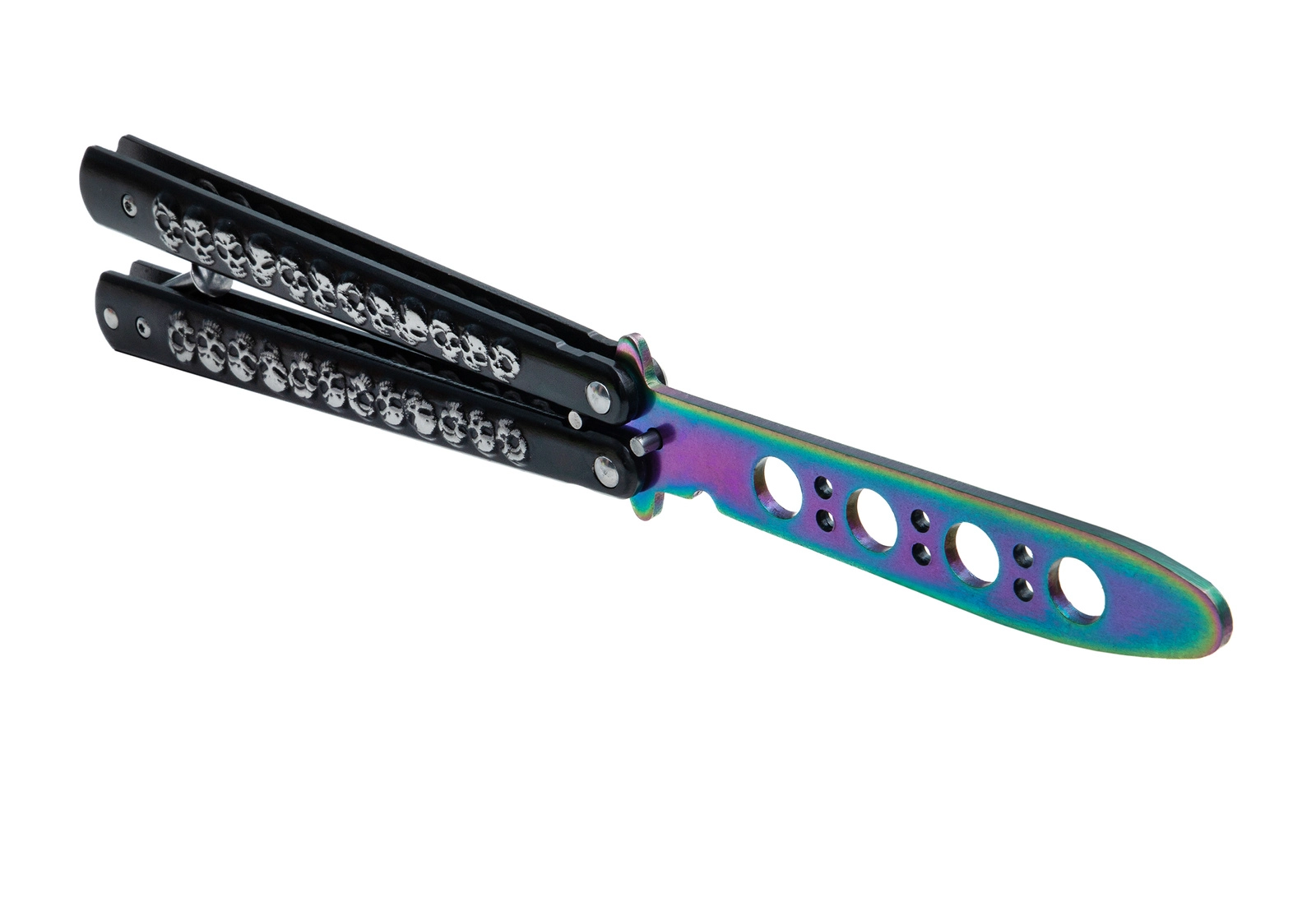 Nóż motylkowy treningowy Halloween Brutal Nóż przeznaczony jest do treningu, ćwiczeń oraz wykonywania trików. Stępione ostrze zapobiega zranieniu. Prosta i solidna konstrukcja noża zapewnia trwałość i wysoką jakość. Nóż posiada zapięcie blokujące oraz specjalnie perforowaną głownię poprawiającą stabilność i lekkość podczas wykonywania sztuczek