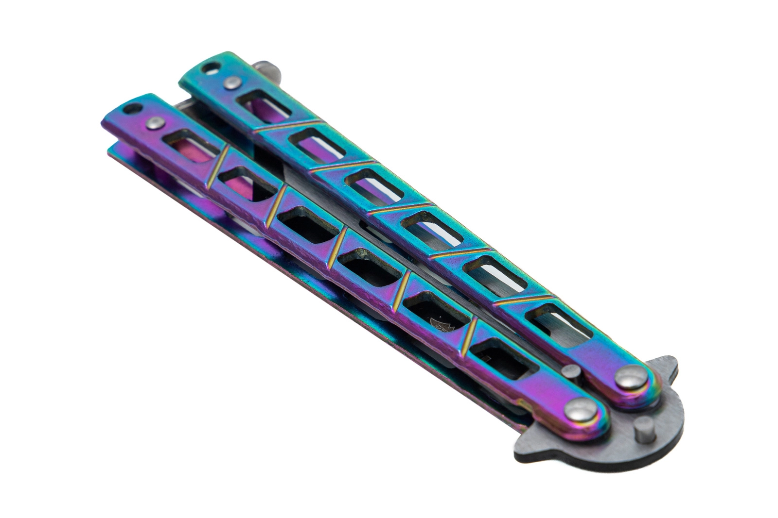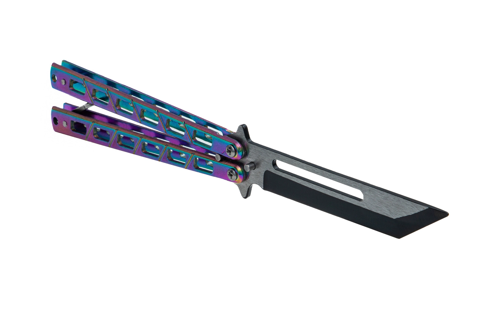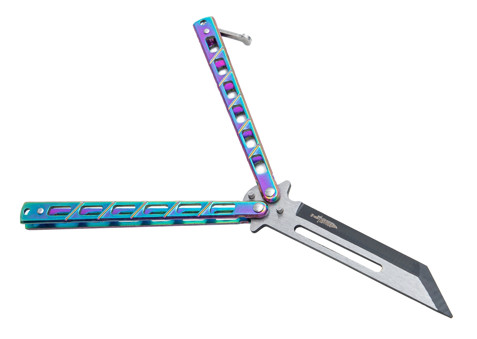 Nóż motylkowy treningowy TANTO Nóż przeznaczony jest do treningu, ćwiczeń oraz wykonywania trików. Stępione ostrze zapobiega zranieniu. Prosta i solidna konstrukcja noża zapewnia trwałość i wysoką jakość. Nóż posiada zapięcie blokujące oraz specjalnie perforowaną głownię poprawiającą stabilność i lekkość podczas wykonywania sztuczek