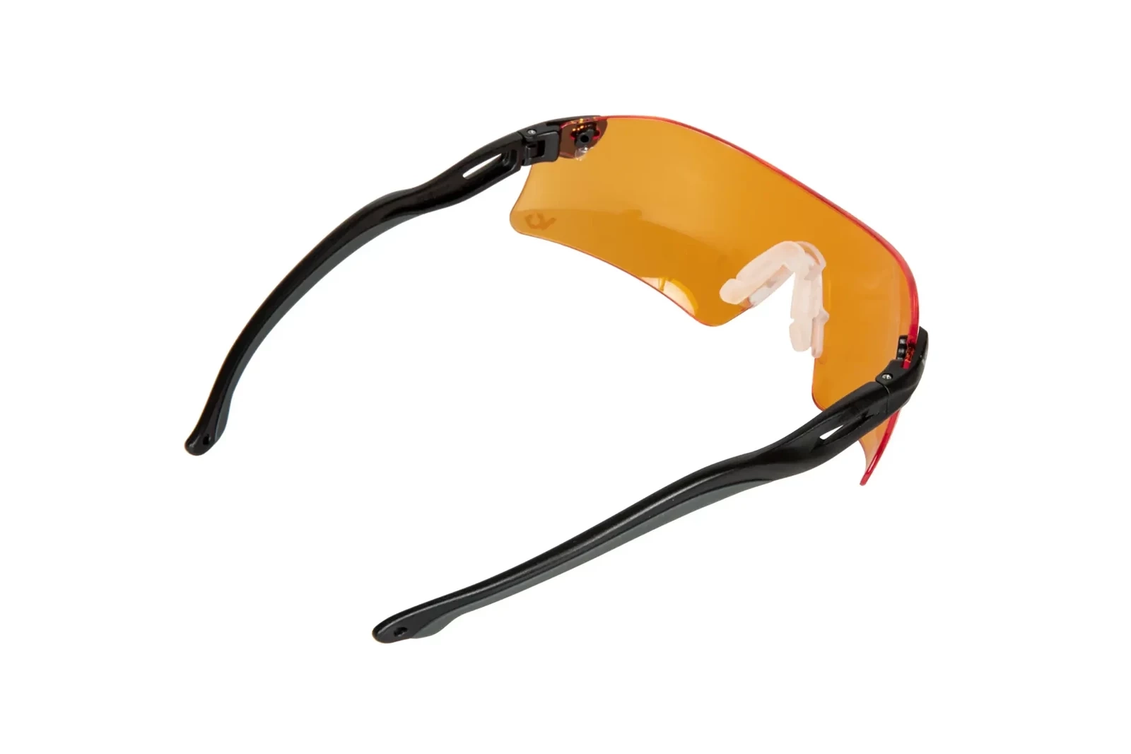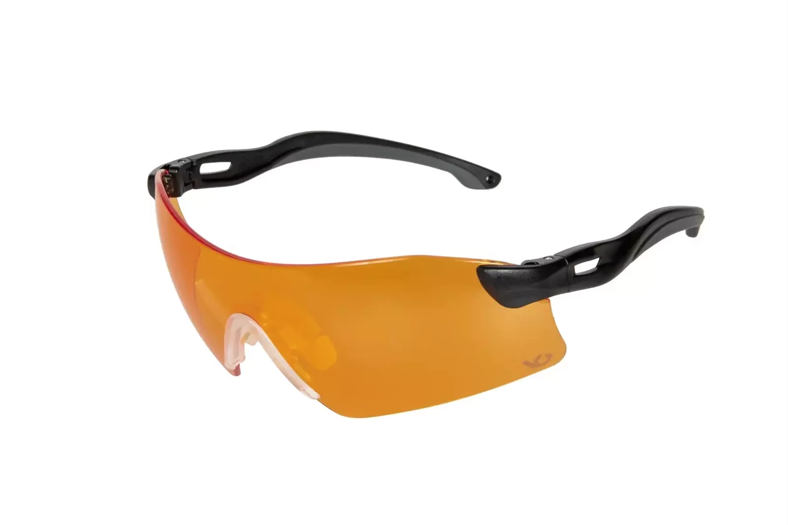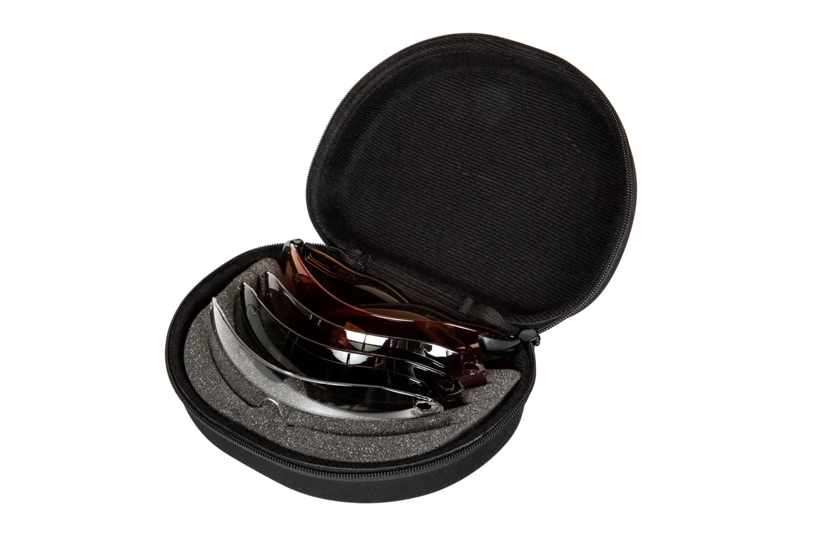 Wysokiej jakości okulary wraz zestawem wymiennych szkieł i akcesoriów. Konstrukcja modelu opiera się na szybie samonośnej bez ramki. Zapewnia to duże pole widzenia i umożliwia strzelanie w każdej postawie bez ryzyka wchodzenia ramki w pole widzenia. Profilowane nauszniki pozwalają na wygodne noszenie okularów wraz ze słuchawkami. Nosek okularów został wykonany z miękkiego, gumowego materiału z antypoślizgową powłoką.