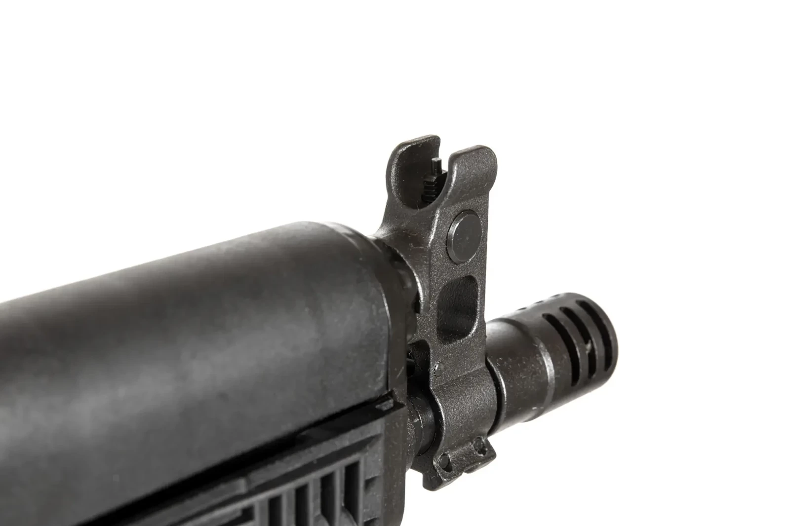 -Większość elementów wykonano z czernionej stali, w tym korpus, front wraz z lufą, obsadę kolby oraz pełną atrapę suwadła z tłokiem gazowym.