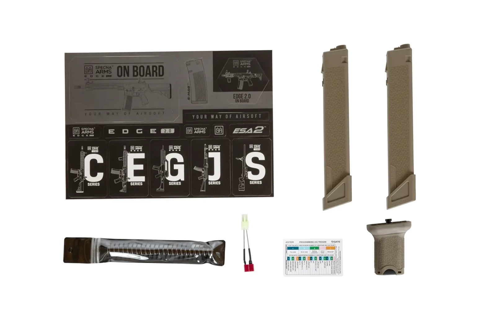 W pudełku z repliką znajdują się dwa magazynki mid-cap S-MAG o pojemności 120 kulek każdy. S-MAG to ekskluzywny magazynek polimerowy zaprojektowany przez Specna Arms. Na uwagę zwraca charakterystyczna faktura złożona z logotypów Specna Arms. S-mag zapewnia bezproblemowe podawanie kulek, nawet przy wysokim ROF.