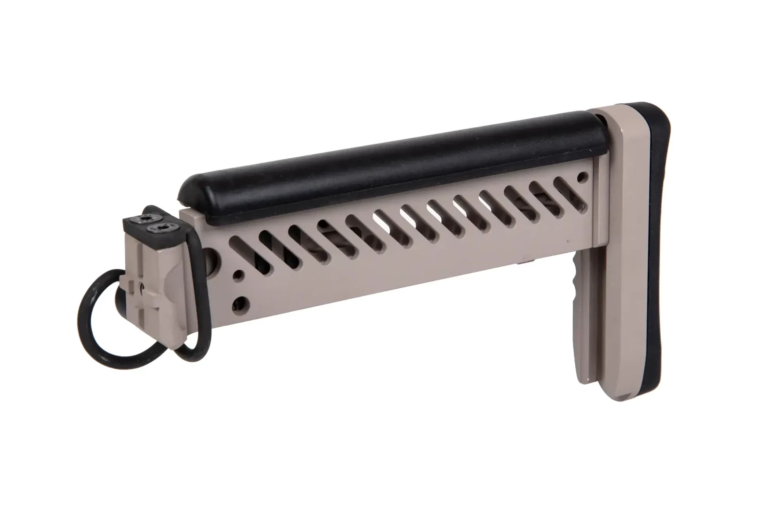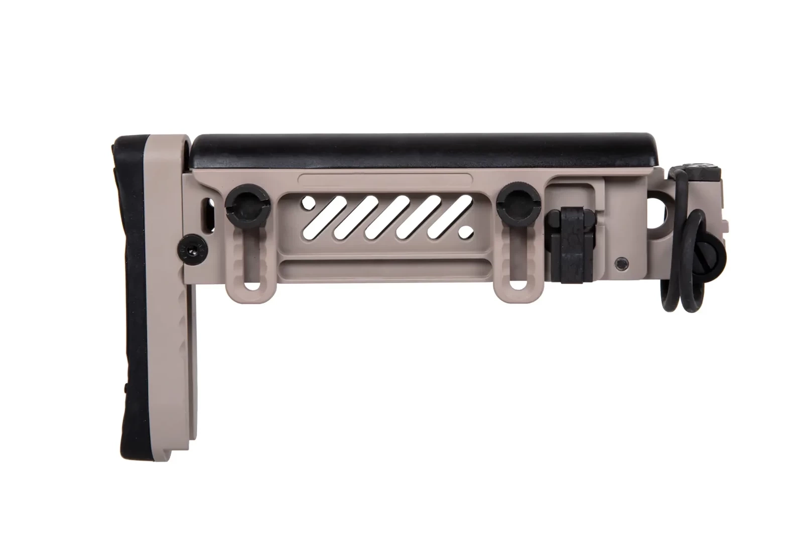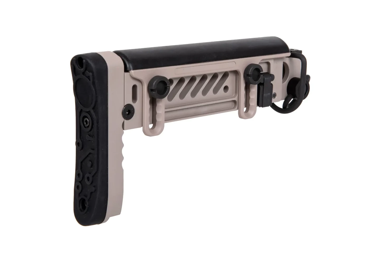 Kolba posiada płynną regulację długości, zakończona jest wygodną stopką z twardej gumy. Z gumy wykonano również poduszkę policzkową, której wysokość jest regulowana. Kolba pasuje do replik typu AK ze składaną kolbą, np modeli AKS-74, bądź AK74M.