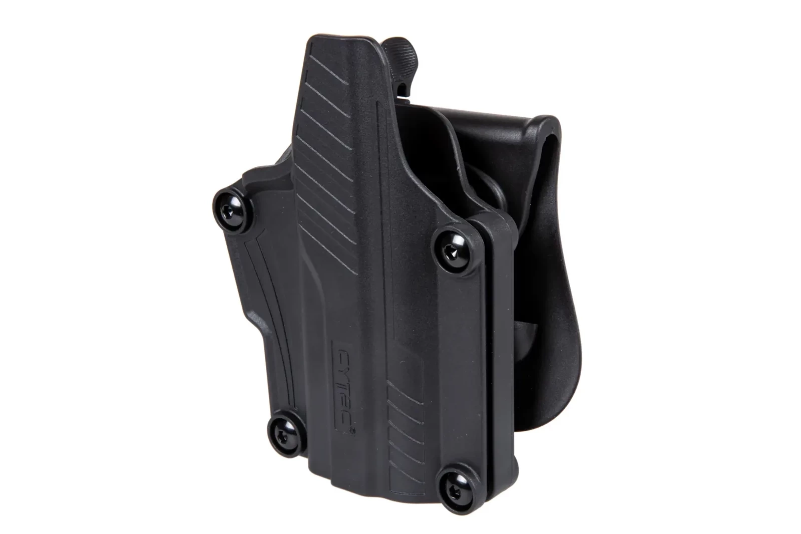 Kabura wyprodukowana przez firmę Cytac przeznaczona do różnych popularnych rodzajów pistoletów: Glock, Beretta, Sig Sauer, Taurus, etc. wersja "Plus Optics" została przystosowana do współpracy z pistoletami wyposażonymi w optykę jak i również mechaniczne podwyższone przyrządy celownicze.