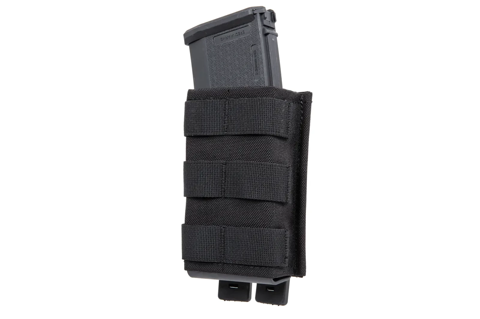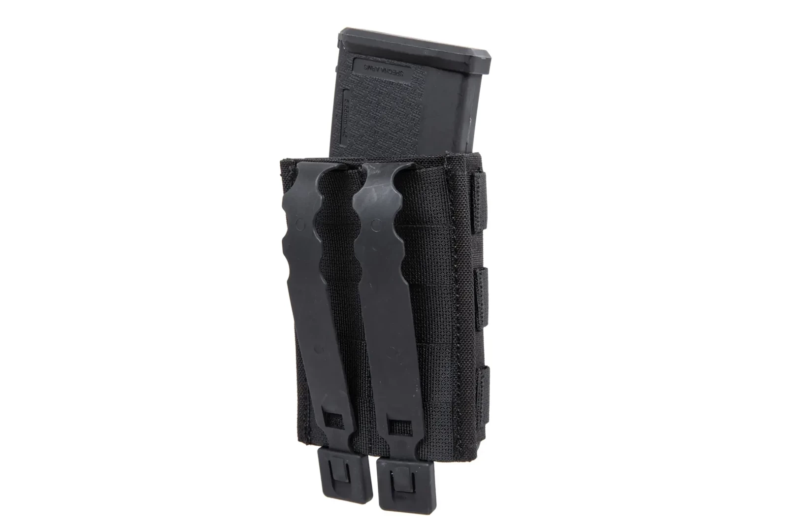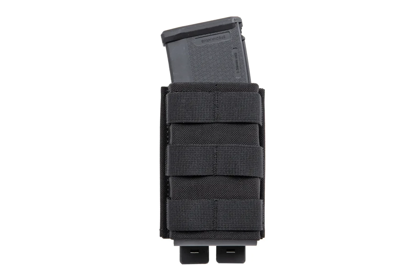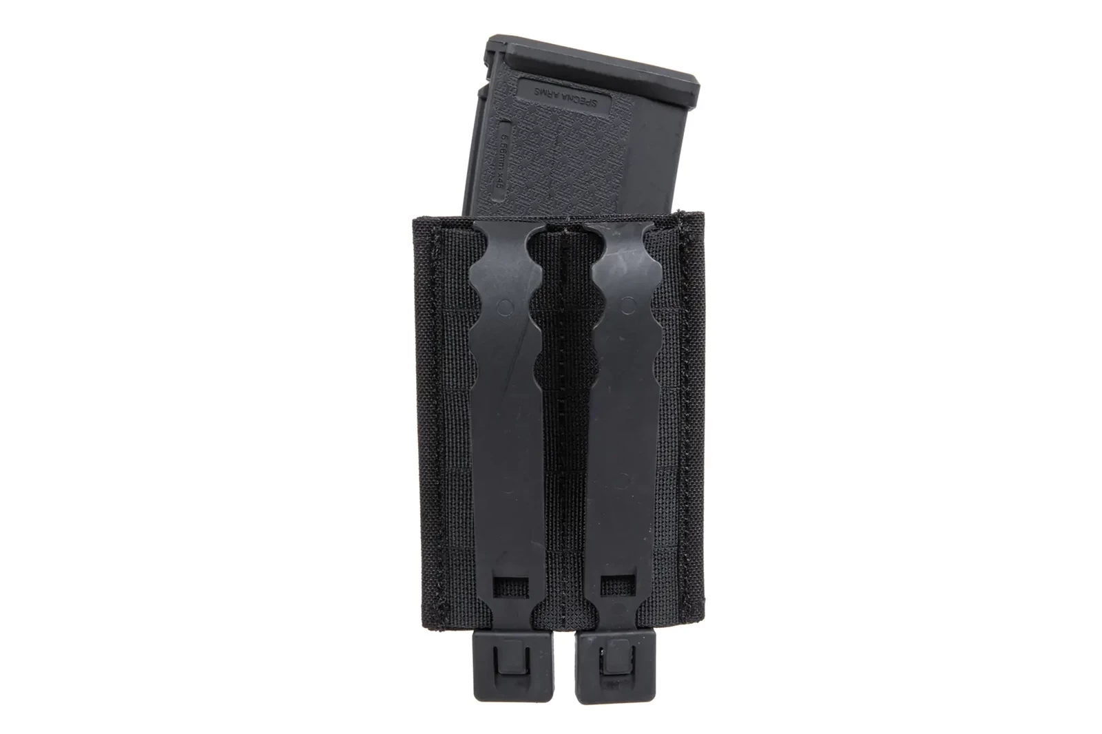 Front ładownicy posiada trzy rzędy taśm w systemie Molle, co pozwoli rozbudować wyposażenie o dodatkowe ładownice, zaczepy lub np. montaż karabińczyka.