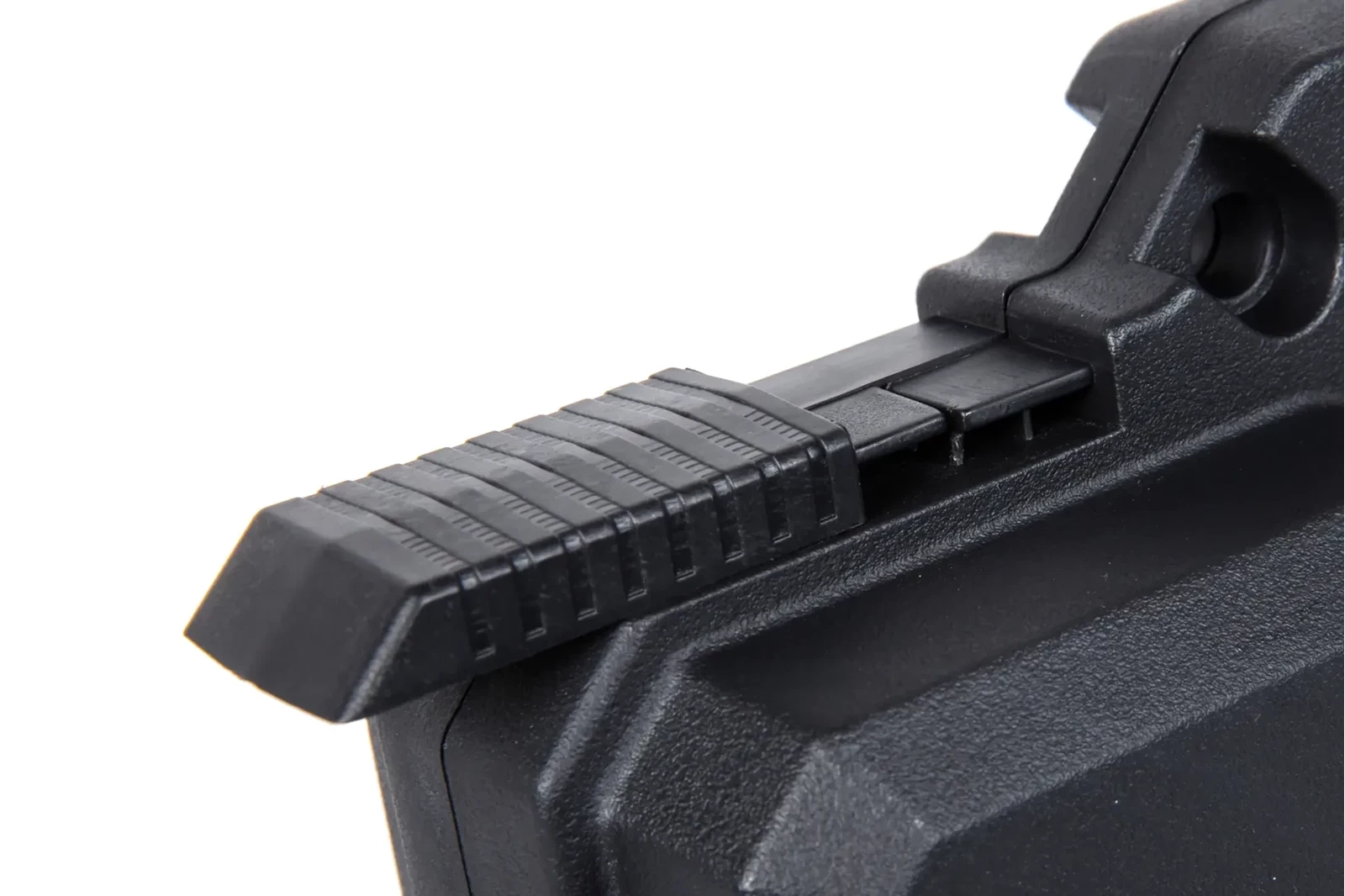 Walizka posiada wygodny chwyt transportowy, zamykana jest na dwa rozsuwane zatrzaski, a front walizki jest ozdobiony logiem marki Specna Arms