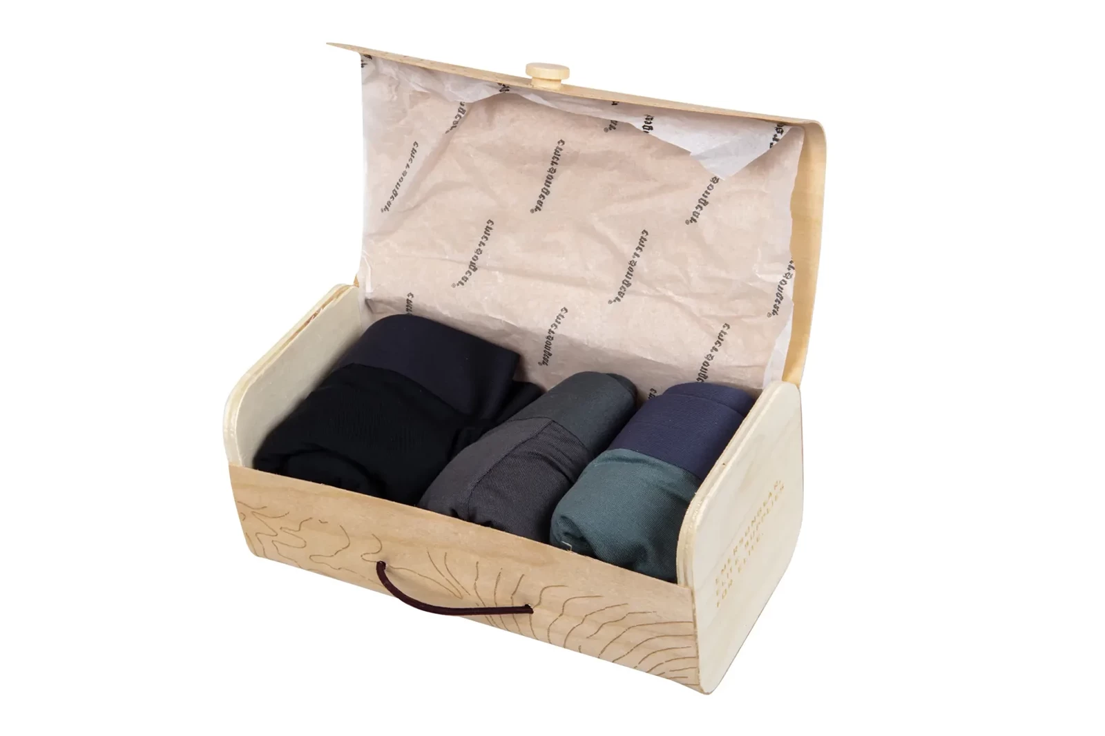 Zestaw zawiera 3 sztuki bokserek wraz z eleganckim drewnianym opakowaniem, który może służyć do przechowywania bielizny w szafie.