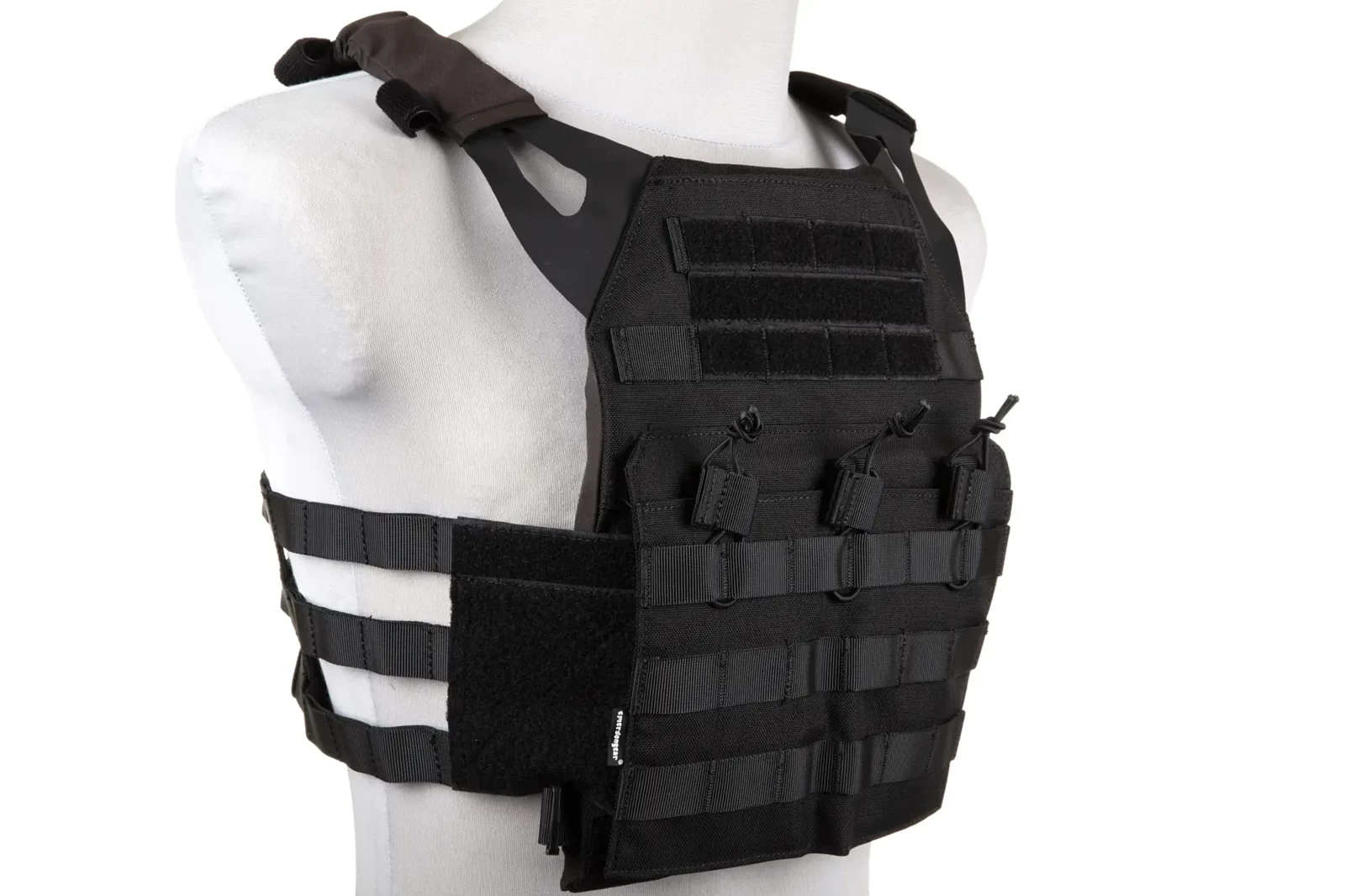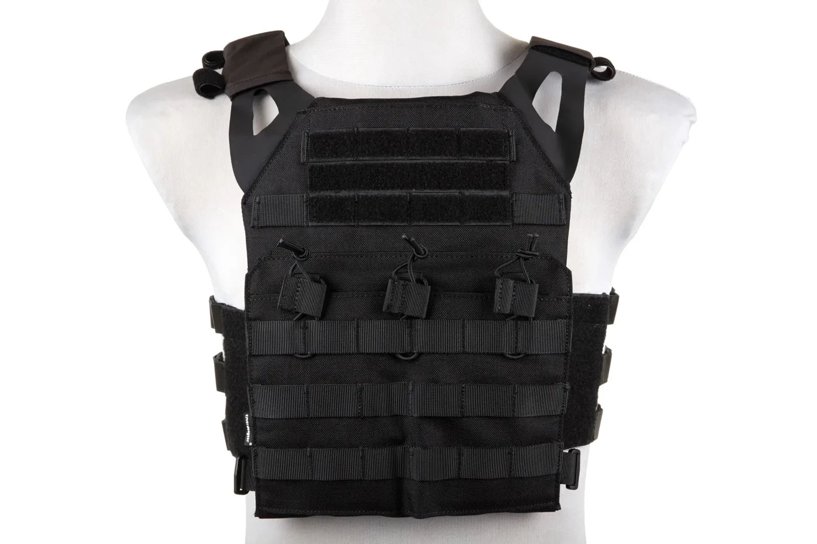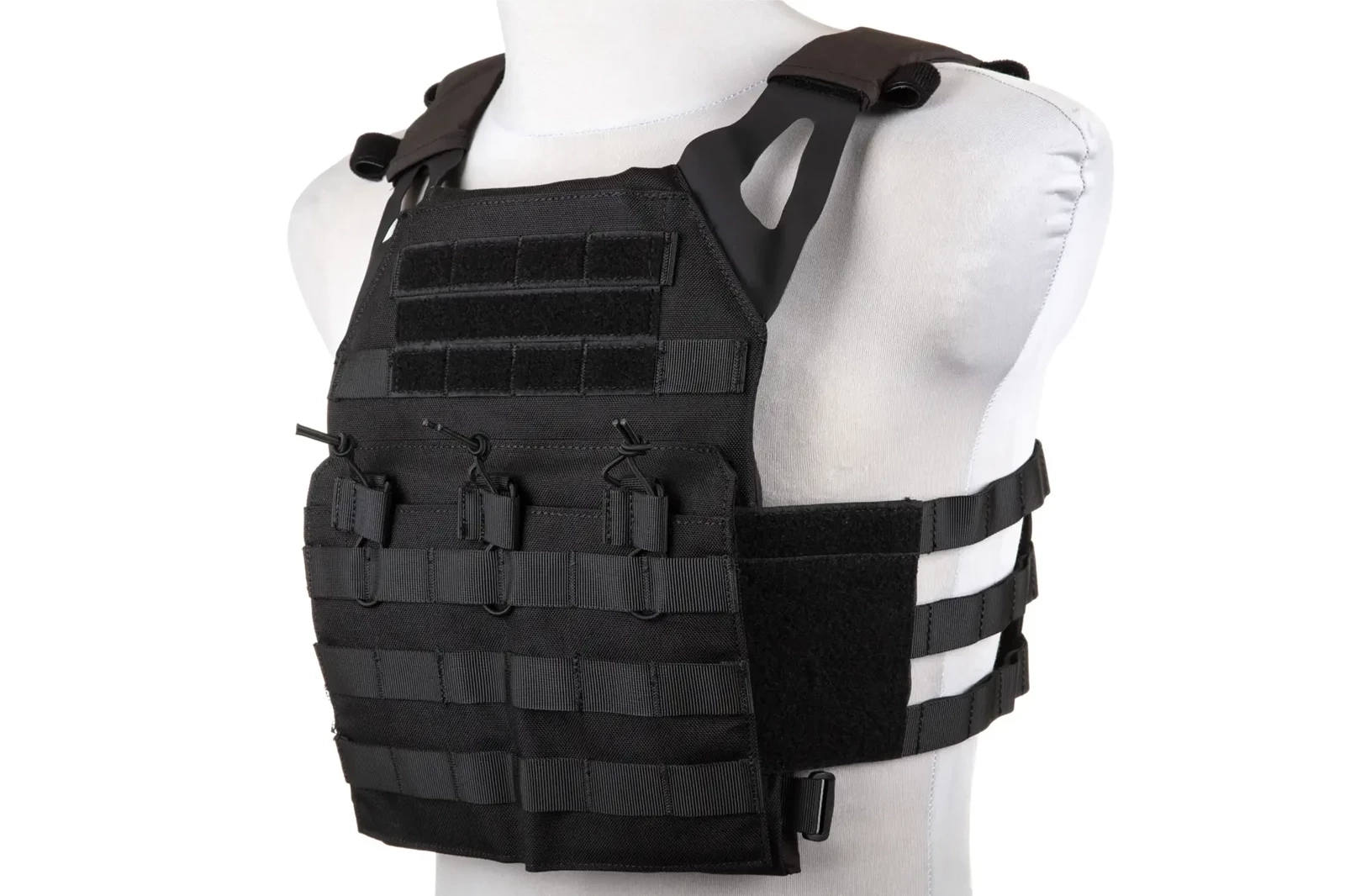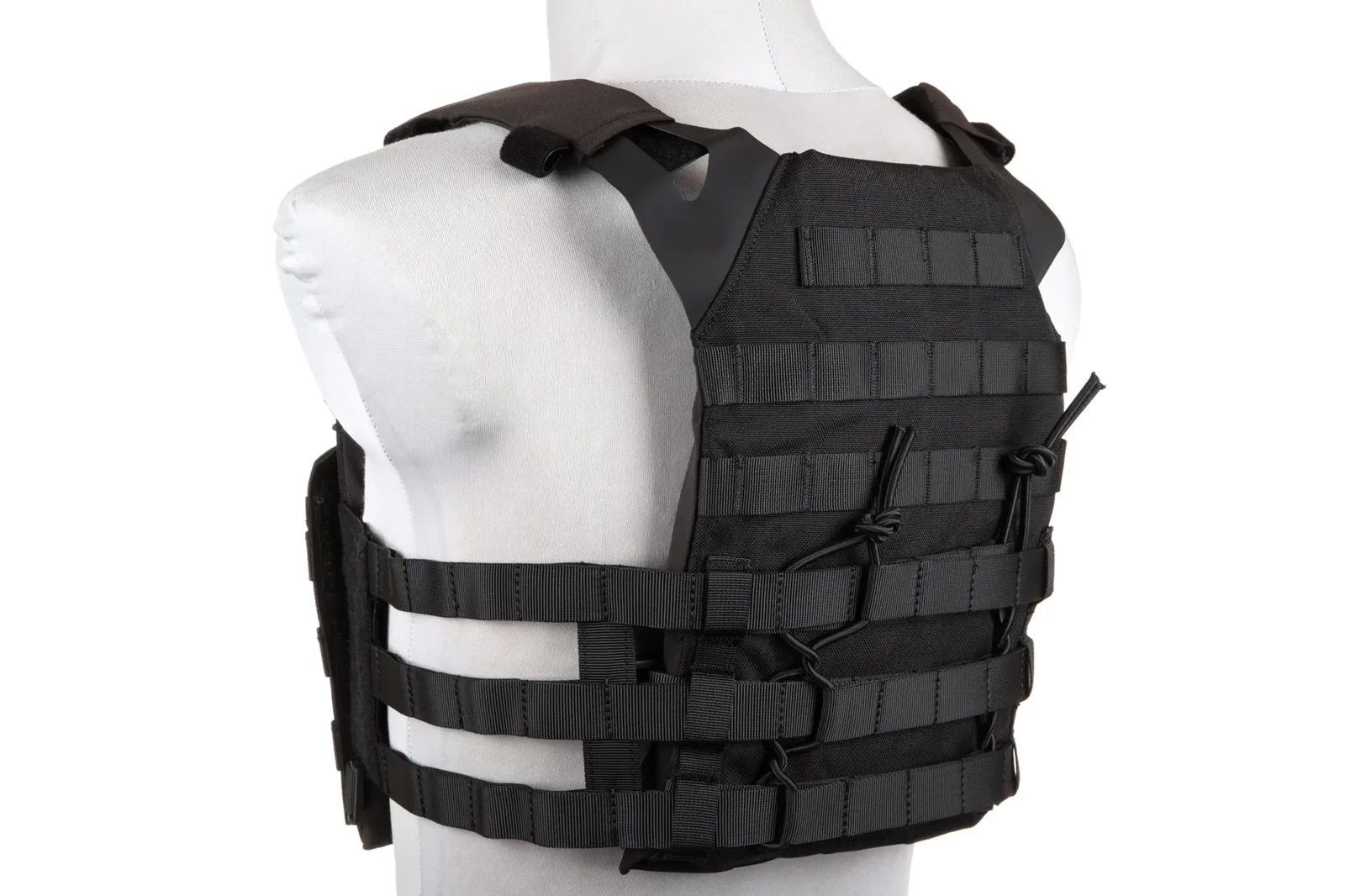 Bardzo lekka i funkcjonalna kamizelka typu plate carrier, uszyta z wytrzymałego nylonu. Zbudowana z dwóch paneli - przedniego oraz tylnego, połączonych lekkim, szkieletowym cummerbundem, który składa się jedynie z usztywnionych taśm. Nie ma problemu aby na tych taśmach zamocować dodatkowe kieszenie modułowe.