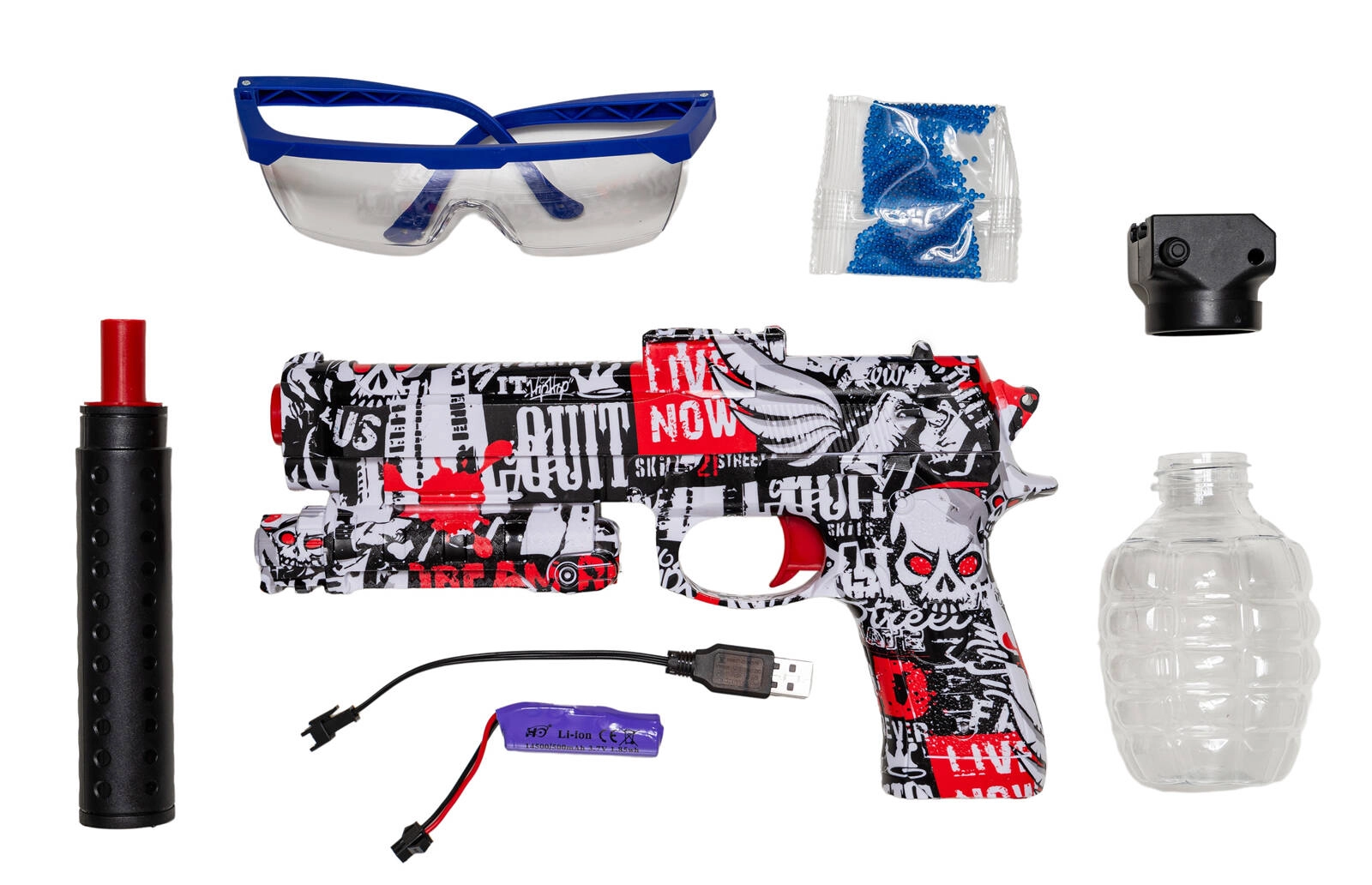 UWAGA! ZDJĘCIE POGLĄDOWE. WZÓR MALOWANIA PISTOLETU MOŻE NIEZNACZNIE RÓŻNIĆ SIĘ OD TEGO PRZEDSTAWIONEGO NA FOTOGRAFII. ZESTAW NIE ZAWIERA GOTOWYCH KULEK ŻELOWYCH.