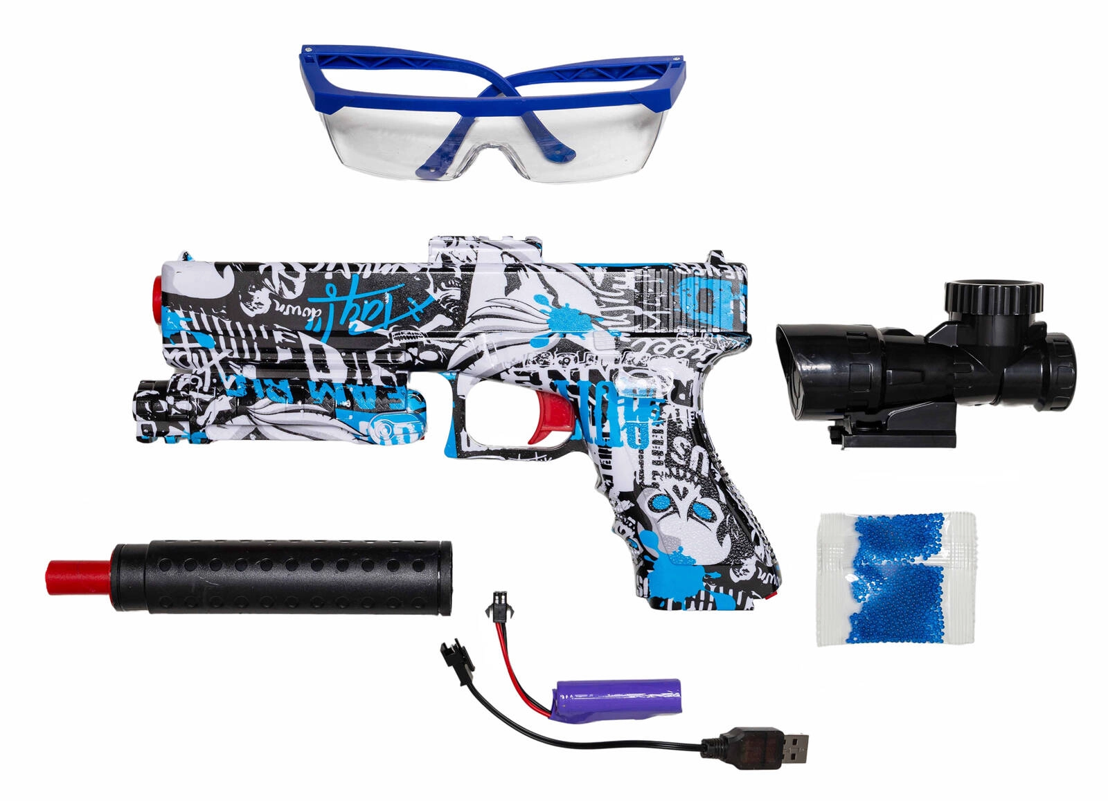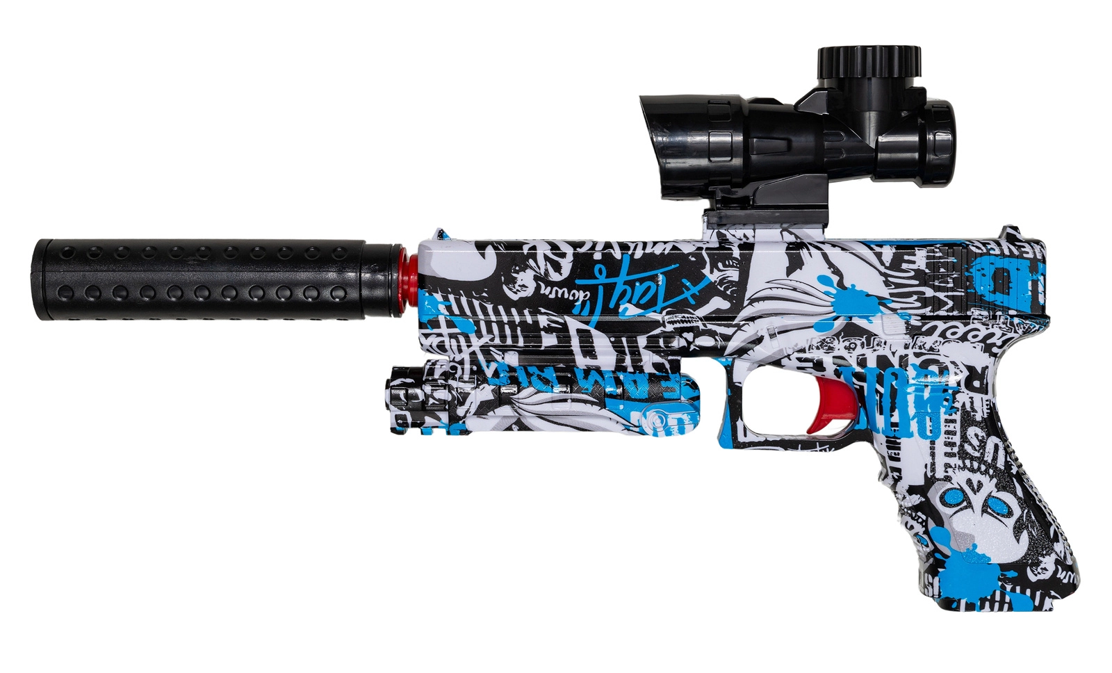 UWAGA! ZDJĘCIE POGLĄDOWE. WZÓR MALOWANIA PISTOLETU MOŻE NIEZNACZNIE RÓŻNIĆ SIĘ OD TEGO PRZEDSTAWIONEGO NA FOTOGRAFII. ZESTAW NIE ZAWIERA GOTOWYCH KULEK ŻELOWYCH.