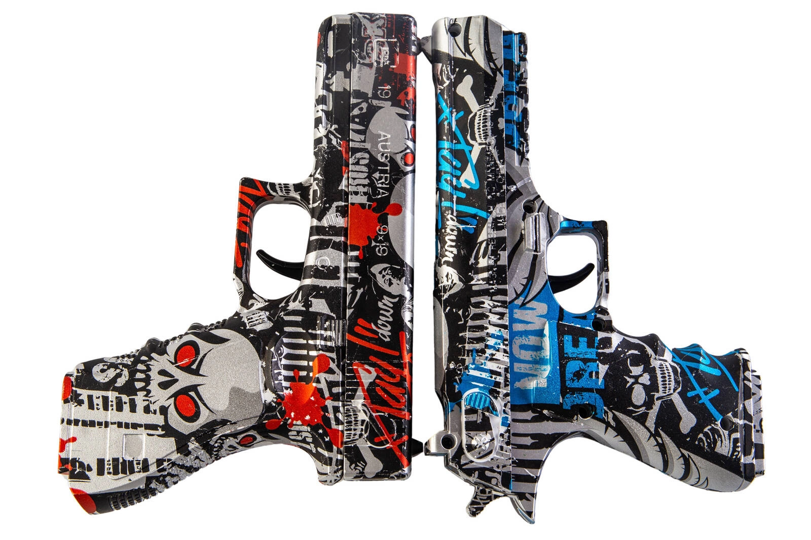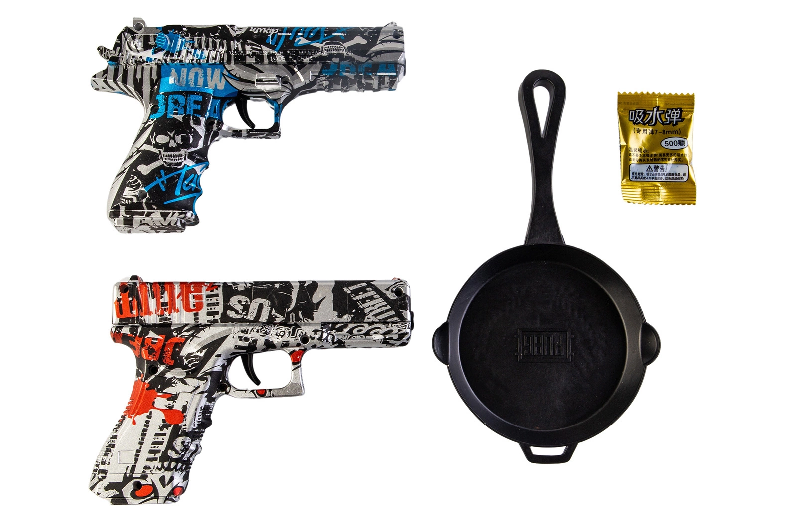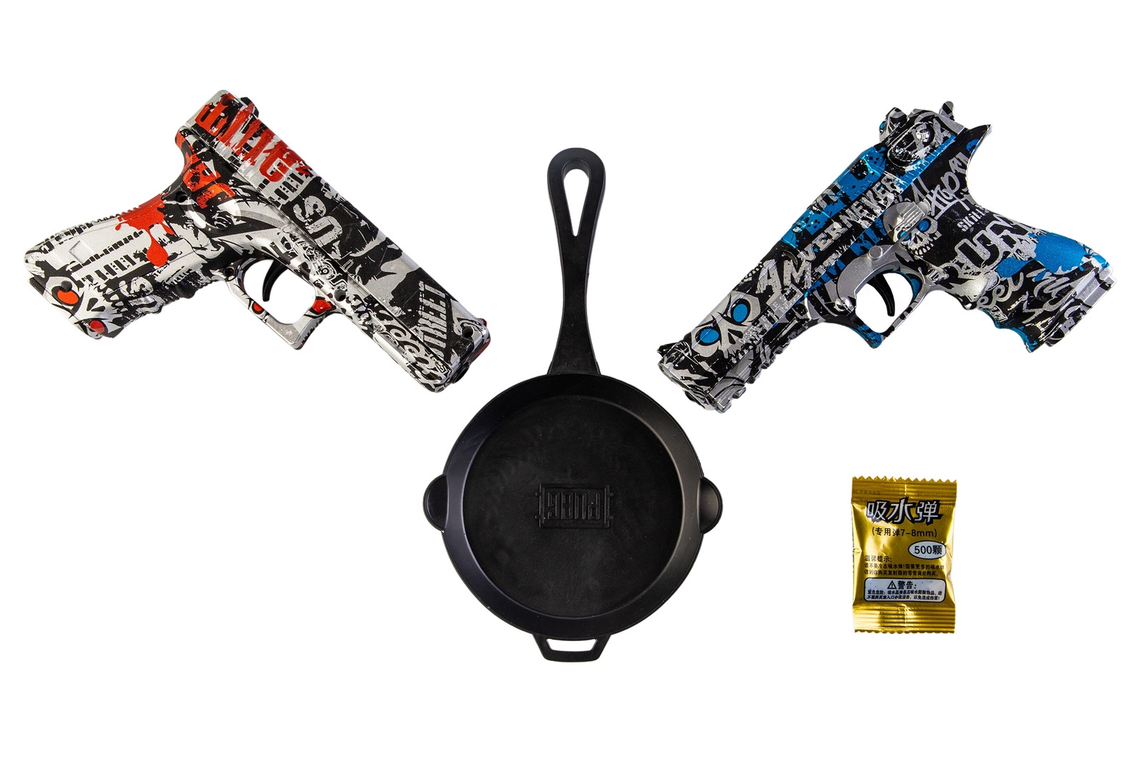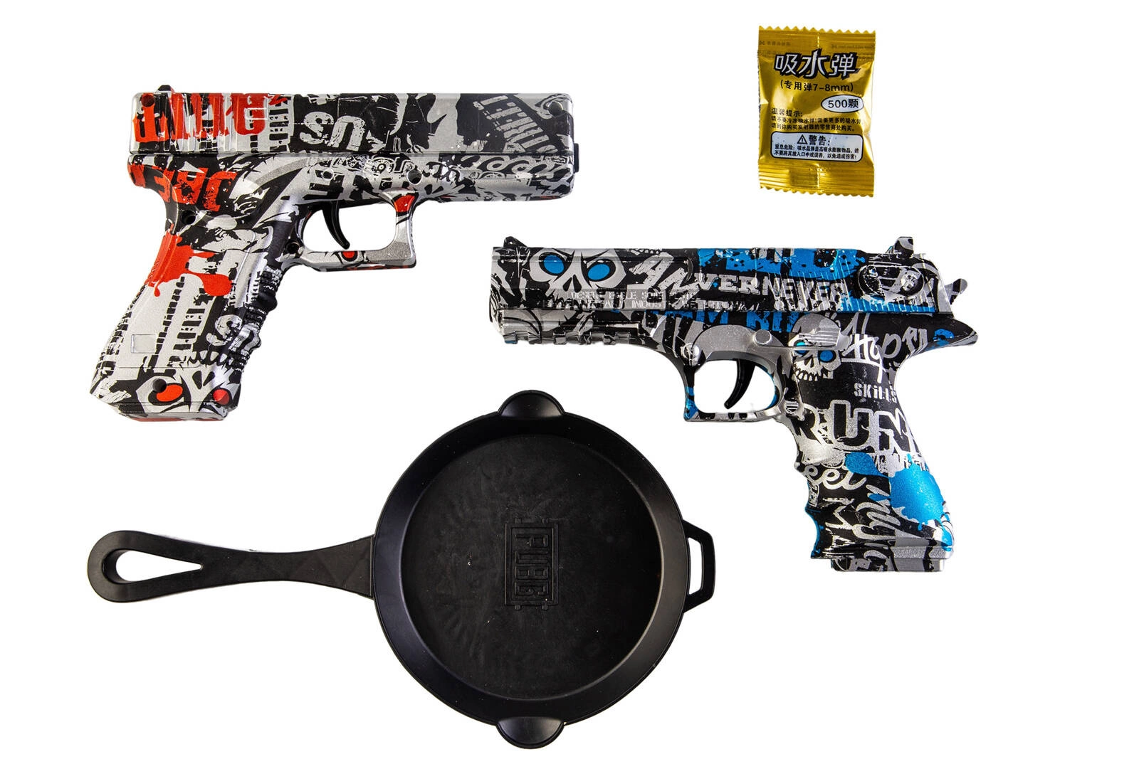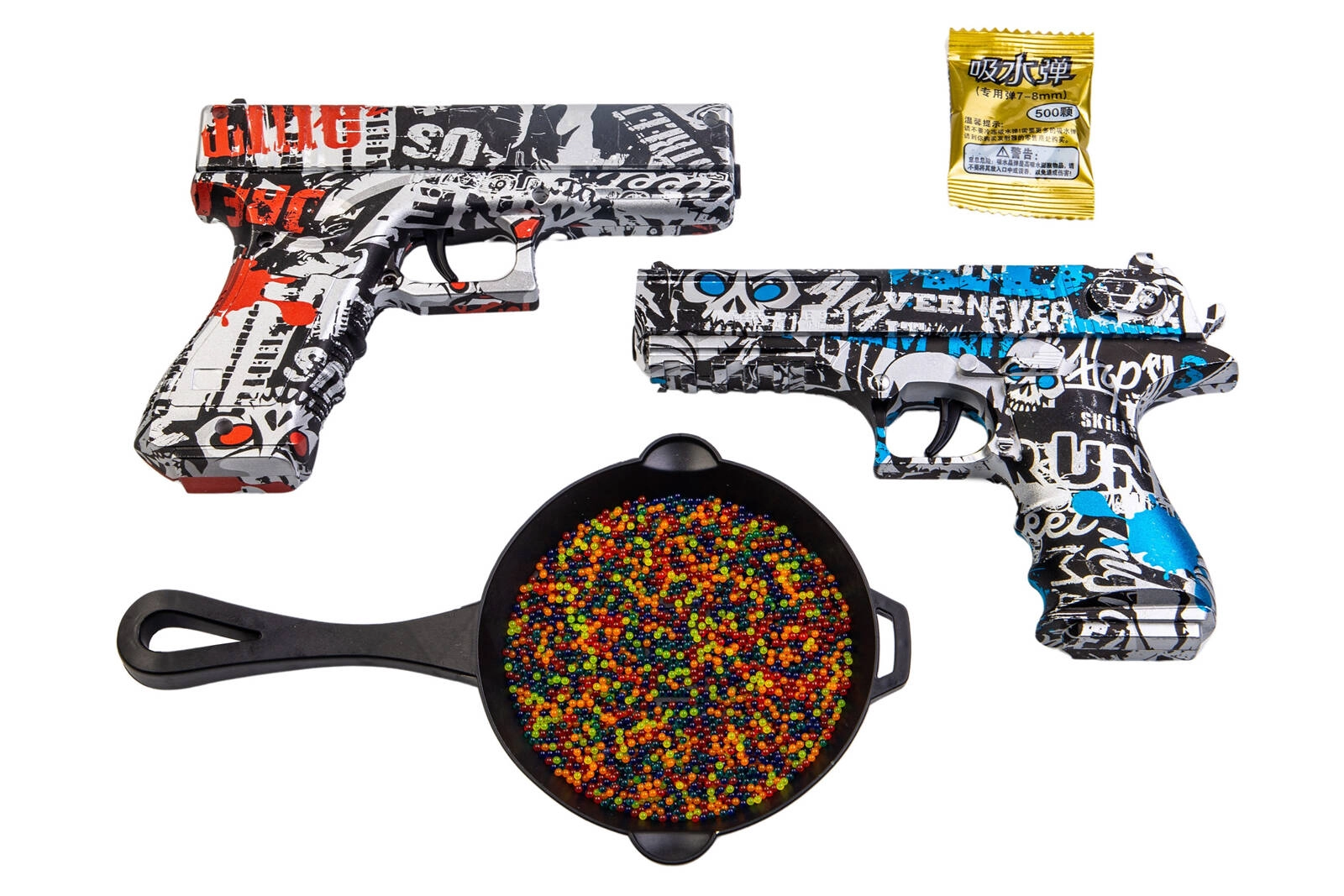 Ekscytujący zestaw dwóch pistoletów sprężynowych strzelających żelowymi kulkami o rozmiarze 7-8mm. Jeden z pistoletów jest repliką G. w kolorze czarno-czerwonego graffiti, drugi jest repliką DE w kolorze czarno-niebieskiego graffiti. Wykonane zostały z wytrzymałego tworzywa sztucznego. W zestawie znajduje się zabawkowa patelnia oraz saszetka z 500 szt. kulek żelowych w proszku.