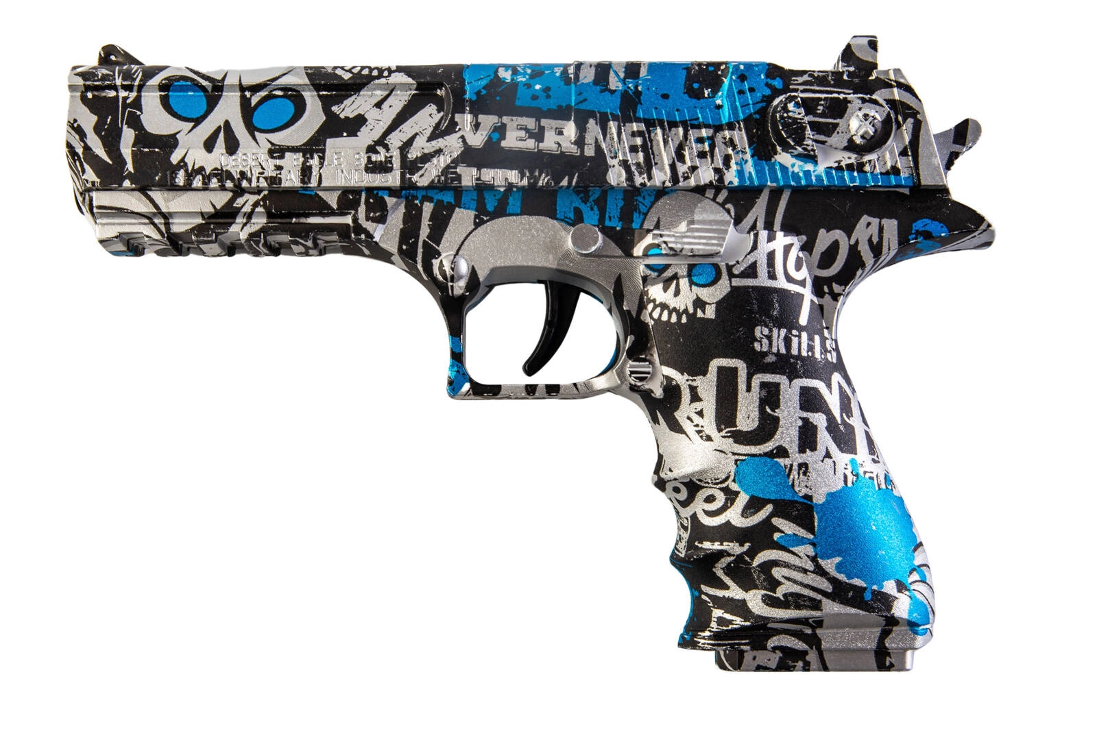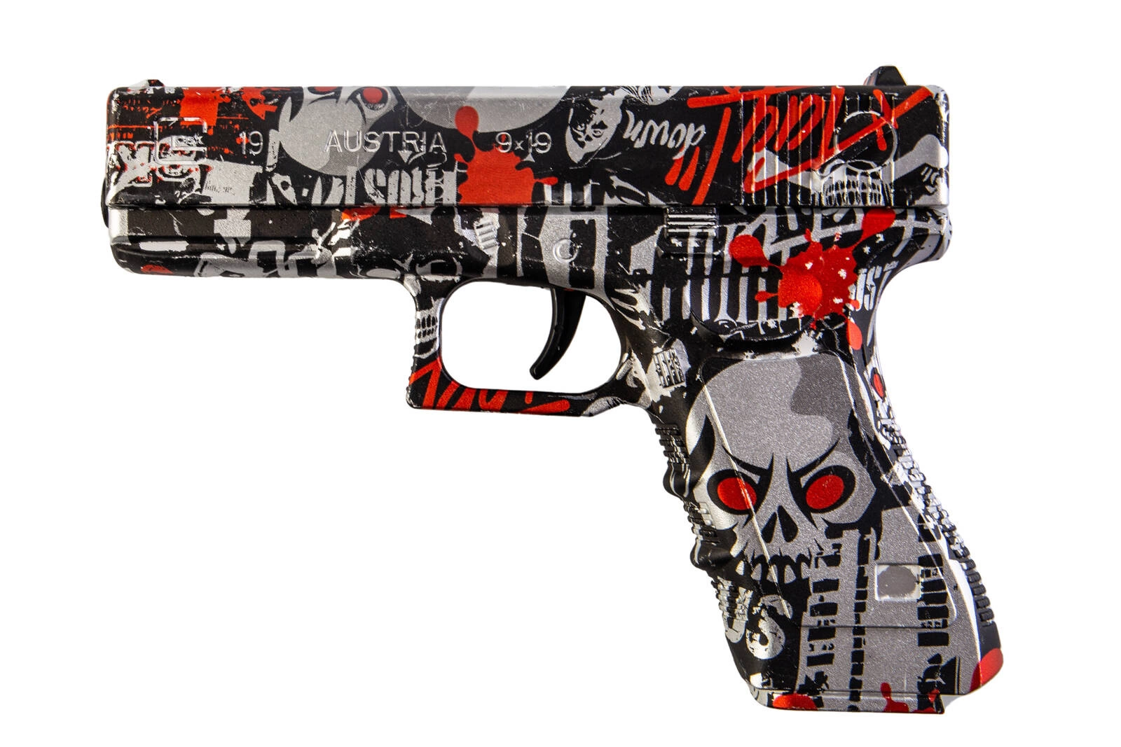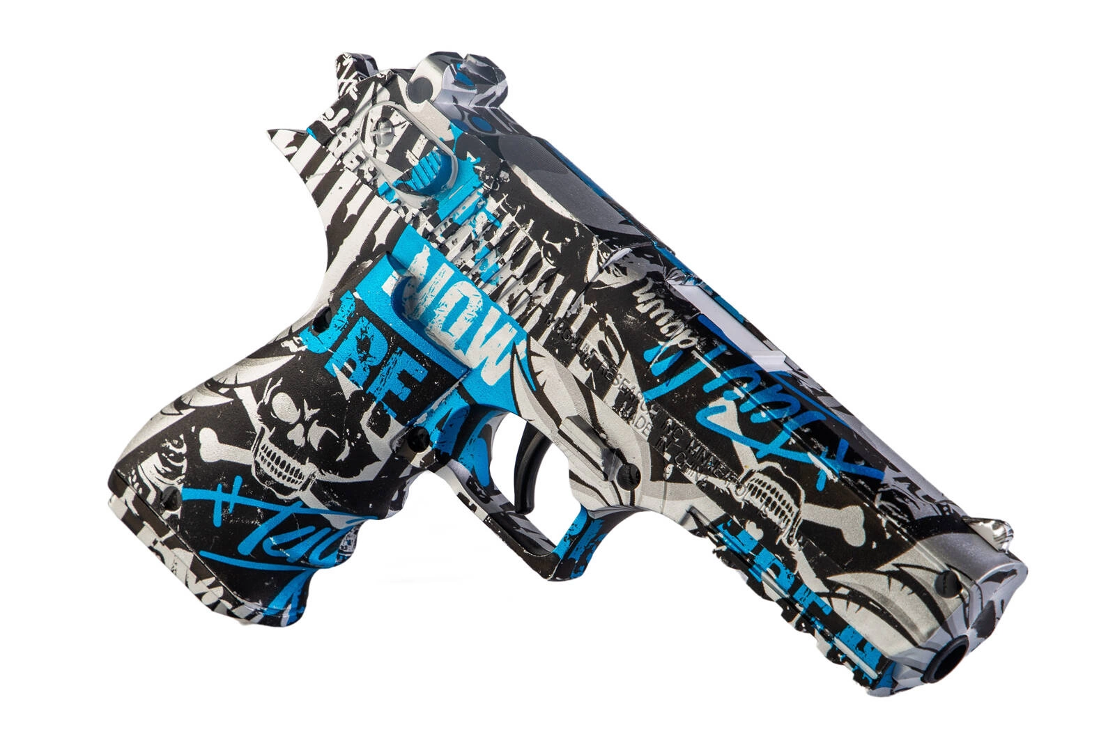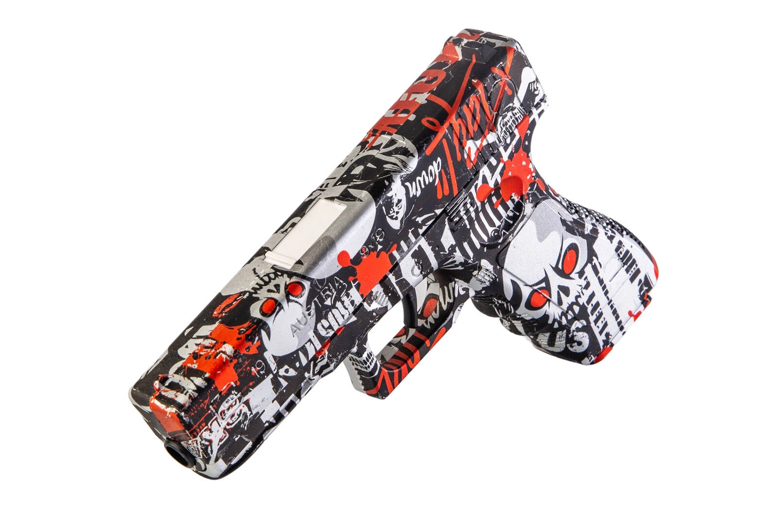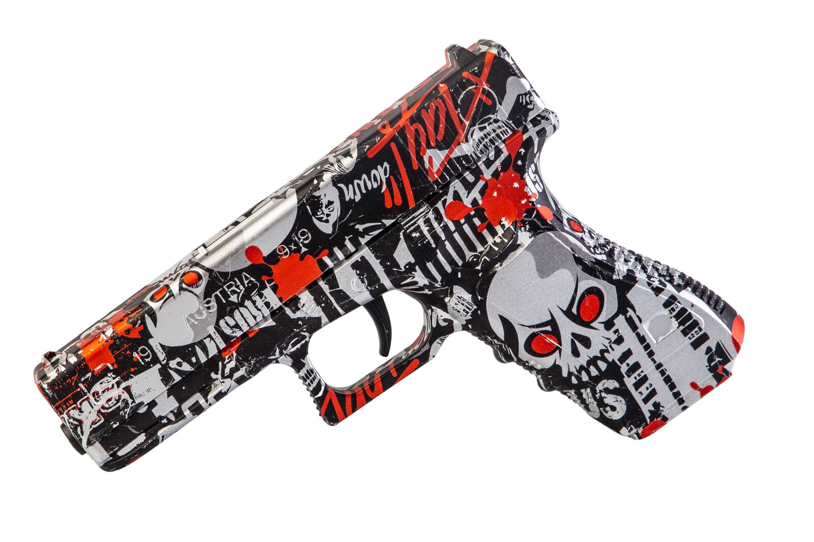 Ekscytujący zestaw dwóch pistoletów sprężynowych strzelających żelowymi kulkami o rozmiarze 7-8mm. Jeden z pistoletów jest repliką G. w kolorze czarno-czerwonego graffiti, drugi jest repliką DE w kolorze czarno-niebieskiego graffiti. Wykonane zostały z wytrzymałego tworzywa sztucznego. W zestawie znajduje się zabawkowa patelnia oraz saszetka z 500 szt. kulek żelowych w proszku.