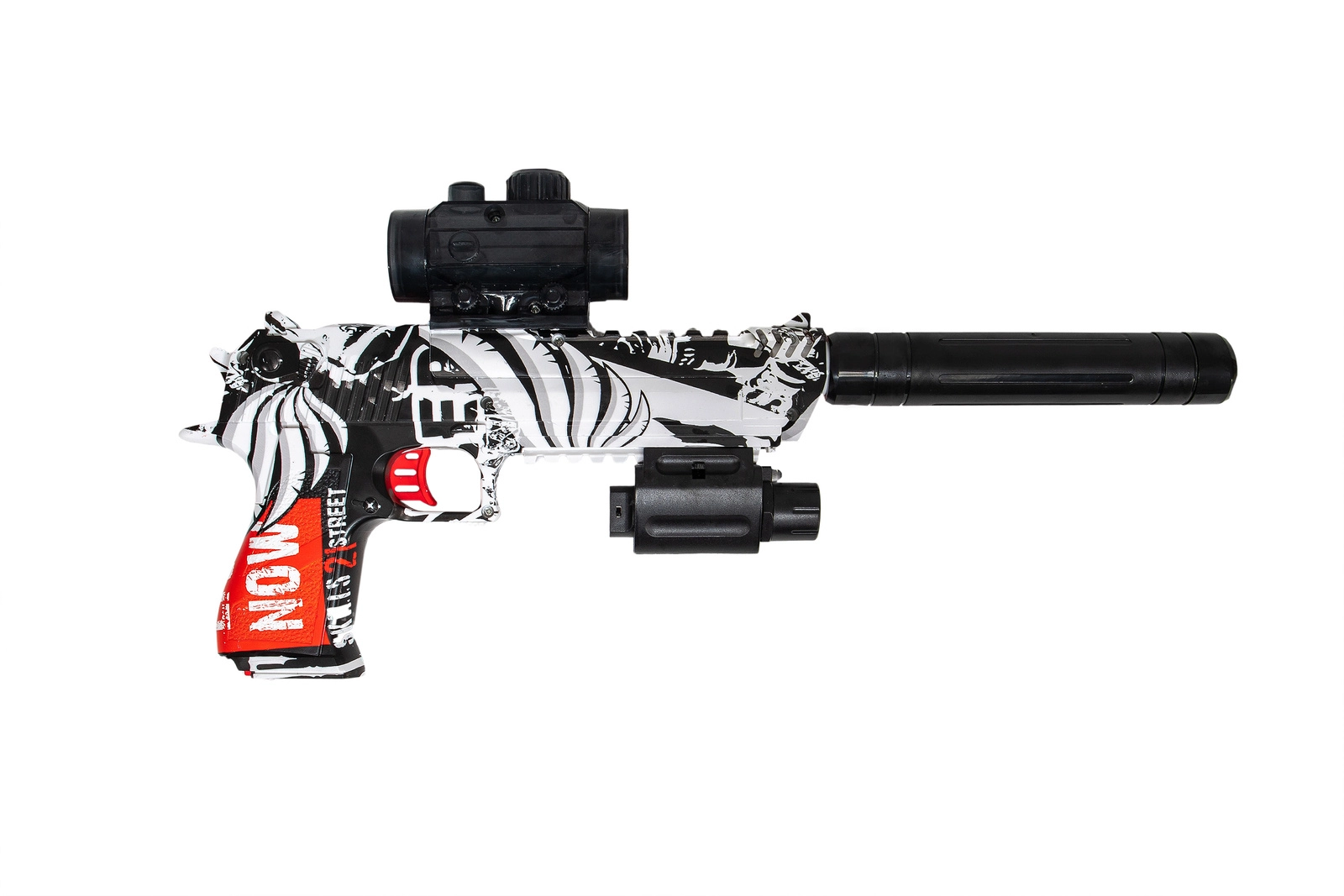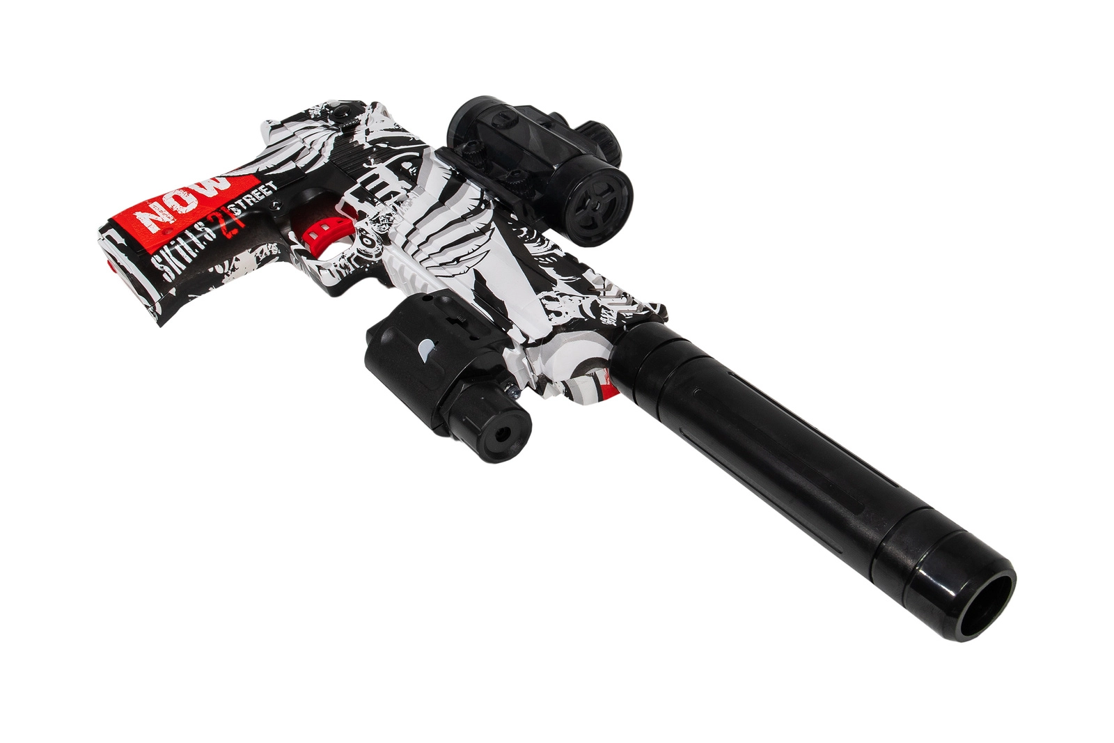Dzięki dołączonemu w zestawie tłumikowi pistolet osiąga całkowitą długość AŻ 40 CM !!!
