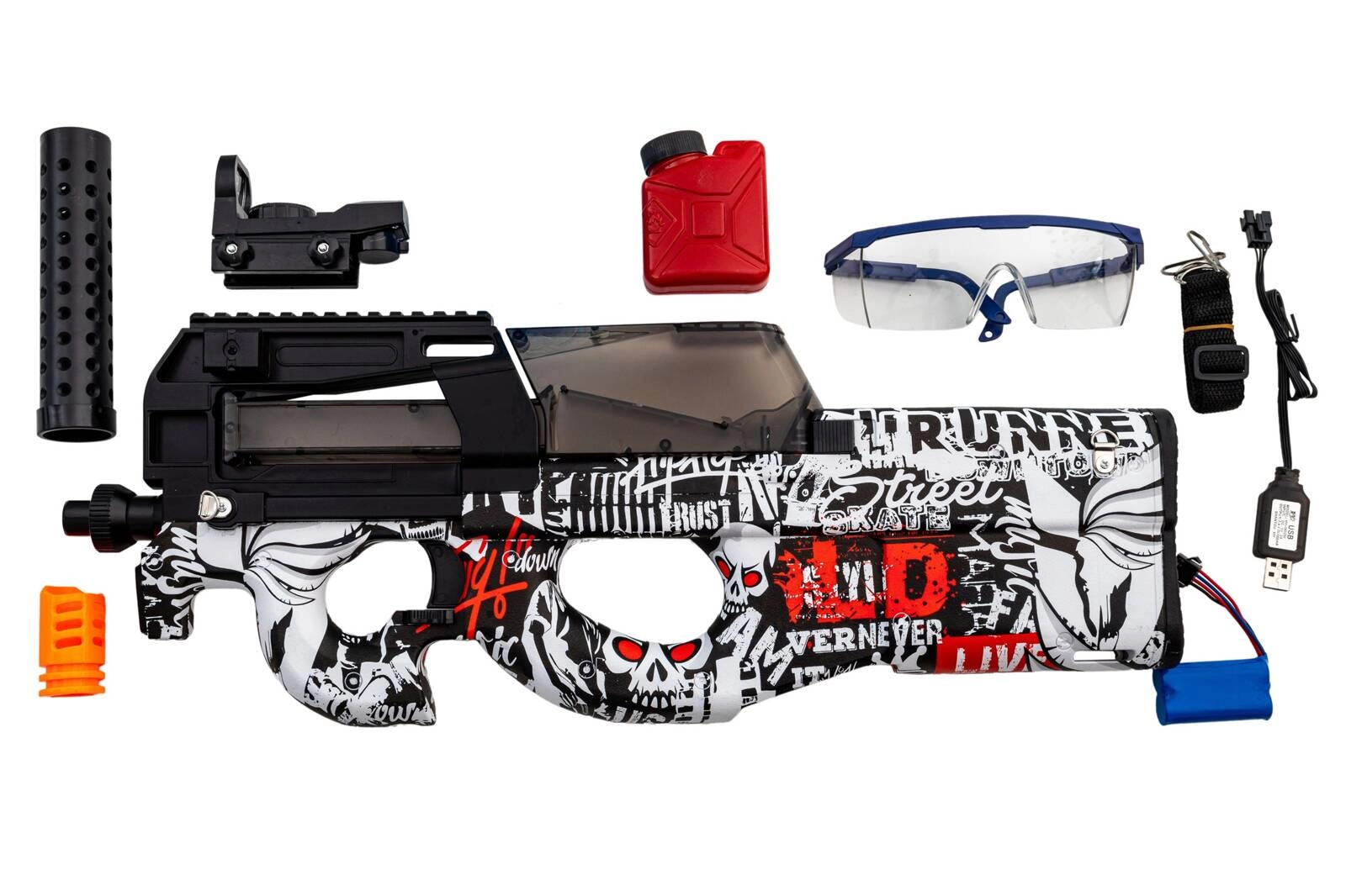 Replika słynnego, belgijskiego karabinka szturmowego P90 na żelowe kulki napędzana akumulatorem. Karabinek strzela ogniem ciągłym!
