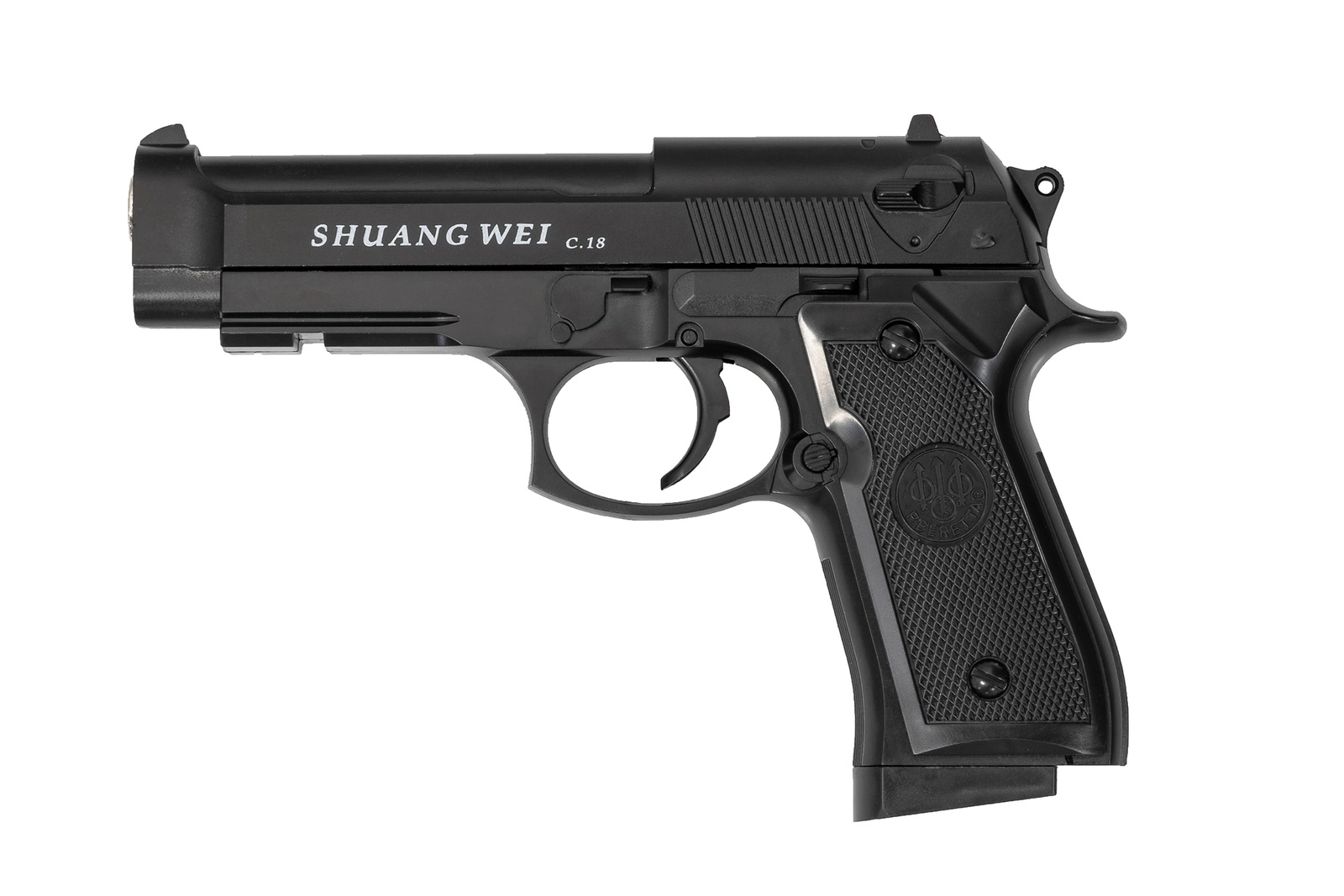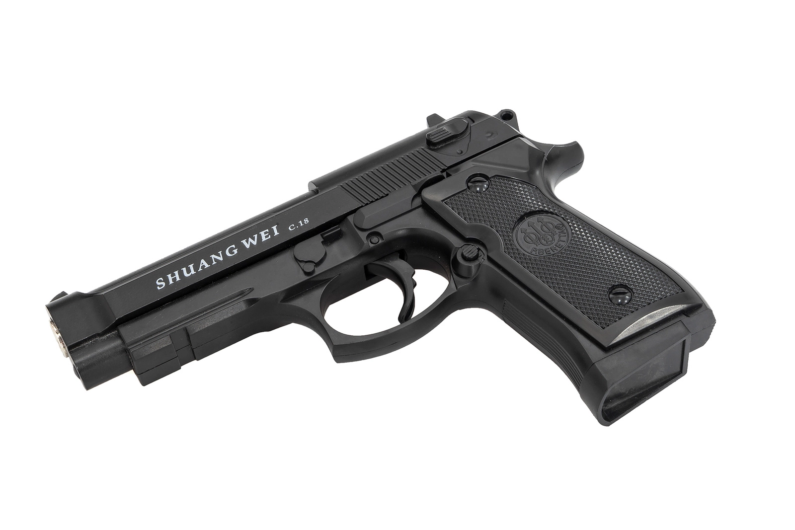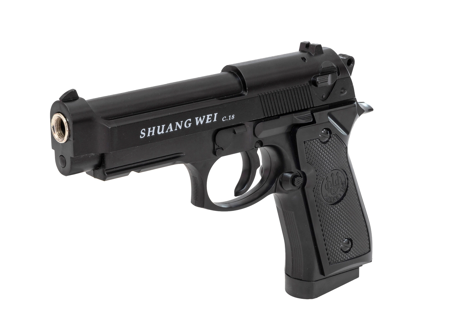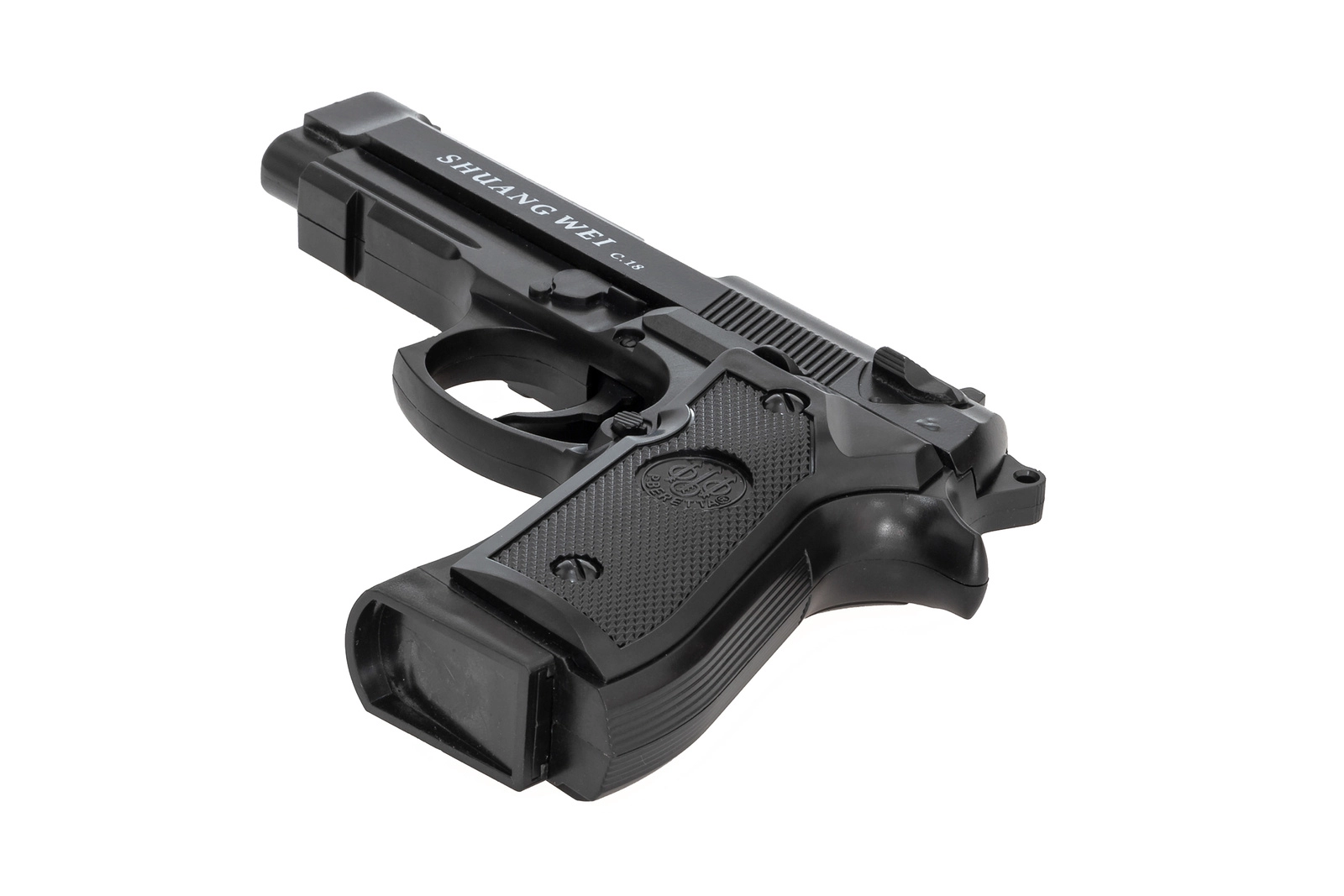 Znakomita replika pistoletu Beretta 92. Pistolety włoskiej firmy Beretta zasłynęły między innymi jako broń podstawowa US Army w tym Navy SEAL. Powyższy model pojawiał się również w wielu filmach, grach i Sieci. Replika posiada oryginalne oznaczenia i niemal identyczny kształt palnego odpowiednika. Zaletą repliki jest chwyt pistoletowy z okładzinami zapobiegającymi wyślizgnięciu z ręki oraz powiększony magazynek mieszczący 12 kulek.