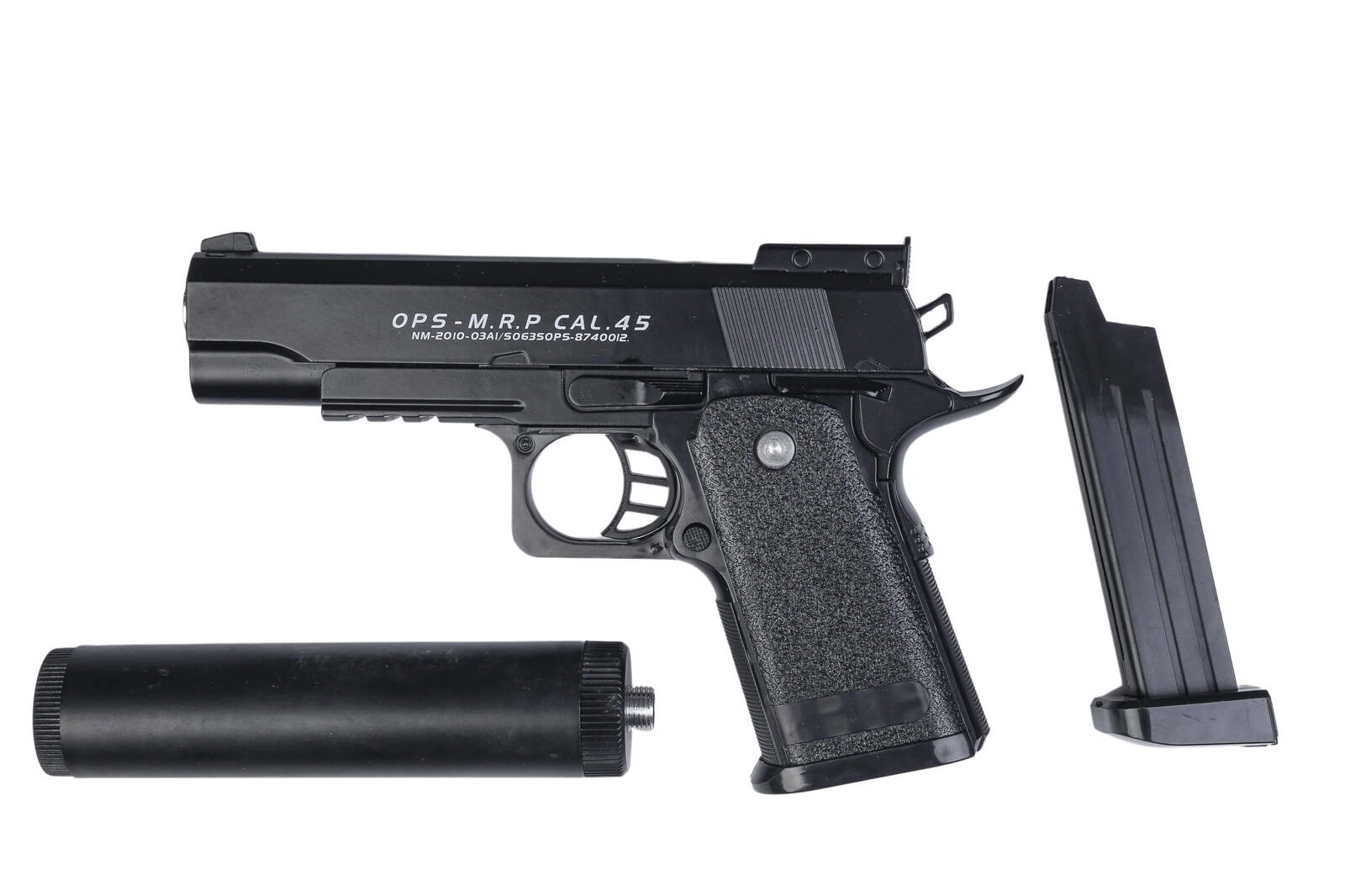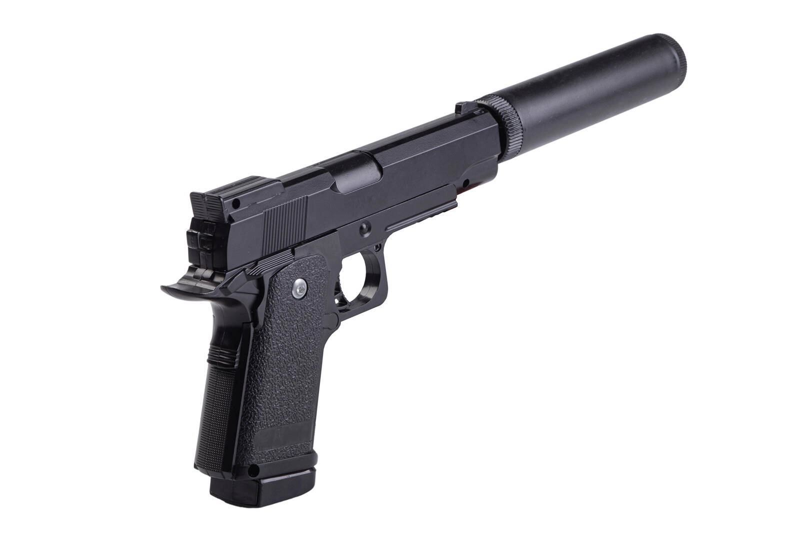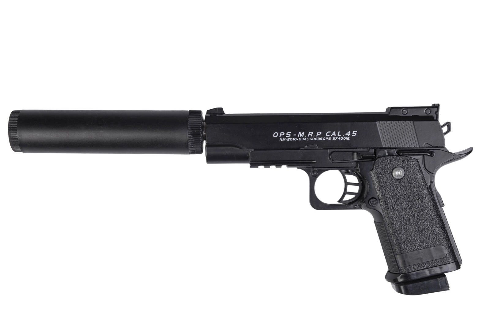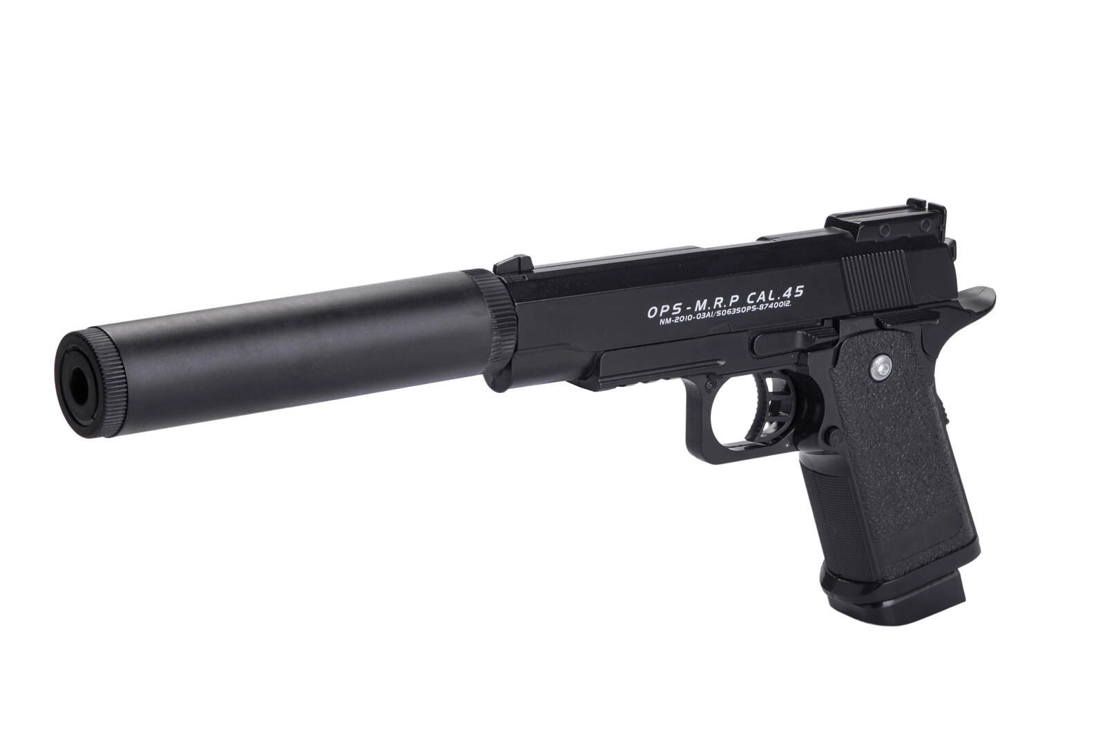 Fantastyczna replika pistoletu Colt 1911 Hi-capa z tłumikiem - Colty serii 1911 już od początku produkcji zdobyły renomę jako jeden z najmocniejszych i najbardziej niezawodnych pistoletów. O ich długowieczności świadczą niezliczone modyfikacje i wydawane licencje na produkcje, które powstają do dziś. Znany jest z wielu filmów, gier i rozgrywek AirSoftowych. Replika odkręcany tłumik i niemal identyczny kształt oryginału.