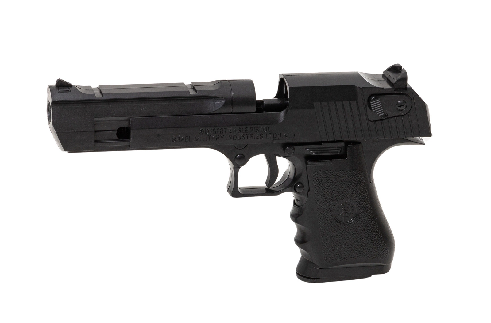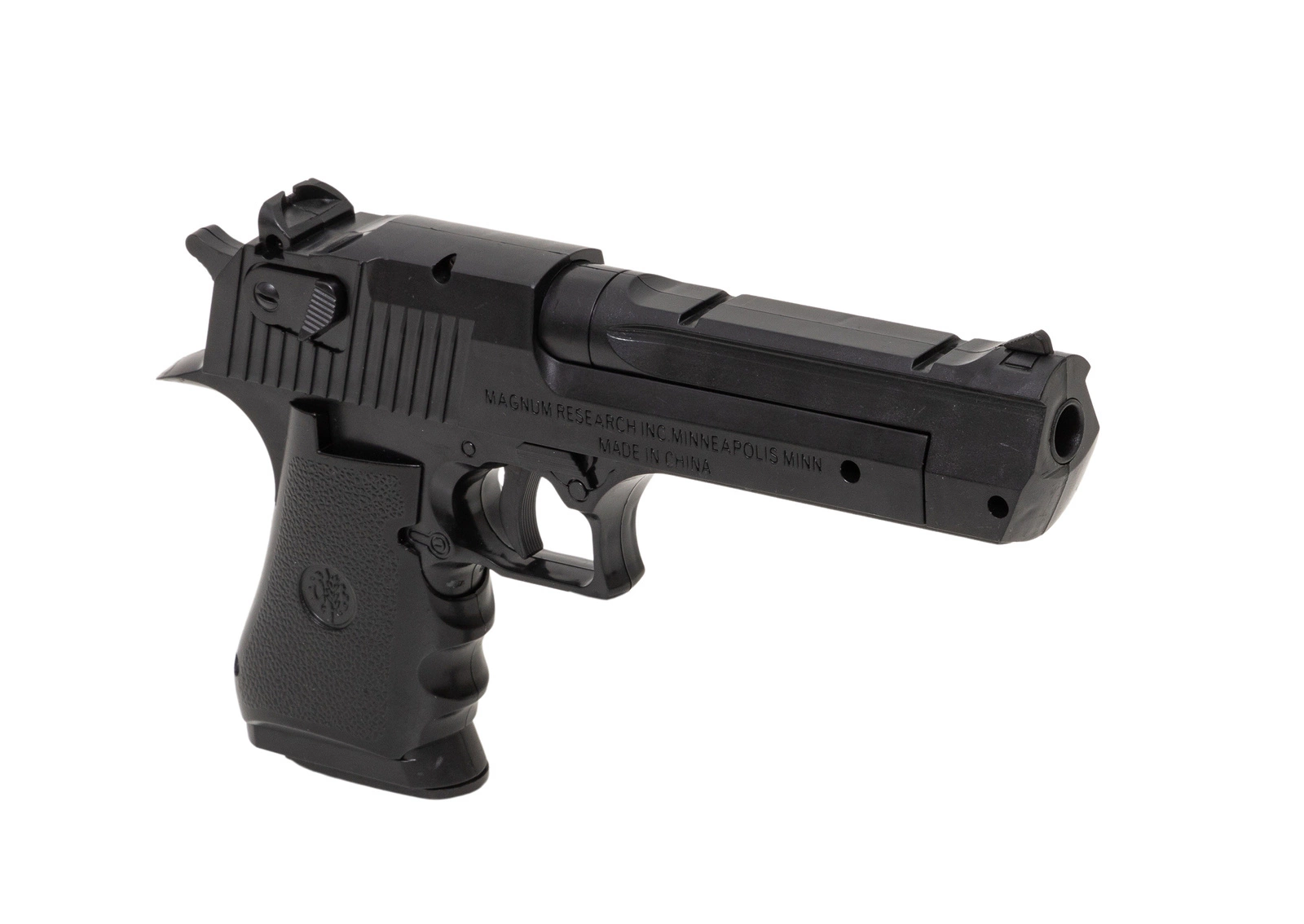 Replika pistoletu sprężynowego Desert Eagle, zaprojektowana do strzelania kulami plastikowymi o średnicy 6 mm. Pistolet wykonany jest głównie z trwałego tworzywa sztucznego, co czyni go lekkim i łatwym w obsłudze. Całość prezentuje się elegancko w kolorze czarnym.