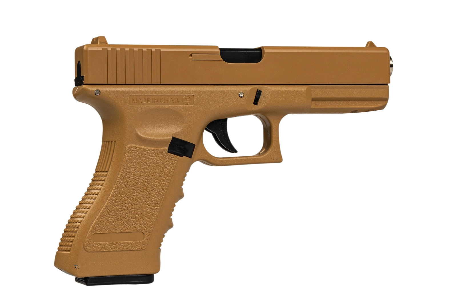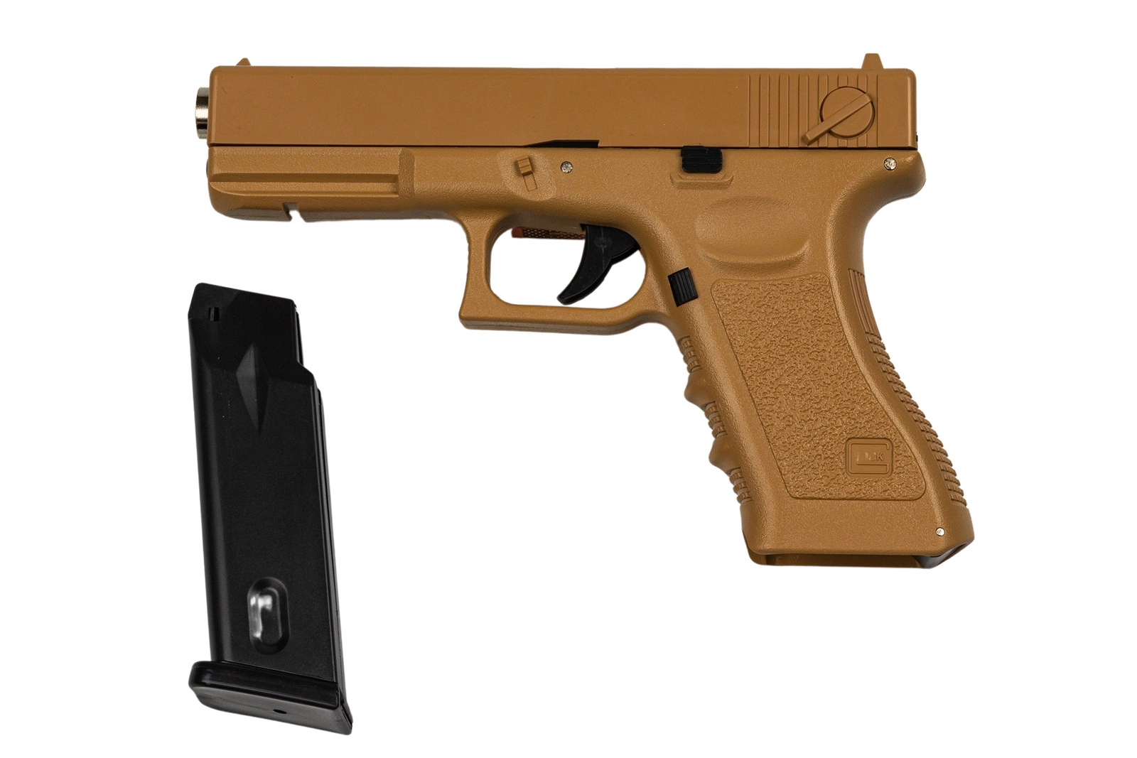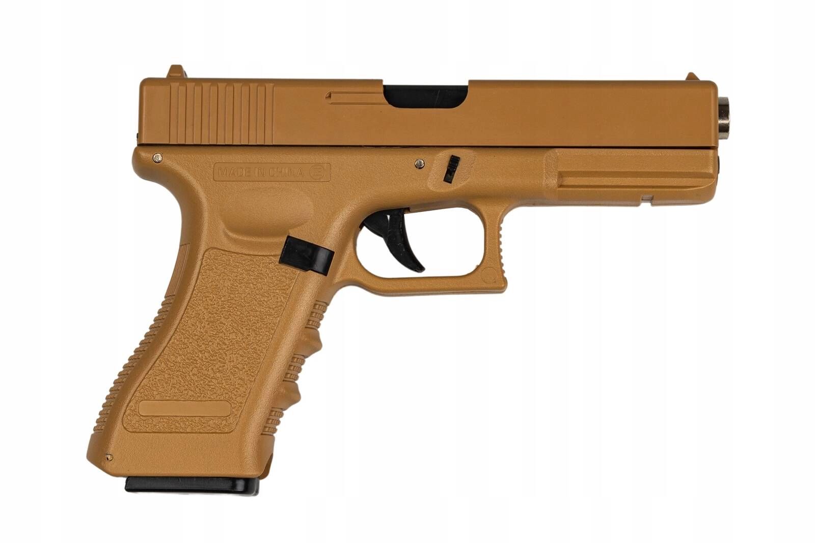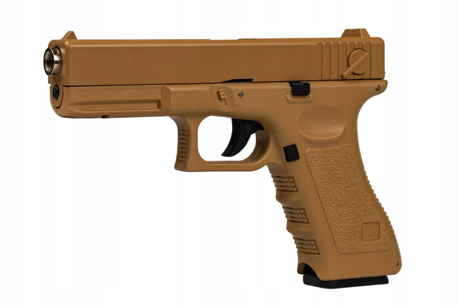 Fantastyczna replika pistoletu G18C w kolorze tan - Prawdziwe, palne modele serii 18 to jedyne samoczynno-samopowtarzalne wersje wśród wersji pistoletów marki Glock. Literka „C” oznacza w nich kompensator podrzutu wykonany w formie dwóch owalnych wycięć na górnej powierzchni lufy i zamka.