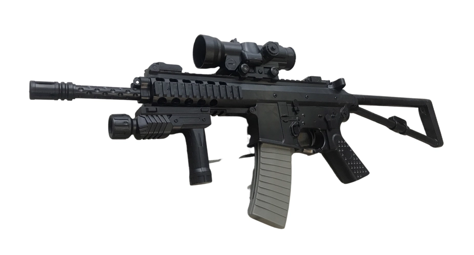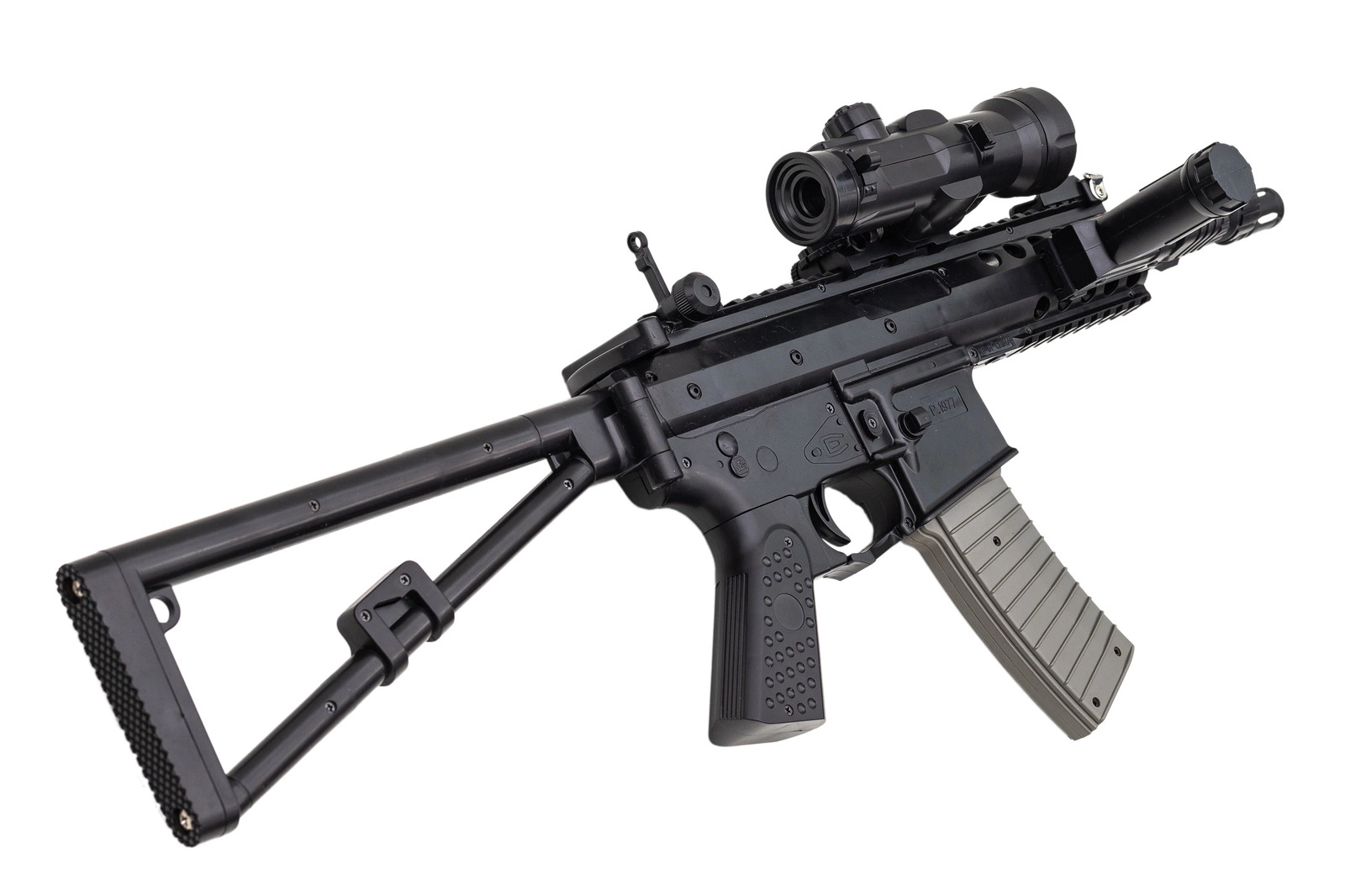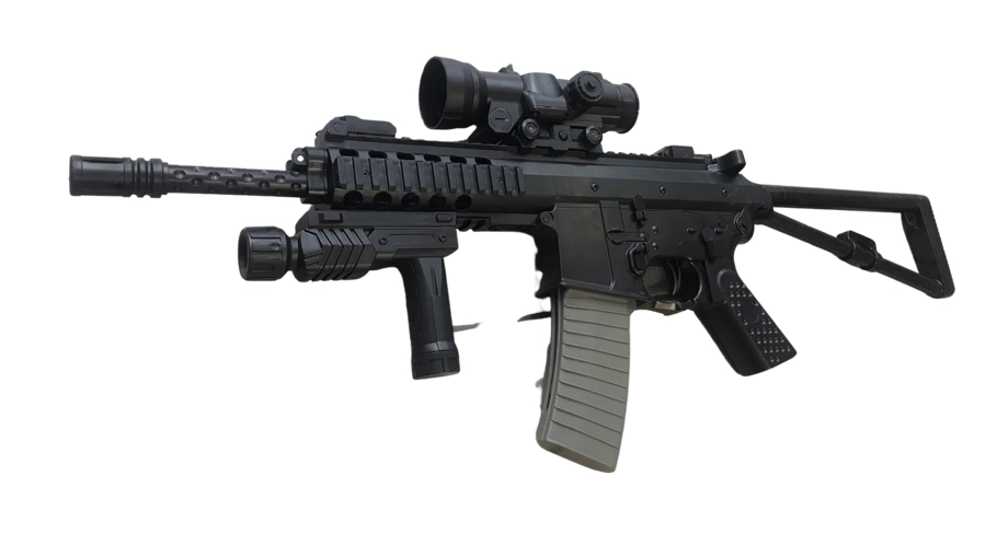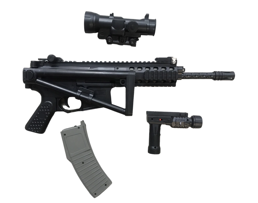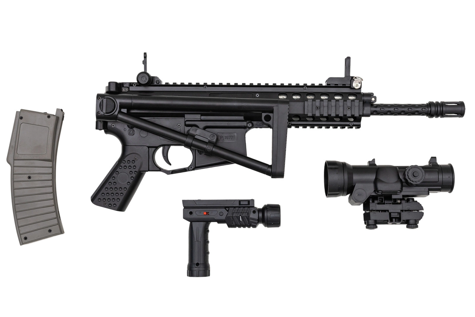 Replika karabinu maszynowego na plastikowe kulki. Karabin jest ciężki, wykonany w większości z bardzo dobrej jakości polimeru z systemem sprężynowym. Swoim wyglądem przypomina kultowe szturmowe bronie z gier komputerowych takich jak np. counter strike. Replika ma czarny kolor, zaś magazynek jest szary. Posiada systemem sprężynowy, oparty na przeładowaniu dźwignią znajdującą się w tylniej części karabinu. Do repliki dołączona jest luneta, latarka, chwyt przedni. Kolba karabinu jest składana na bok, a rękojeść posiada fakturowanie poprawiające chwyt.