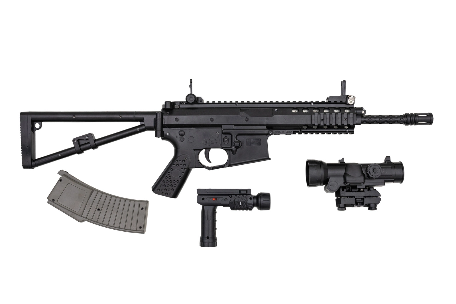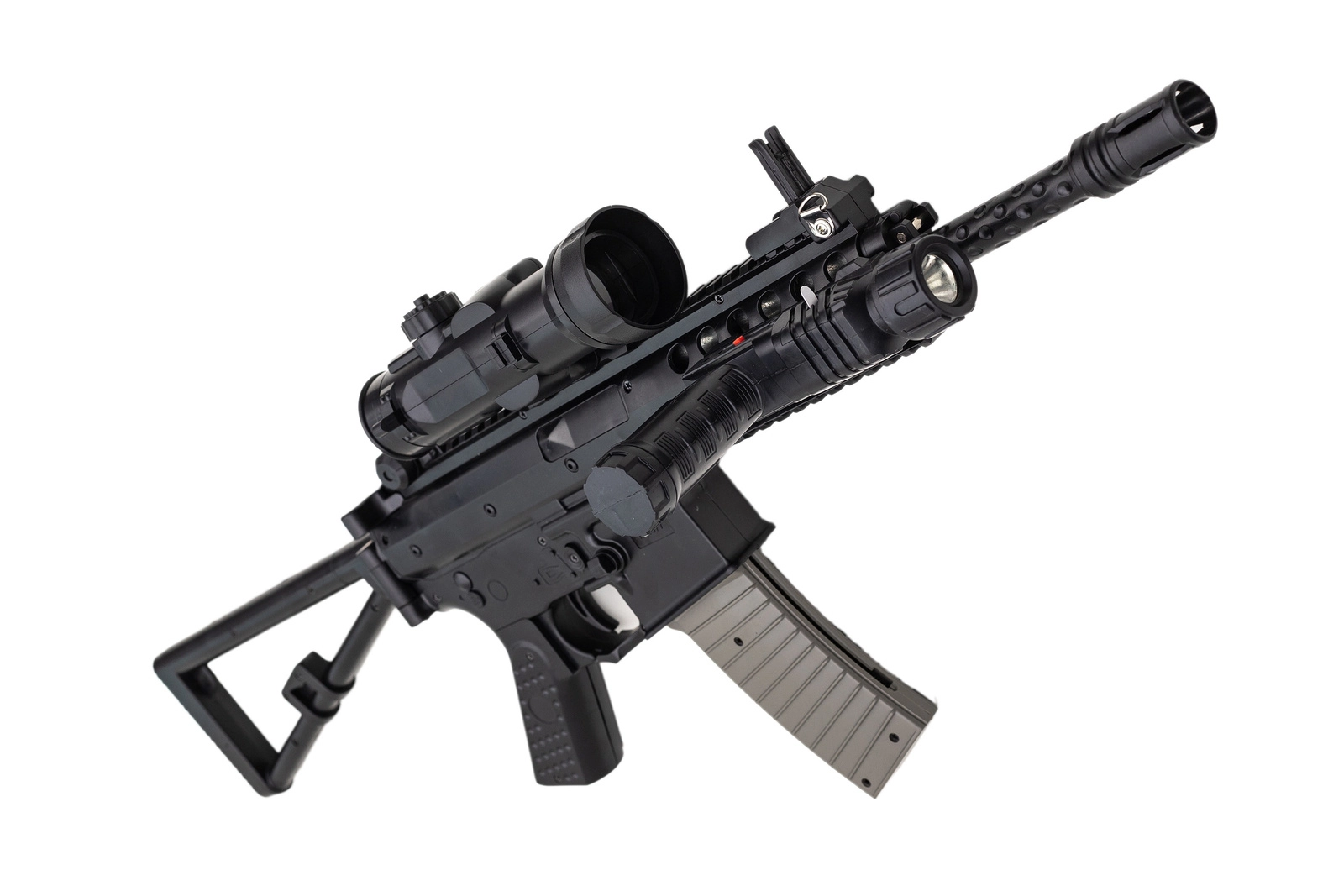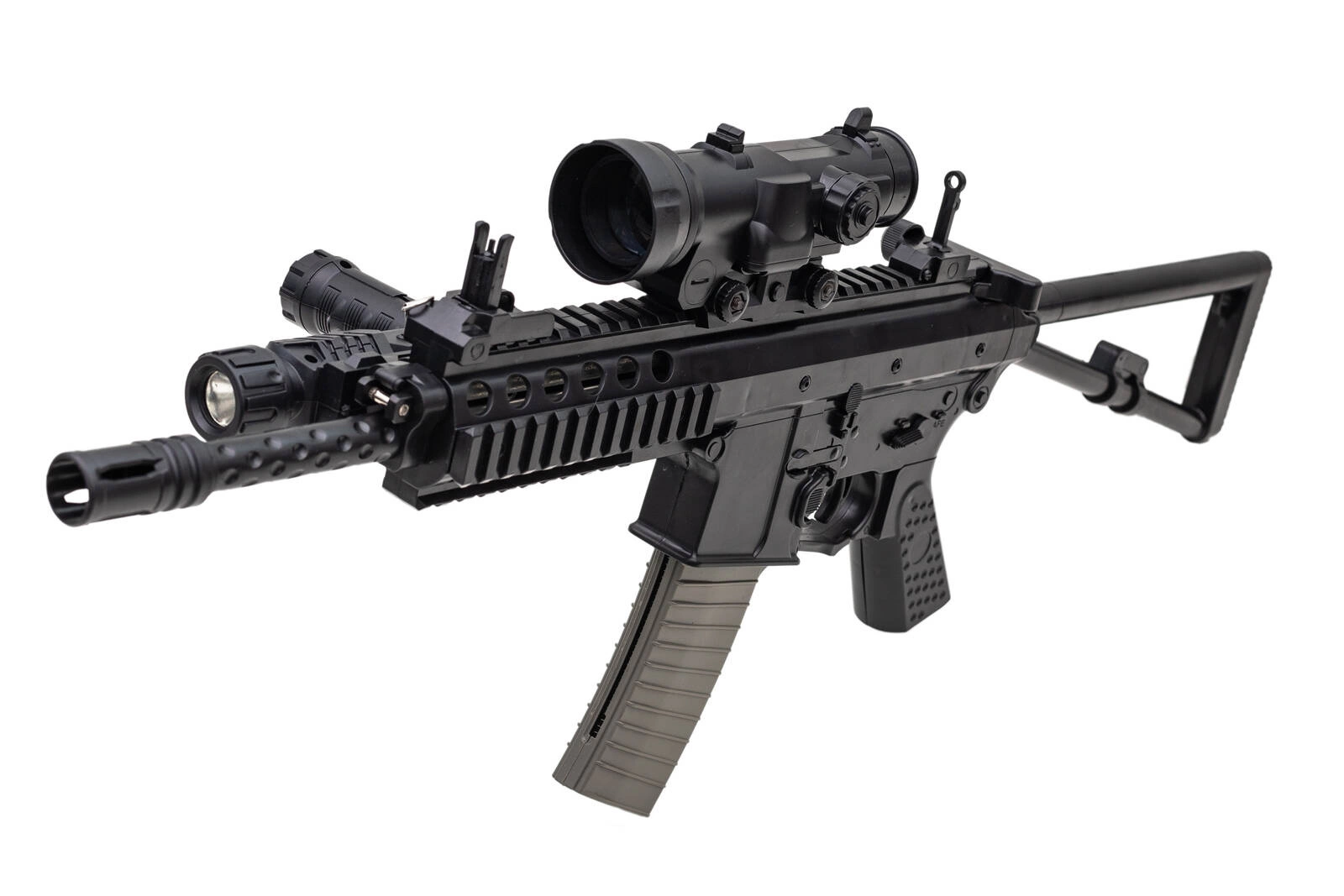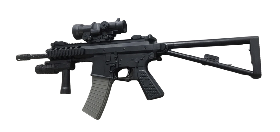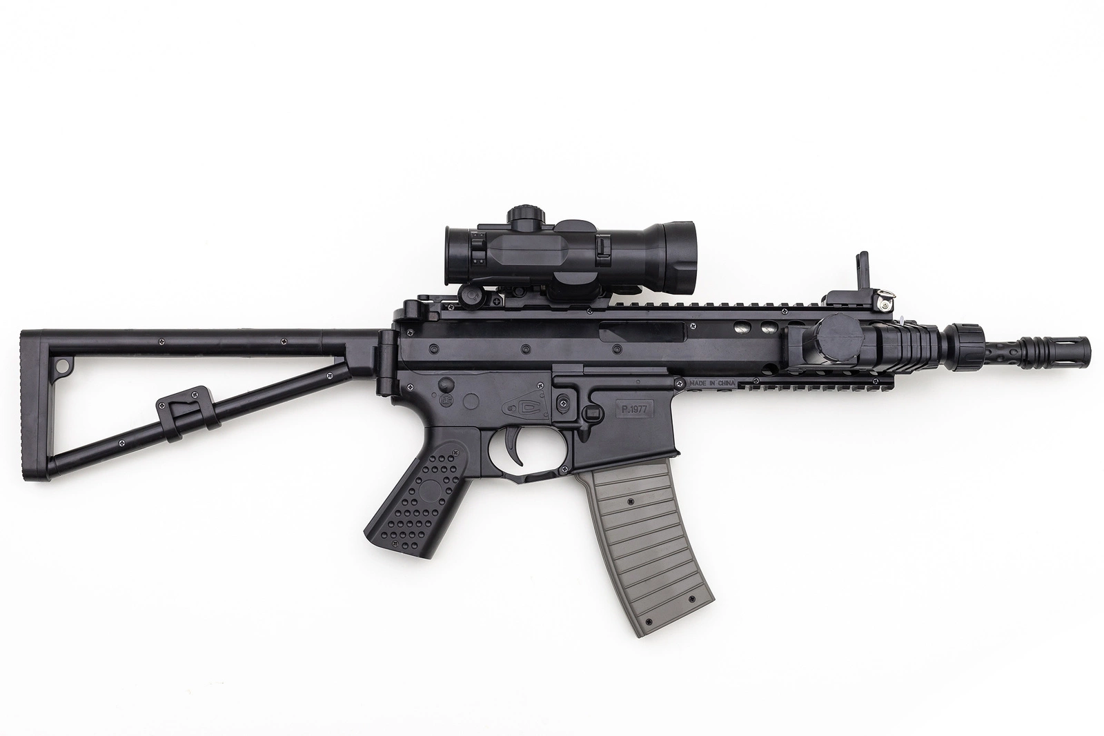Replika karabinu maszynowego na plastikowe kulki. Karabin jest ciężki, wykonany w większości z bardzo dobrej jakości polimeru z systemem sprężynowym. Swoim wyglądem przypomina kultowe szturmowe bronie z gier komputerowych takich jak np. counter strike. Replika ma czarny kolor, zaś magazynek jest szary. Posiada systemem sprężynowy, oparty na przeładowaniu dźwignią znajdującą się w tylniej części karabinu. Do repliki dołączona jest luneta, latarka, chwyt przedni. Kolba karabinu jest składana na bok, a rękojeść posiada fakturowanie poprawiające chwyt.