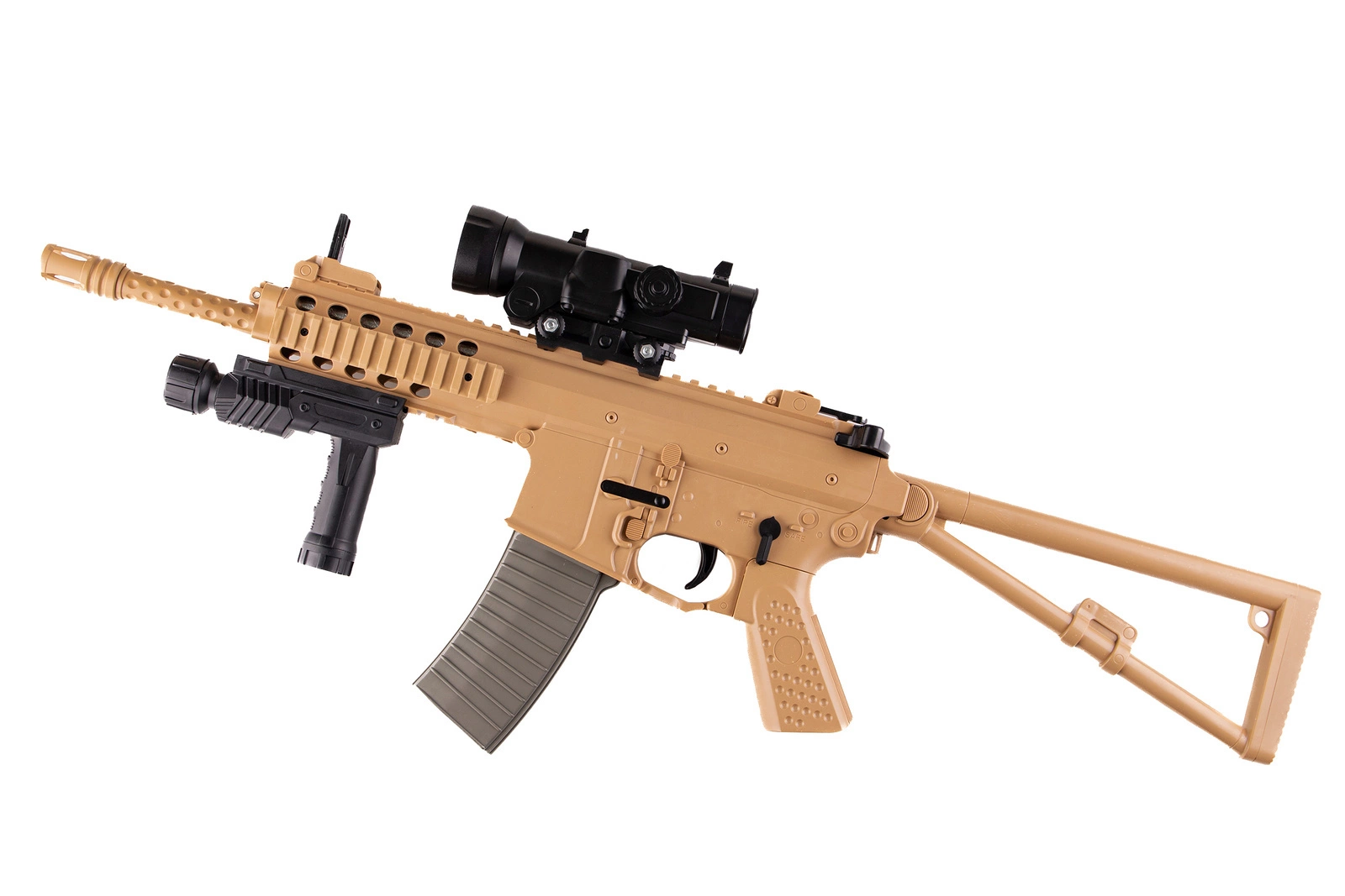 Replika karabinu maszynowego na plastikowe kulki. Karabin jest ciężki, wykonany w większości z bardzo dobrej jakości polimeru z systemem sprężynowym. Swoim wyglądem przypomina kultowe szturmowe bronie z gier komputerowych takich jak np. counter strike. Replika ma czarny kolor, zaś magazynek jest szary. Posiada systemem sprężynowy, oparty na przeładowaniu dźwignią znajdującą się w tylniej części karabinu. Do repliki dołączona jest luneta, latarka, chwyt przedni. Kolba karabinu jest składana na bok, a rękojeść posiada fakturowanie poprawiające chwyt.
