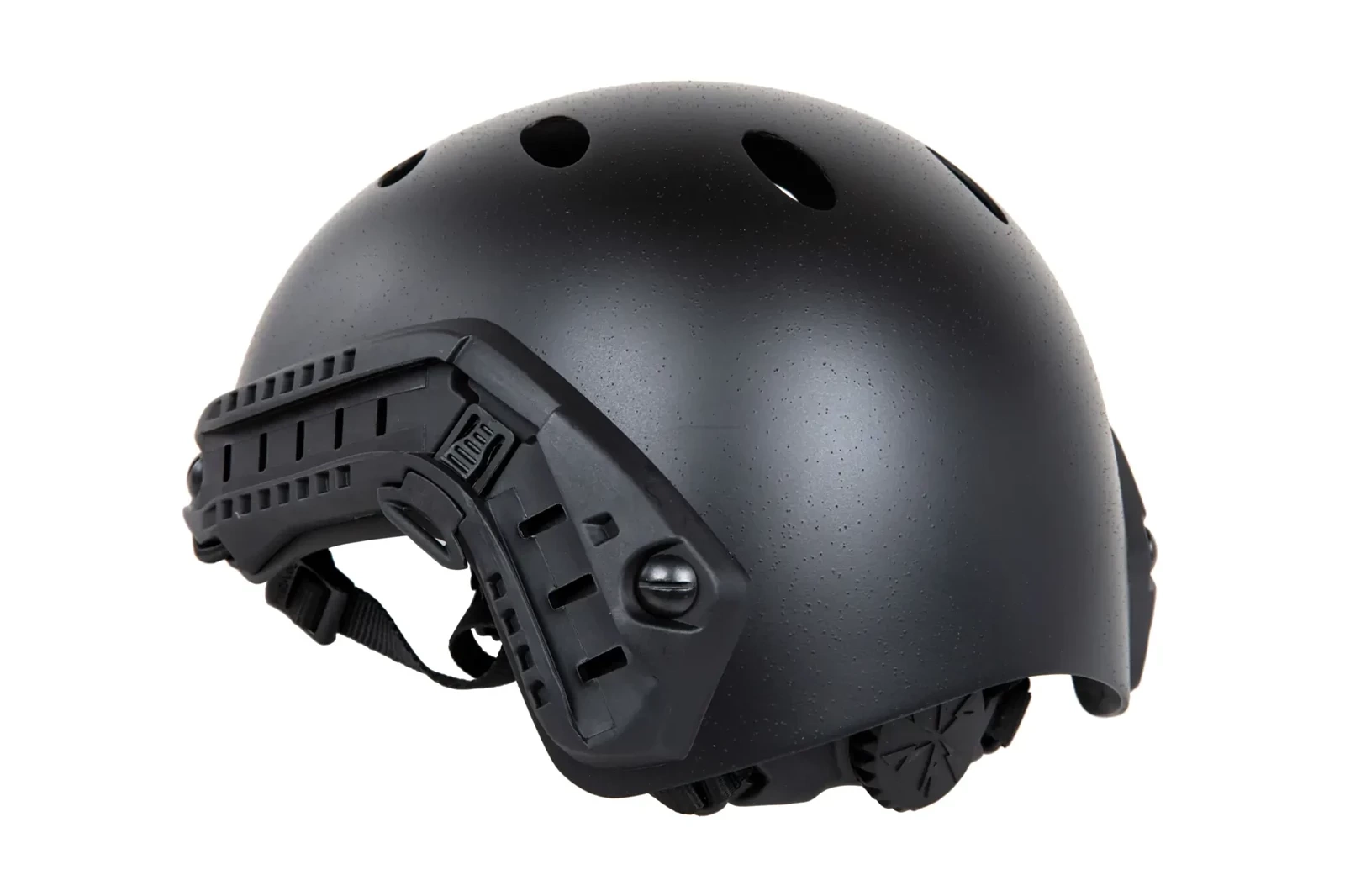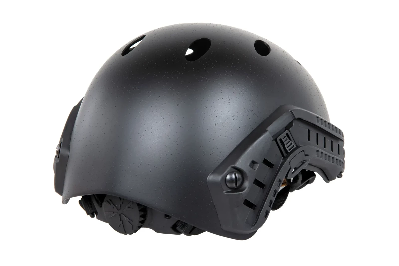 Hełm PJ od firmy FMA posiada regulowany fasunek zapinany na klamrę fastex, z tyłu hełmu znajduje się pokrętło, które pozwala na dostosowanie obwodu do użytkownika a po bokach zamocowane są szyny, które umożliwią podpięcie dodatkowych akcesoriów takich jak: gogle, latarka czy ochronniki słuchu.