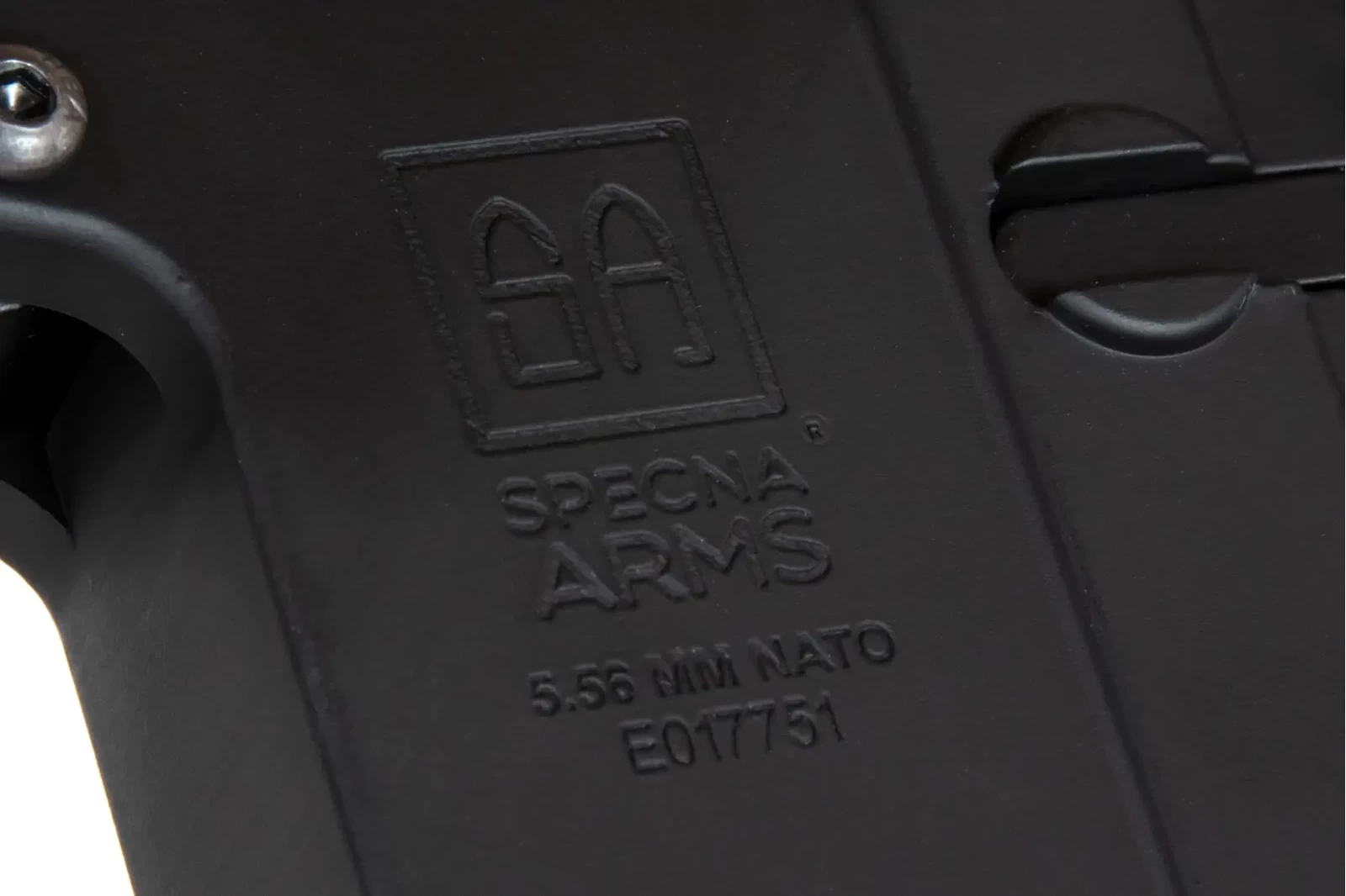 Każdy element repliki został wykonany oraz spasowany z dbałością o każdy szczegół, dodatkowo do wykończenia korpusu użyto powłoki Nano Coating zapobiegającej zarysowaniom. Na korpusie umieszczono głęboko grawerowane oznaczenia Specna Arms oraz indywidualny numer seryjny. Warte uwagi detale to chwyt pistoletowy QD, zapewniający łatwy i szybki dostęp do silnika bez konieczności użycia narzędzi, oraz obustronne ucho do montażu zawieszenia taktycznego.