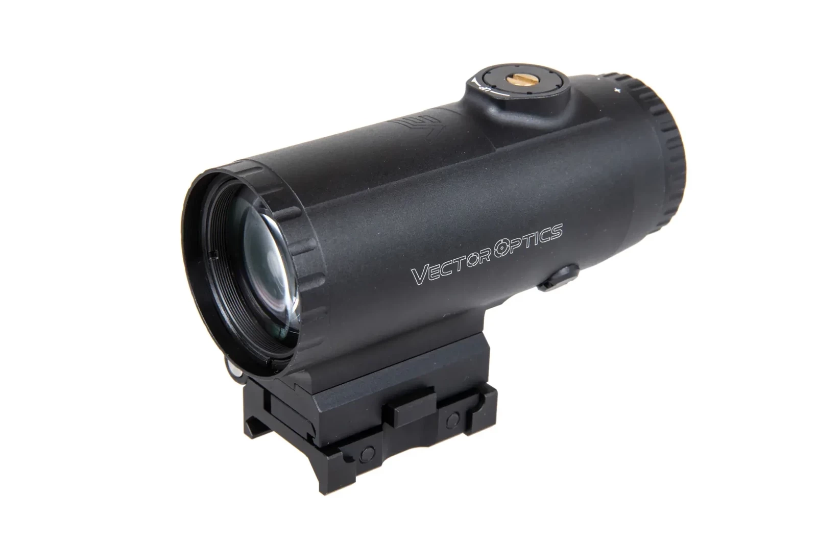 Magnifier marki Vector Optics został wykonany w całości z aluminium 6061 T6, co zapewnia mu wysoką wytrzymałość oraz odporność na czynniki zewnętrzne. Dzięki montażowi w standardzie RIS / Picatinny, celownik możemy zainstalować na każdej replice ze standardową szyną 22mm.