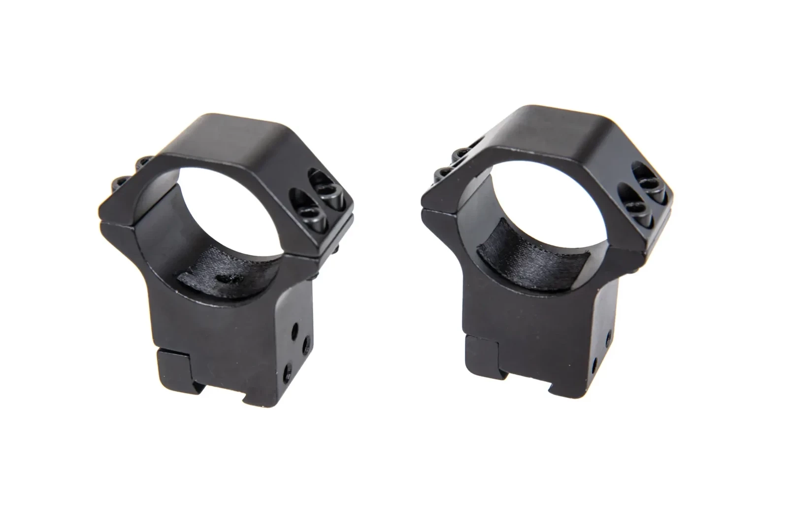 Wysokiej jakości zestaw składający się z dwóch pierścieni montażowych wykonanych z aluminium. Za stabilną podstawę celownika odpowiadają dwie obręcze montażowe, skręcane czterema śrubami każda.