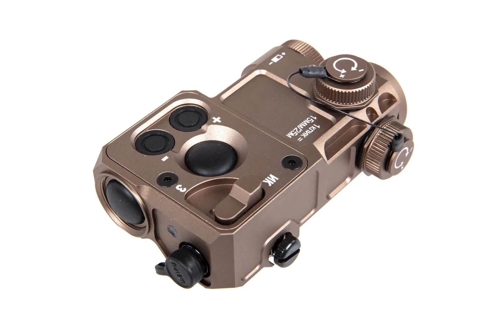 Znacznik wykonany z wytrzymałego aluminium, montowany jest na szynę Picatinny i zasilany pojedynczą baterią CR123A.