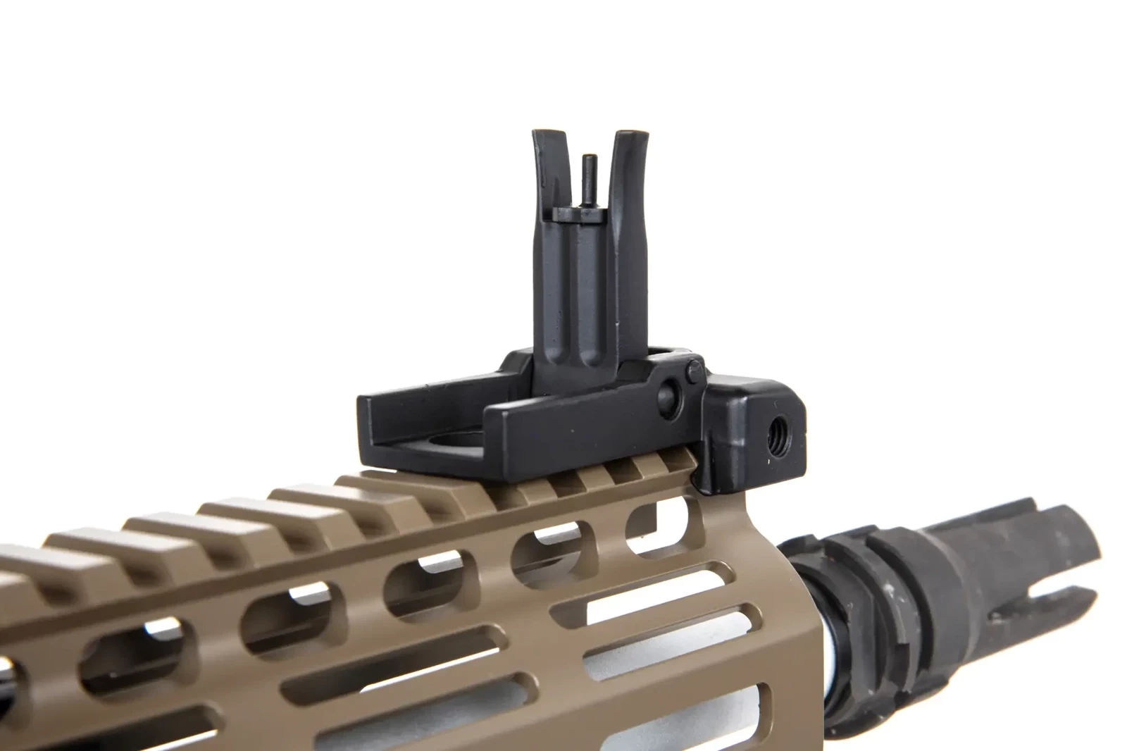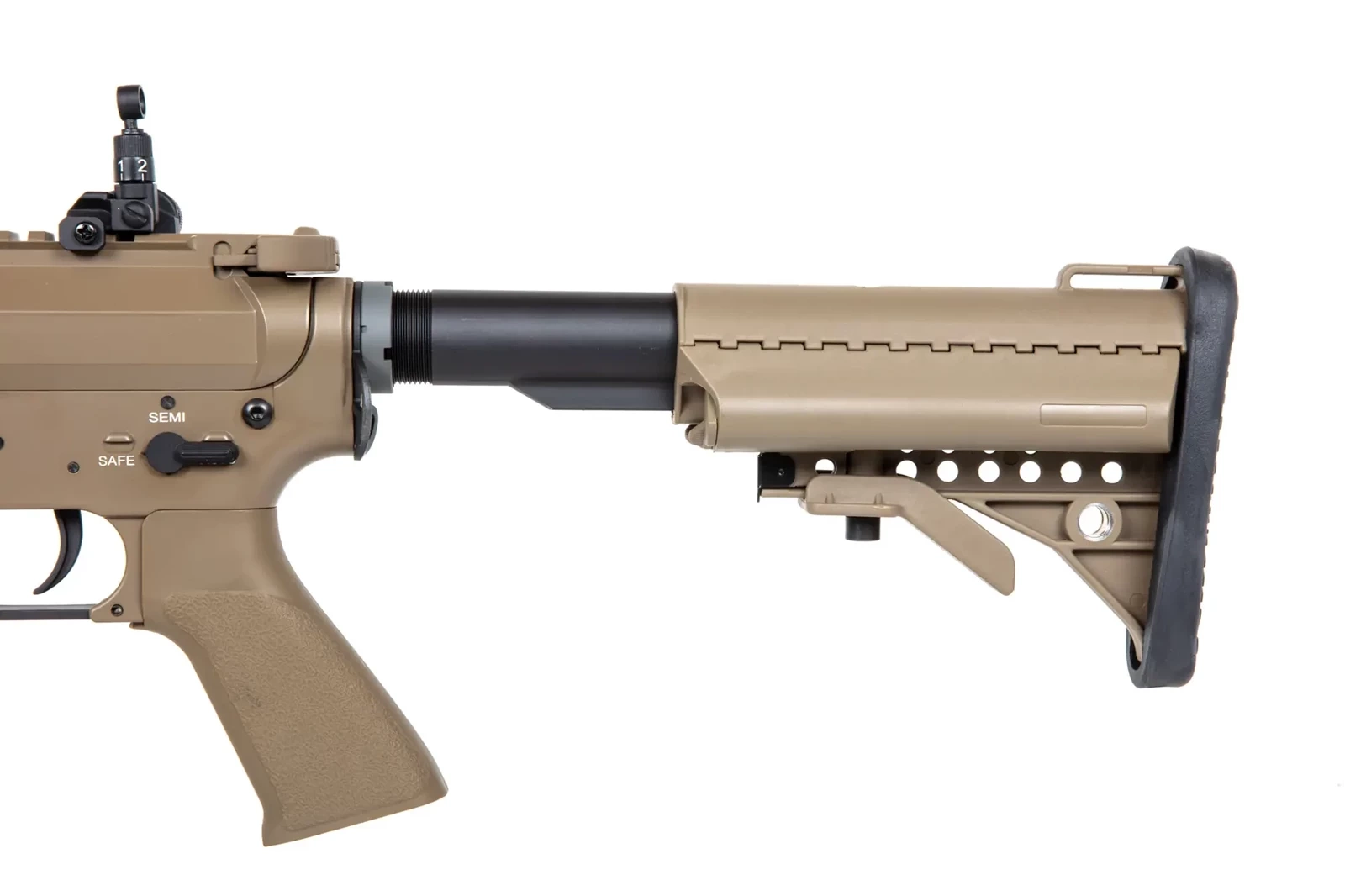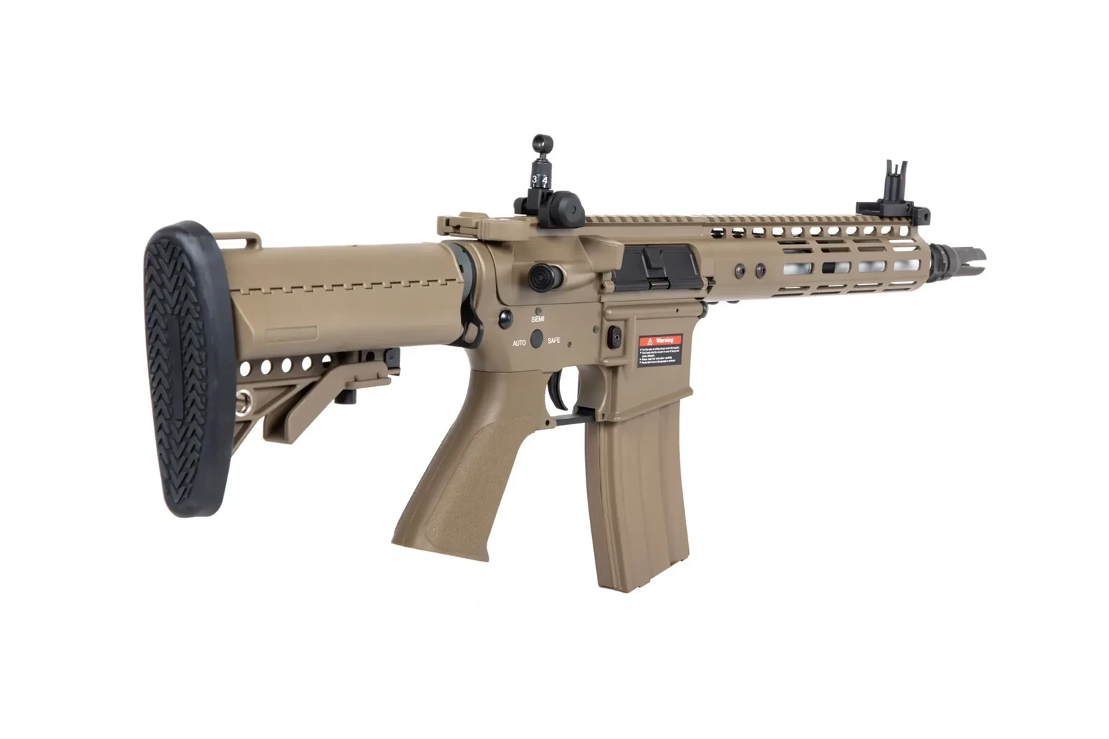 Karabinek wykonany z metalu i tworzywa sztucznego, posiada 9-calowe łoże w systemie M-LOK, mechaniczne przyrządy celownicze typu Flip-Up, stalowy tłumik płomienia, obustronną dźwignie przeładowania, działający bolt-catch oraz wygodną kolbę na prowadnicy z sześcioma pozycjami regulacji długości. Replika została wyposażona w szyny RIS, które umożliwią montaż dodatkowych akcesoriów oraz wygodny chwyt pistoletowy z antypoślizgową powierzchnią.