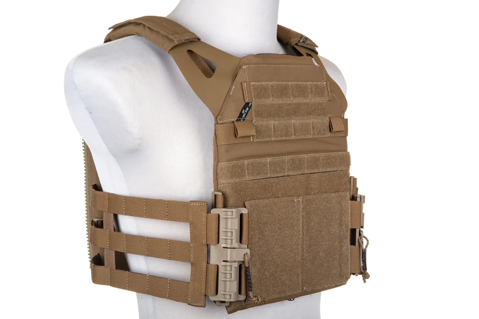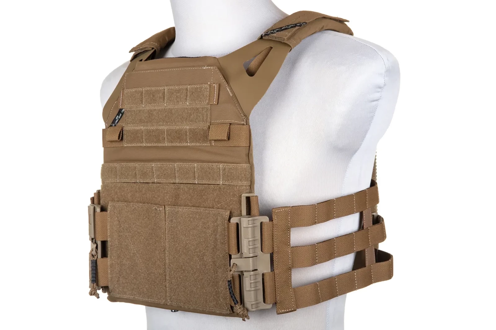 Bardzo lekka i funkcjonalna kamizelka typu plate carrier, uszyta z wytrzymałego nylonu 500D. Zbudowana z dwóch paneli - przedniego oraz tylnego, połączonych klamrami QDlekkim, szkieletowym cummerbundem, który składa się jedynie z usztywnionych taśm. Nie ma problemu aby na tych taśmach zamocować dodatkowe kieszenie modułowe.