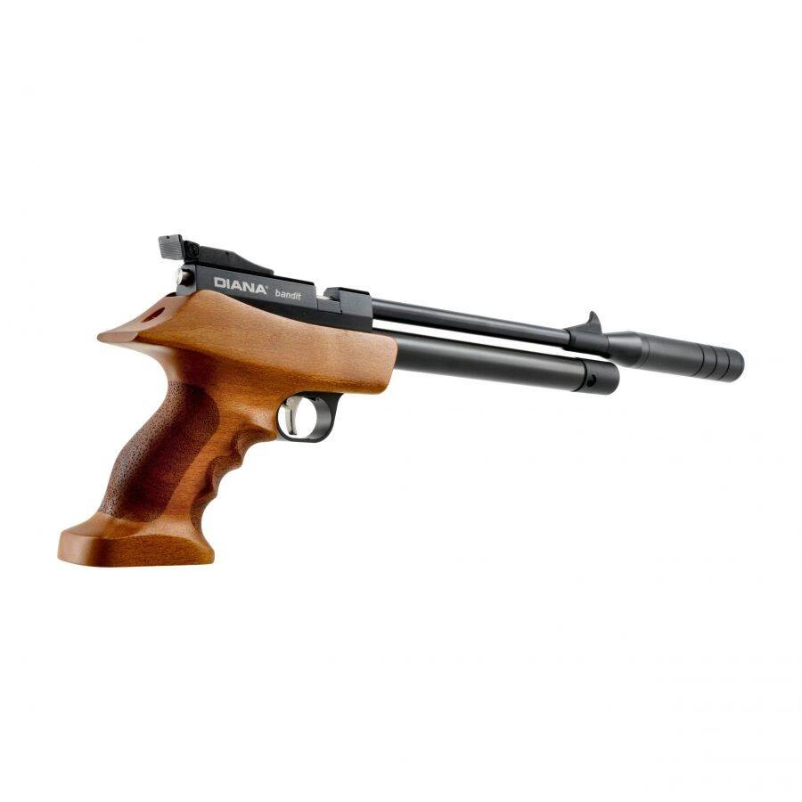 Diana PCP Bandit 4,5 mm ma klasyczną osadę z drewna bukowego, bruzdowaną stalową lufę, mechaniczne przyrządy celownicze oraz szyną 11 mm do montażu celownika optoelektronicznego. Sportowy charakter wiatrówki podkreśla ergonomiczny matchowy chwyt ze stiplingiem i wycięciami na palce. Dzięki takiej funkcjonalności wiatrówka zapewnia stabilny chwyt podczas strzelania z jednej ręki. Pistolet PCP Diana Bandit 4,5 mm zasilany jest sprężonym powietrzem magazynowanym w aluminiowym kartuszu o pojemności 50 cc, zamocowanym pod lufą. Z kartusza napełnionego do maksymalnego ciśnienia 200 Bar możemy oddać 15 strzałów o równej prędkości początkowej ok. 200 m/s. Zintegrowany manometr ułatwia odczyt ciśnienia w kartuszu, dzięki czemu szybko ocenić jakim zapasem powietrza dysponujemy. Port ładowania zabezpiecza przed zabrudzeniem obrotowa osłona z aluminium. Gazowy napęd pcp sprawia, że wiatrówka po oddaniu strzału nie generuje żadnego odrzutu, co wpływa na komfort i precyję strzelania.