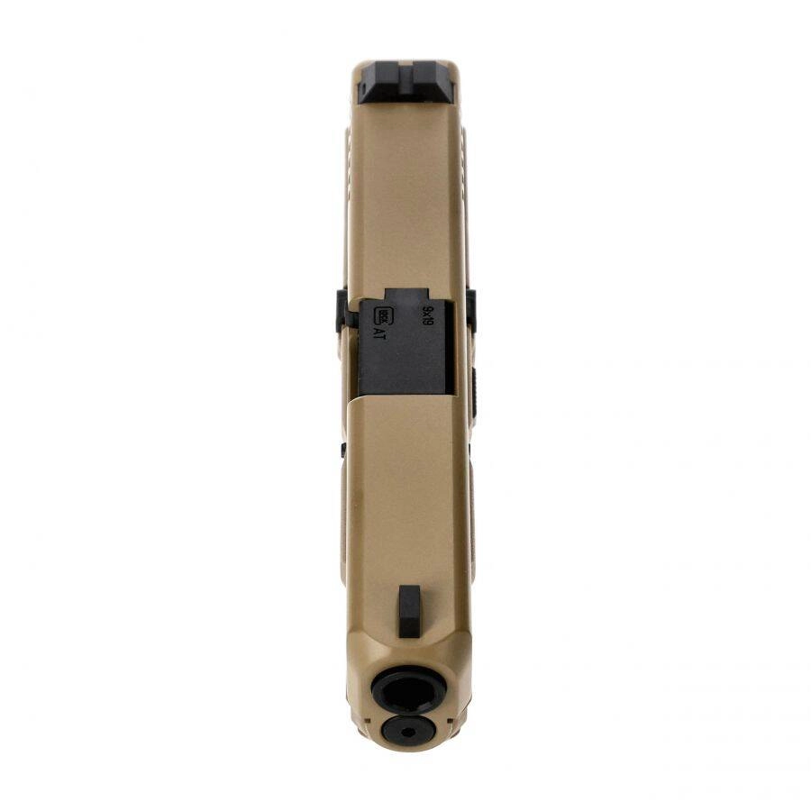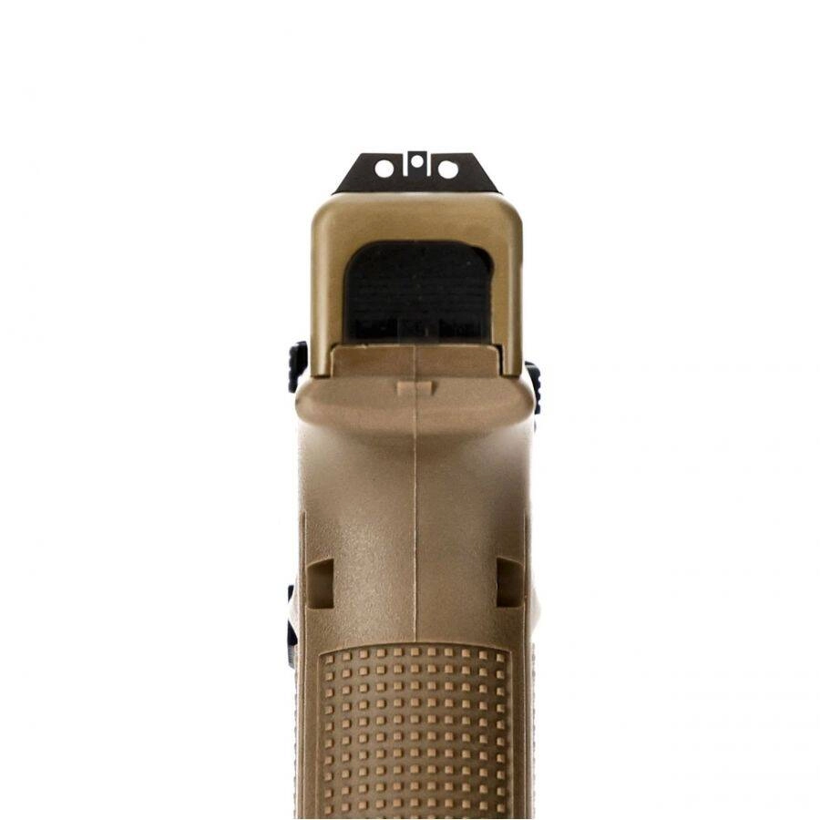 Podobnie jak w wersji bojowej, wiatrówka Glock 19X blowback 4,5 mm coyote BB CO2, ma metalowy ruchomy zamek oraz polimerowy szkielet w wojskowej kolorystyce coyote. Pistolet wyposażono w dźwignię zrzutu zamka (działa tylko z lewej strony), szynę akcesoryjną, dodatkowy bezpiecznik nastawny oraz teksturowaną rękojeść z zaczepem na smycz taktyczną.
