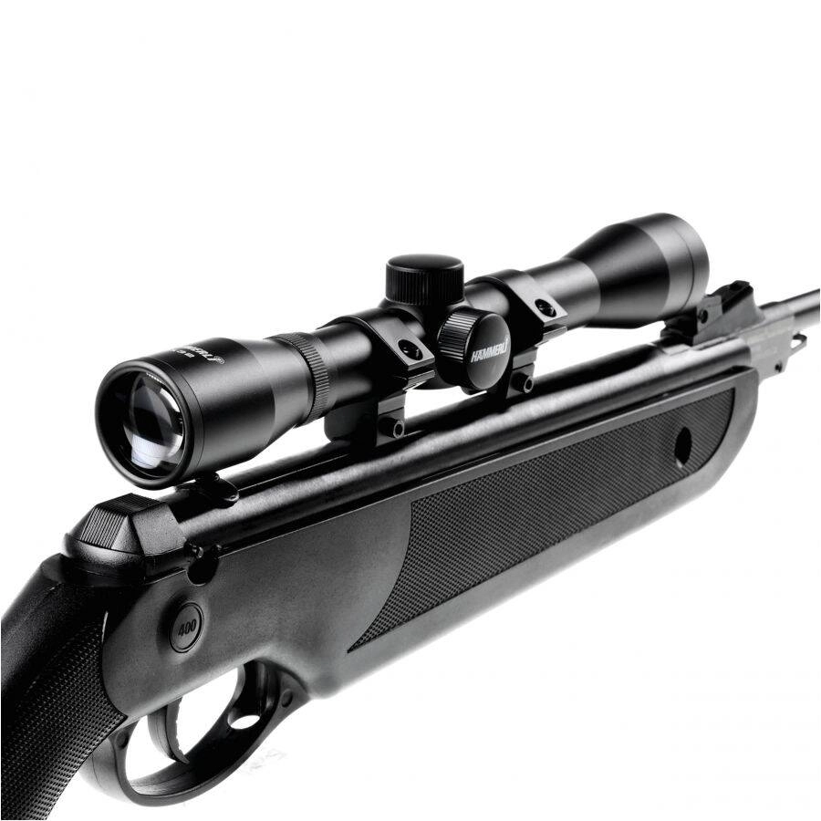 Jeśli chcemy spróbować swoich sił w strzelaniu na większym dystansie, na 11 mm szynie możemy również zamontować znajdujący się w zestawie celownik optyczny o 4× powiększeniu. W lunecie Hammerli 4×32 zastosowano popularną siatkę celowniczą Duplex 30/30.