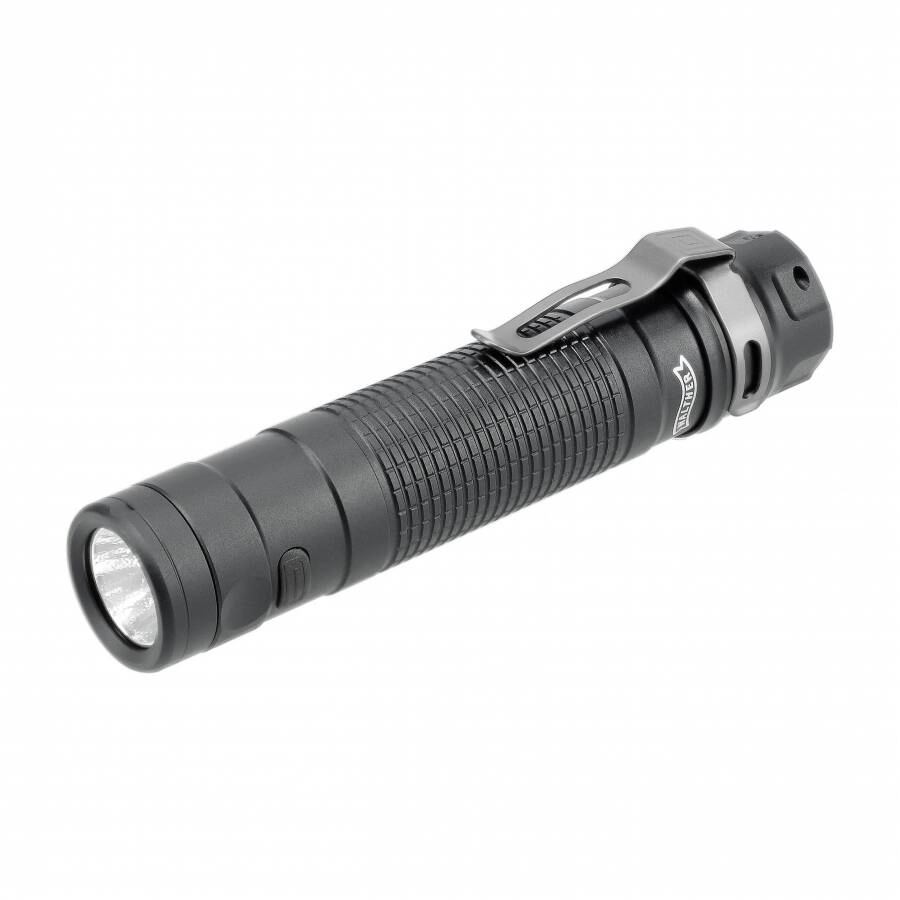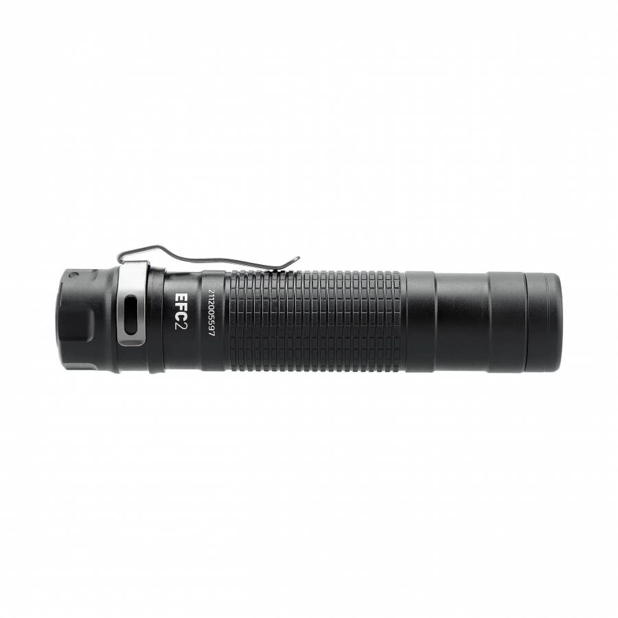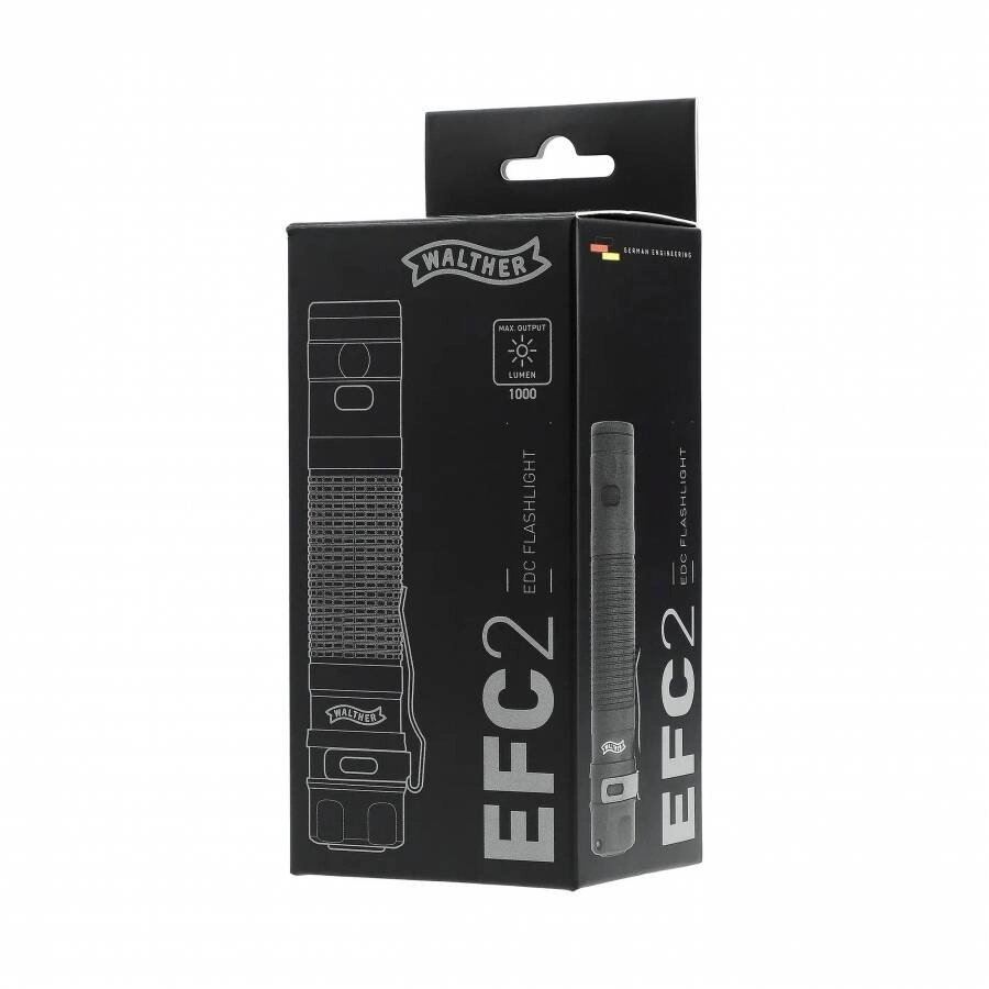 Poręczna latarka Walther EFC2 oferuje cztery poziomy jasności (5/40/350/1000 lumenów) oraz tryby stroboskopowy i beacon (lampa błyskowa). Gdy urządzenia wykorzystuje akumulator 21700, wartość strumienia świetlnego wzrasta do 1200 lumenów. Sterowanie odbywa się za pomocą tylnego włącznika, który umożliwia szybkie włączanie/wyłączanie i chwilowe światło, natomiast boczny przełącznik odpowiada za zmianę jasności i dostęp do trybów specjalnych. Lampa zapamiętuje ostatnio używany poziom jasności i uruchamia się na tym samym ustawieniu. Wbudowane ostrzeżenie informuje o spadku pojemności baterii poniżej 25%.